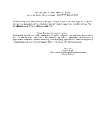 INFORMACJA O WYNIKU NABORU na wolne stanowisko urzędnicze – GŁÓWNY KSIĘGOWY Środowiskowy Dom Samopomocy w Brzegu Dolnym, ul.Rynek 18, informuje, że w wyniku zakończenia procedury naboru na stanowisko głównego księgowego została wybrana Pani Ewa Kurek, zam. Wołów, ul.Kościuszki 17G/1. Uzasadnienie dokonanego wyboru Kandydatka spełniła wszystkie wymagania formalne związane z powyższym stanowiskiem oraz złożyła komplet stosownych dokumentów zgodnie z wymogami określonymi w ogłoszeniu o konkursie. Podczas rozmowy kwalifikacyjnej wykazała się odpowiednią wiedzę i umiejętnościami, które umożliwią prawidłowe wykonanie powierzonych zadań. 09.02.2012 r. Anna Chrąchol Kierownik Środowiskowego Domu Samopomocy w Brzegu Dolnym