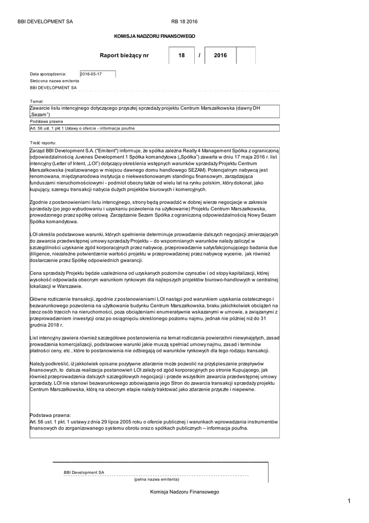 Zawarcie listu intencyjnego dotyczącego przyszłej sprzedaży projektu Centrum Marszałkowska (dawny DH