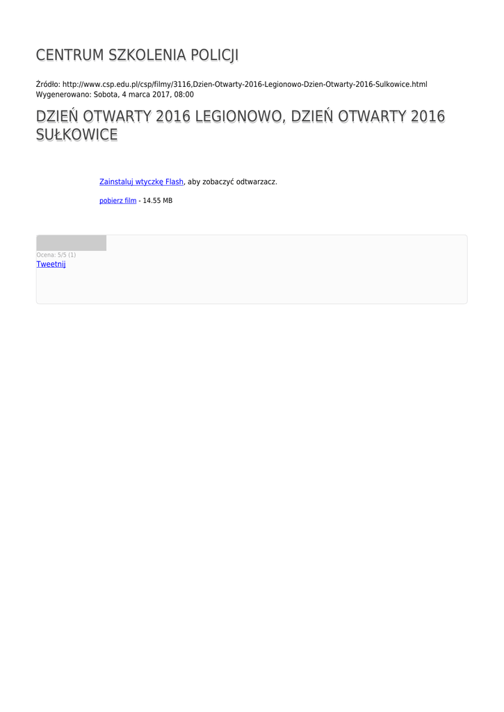 CENTRUM SZKOLENIA POLICJI Źródło: http://www.csp.edu.pl/csp/filmy/3116,Dzien-Otwarty-2016-Legionowo-Dzien-Otwarty-2016-Sulkowice.html Wygenerowano: Sobota, 4 marca 2017, 08:00 DZIEŃ OTWARTY 2016 LEGIONOWO, DZIEŃ OTWARTY 2016 SUŁKOWICE Zainstaluj wtyczkę Flash, aby zobaczyć odtwarzacz. pobierz film - 14.55 MB Ocena: 5/5 (1) Tweetnij