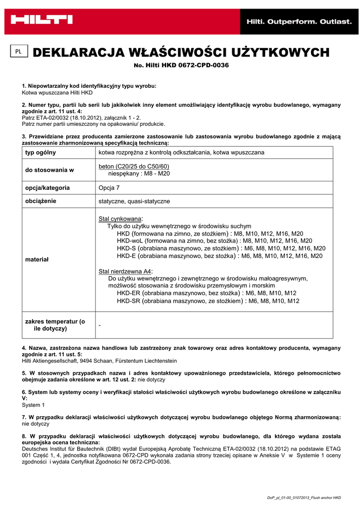 PL DEKLARACJA WŁAŚCIWOŚCI UŻYTKOWYCH No. Hilti HKD 0672-CPD-0036 1. Niepowtarzalny kod identyfikacyjny typu wyrobu: Kotwa wpuszczana Hilti HKD 2. Numer typu, partii lub serii lub jakikolwiek inny element umożliwiający identyfikację wyrobu budowlanego, wymagany zgodnie z art. 11 ust. 4: Patrz ETA-02/0032 (18.10.2012), załącznik 1 - 2. Patrz numer partii umieszczony na opakowaniu/ produkcie. 3. Przewidziane przez producenta zamierzone zastosowanie lub zastosowania wyrobu budowlanego zgodnie z mającą zastosowanie zharmonizowaną specyfikacją techniczną: typ ogólny kotwa rozprężna z kontrolą odkształcania, kotwa wpuszczana do stosowania w beton (C20/25 do C50/60) niespękany : M8 - M20 opcja/kategoria Opcja 7 obciążenie statyczne, quasi-statyczne materiał Stal cynkowana: Tylko do użytku wewnętrznego w środowisku suchym HKD (formowana na zimno, ze stożkiem ) : M8, M10, M12, M16, M20 HKD-woL (formowana na zimno, bez stożka) : M8, M10, M12, M16, M20 HKD-S (obrabiana maszynowo, ze stożkiem ) : M6, M8, M10, M12, M16, M20 HKD-E (obrabiana maszynowo, bez stożka) : M6, M8, M10, M12, M16, M20 Stal nierdzewna A4: Do użytku wewnętrznego i zewnętrznego w środowisku małoagresywnym, możliwość stosowania z środowisku przemysłowym i morskim HKD-ER (obrabiana maszynowo, bez stożka) : M6, M8, M10, M12 HKD-SR (obrabiana maszynowo, ze stożkiem ) : M6, M8, M10, M12 zakres temperatur (o ile dotyczy) - 4. Nazwa, zastrzeżona nazwa handlowa lub zastrzeżony znak towarowy oraz adres kontaktowy producenta, wymagany zgodnie z art. 11 ust. 5: Hilti Aktiengesellschaft, 9494 Schaan, Fürstentum Liechtenstein 5. W stosownych przypadkach nazwa i adres kontaktowy upoważnionego przedstawiciela, którego pełnomocnictwo obejmuje zadania określone w art. 12 ust. 2: nie dotyczy 6. System lub systemy oceny i weryfikacji stałości właściwości użytkowych wyrobu budowlanego określone w załączniku V: System 1 7. W przypadku deklaracji właściwości użytkowych dotyczącej wyrobu budowlanego objętego Normą zharmonizowaną: nie dotyczy 8. W przypadku deklaracji właściwości użytkowych dotyczącej wyrobu budowlanego, dla którego wydana została europejska ocena techniczna: Deutsches Institut für Bautechnik (DIBt) wydał Europejską Aprobatę Techniczną ETA-02/0032 (18.10.2012) na podstawie ETAG 001 Część 1, 4, jednostka notyfikowana 0672-CPD wykonała zadania strony trzeciej opisane w Aneksie V w Systemie 1 oceny zgodności i wydała Certyfikat Zgodności Nr 0672-CPD-0036. DoP_pl_01-00_01072013_Flush anchor HKD 9. Deklarowane właściwości użytkowe: Zasadnicze charakterystyki Metoda projektowania Właściwości użytkowe charakterystyczna nośność na rozciąganie ETAG 001 załącznik C, metoda A ETA-02/0032 HKD-(woL) : załącznik 9 HKD-S(R) : załącznik 8 HKD-E(R) : załącznik 8 charakterystyczna nośność na ścinanie ETAG 001 załącznik C, metoda A ETA-02/0032 HKD-(woL) : załącznik 12 HKD-S(R) : załącznik 11 HKD-E(R) : załącznik 11 minimalny rozstaw i minimalna odległość od krawędzi przemieszczenie w kontekście stanu granicznego użytkowania Zharmonizowana specyfikacja techniczna ETAG 001 Część 1, 4 ETAG 001 załącznik C, metoda A ETA-02/0032 HKD-(woL). : załącznik 7 HKD-S(R) : załącznik 7 HKD-E(R) : załącznik 7 ETAG 001 załącznik C, metoda A ETA-02/0032 HKD-(woL) : załącznik 10, 13 HKD-S(R) : załącznik 10, 13 HKD-E(R) : załącznik 10, 13 10. Właściwości użytkowe wyrobu określone w pkt 1 i 2 są zgodne z właściwościami użytkowymi deklarowanymi w pkt 9. Niniejsza deklaracja właściwości użytkowych wydana zostaje na wyłączną odpowiedzialność producenta określonego w pkt 4. W imieniu producenta podpisał: Raimund Zaggl Kierownik Działu Dział Techniki Kotwienia Seppo Perämäki Kierownik Działu Jakości Dział Techniki Kotwienia Hilti Aktiengesellschaft Schaan, lipiec 2013 DoP_pl_01-00_01072013_Flush anchor HKD PL DEKLARACJA WŁAŚCIWOŚCI UŻYTKOWYCH No. Hilti HKD 0672-CPD-0137 1. Niepowtarzalny kod identyfikacyjny typu wyrobu: Kotwa wpuszczana Hilti HKD 2. Numer typu, partii lub serii lub jakikolwiek inny element umożliwiający identyfikację wyrobu budowlanego, wymagany zgodnie z art. 11 ust. 4: Patrz ETA-06/0047 (28.09.2012), załącznik 1 - 2. Patrz numer partii umieszczony na opakowaniu/ produkcie. 3. Przewidziane przez producenta zamierzone zastosowanie lub zastosowania wyrobu budowlanego zgodnie z mającą zastosowanie zharmonizowaną specyfikacją techniczną: typ ogólny do stosowania w kotwa wpuszczana, kotwa rozprężna z kontrolą odkształcania, do wielokrotnego użytku w zastosowaniach niekonstrukcyjnych beton (C20/25 do C50/60) spękany : (M6 - M16) niespękany : (M6 - M16) płyty kanałowe sprężone tylko M6x25, M8x25, M10x25 opcja/kategoria ETAG 001-6 Klasa odporności ogniowej A1 obciążenie statyczne, quasi-statyczne, ognioodporność materiał Stal cynkowana: Tylko do użytku wewnętrznego w środowisku suchym HKD (formowana na zimno, ze stożkiem ) : M6, M8, M10, M12, M16 HKD-woL (formowana na zimno, bez stożka) : M6, M8, M10, M12, M16 HKD-S (obrabiana maszynowo, ze stożkiem ) : M6, M8, M10, M12 HKD-E (obrabiana maszynowo, bez stożka) : M6, M8, M10, M12 Stal nierdzewna A4: Do użytku wewnętrznego i zewnętrznego w środowisku małoagresywnym, możliwość stosowania z środowisku przemysłowym i morskim HKD-ER (obrabiana maszynowo, bez stożka) : M6, M8, M10, M12 HKD-SR (obrabiana maszynowo, ze stożkiem ) : M6, M8, M10, M12 zakres temperatur (o ile dotyczy) - 4. Nazwa, zastrzeżona nazwa handlowa lub zastrzeżony znak towarowy oraz adres kontaktowy producenta, wymagany zgodnie z art. 11 ust. 5: Hilti Aktiengesellschaft, 9494 Schaan, Fürstentum Liechtenstein 5. W stosownych przypadkach nazwa i adres kontaktowy upoważnionego przedstawiciela, którego pełnomocnictwo obejmuje zadania określone w art. 12 ust. 2: nie dotyczy 6. System lub systemy oceny i weryfikacji stałości właściwości 