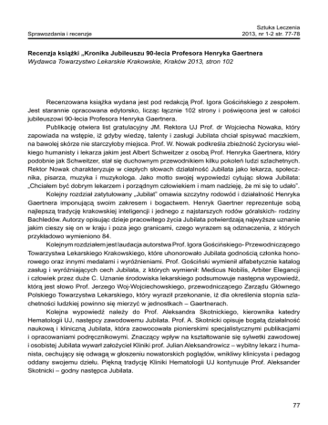 Sprawozdania i recenzje Sztuka Leczenia 2013, nr 1-2 str. 77-78 Recenzja książki „Kronika Jubileuszu 90-lecia Profesora Henryka Gaertnera Wydawca Towarzystwo Lekarskie Krakowskie, Kraków 2013, stron 102 Recenzowana książka wydana jest pod redakcją Prof. Igora Gościńskiego z zespołem. Jest starannie opracowana edytorsko, licząc łącznie 102 strony i poświęcona jest w całości jubileuszowi 90-lecia Profesora Henryka Gaertnera. Publikację otwiera list gratulacyjny JM. Rektora UJ Prof. dr Wojciecha Nowaka, który zapowiada na wstępie, iż gdyby wiedzę, talenty i zasługi Jubilata chciał spisywać maczkiem, na bawolej skórze nie starczyłoby miejsca. Prof. W. Nowak podkreśla zbieżność życiorysu wielkiego humanisty i lekarza jakim jest Albert Schweitzer z osobą Prof. Henryka Gaertnera, który podobnie jak Schweitzer, stał się duchownym przewodnikiem kilku pokoleń ludzi szlachetnych. Rektor Nowak charakteryzuje w ciepłych słowach działalność Jubilata jako lekarza, społecznika, pisarza, muzyka i muzykologa. Jako motto swojej wypowiedzi cytując słowa Jubilata: „Chciałem być dobrym lekarzem i porządnym człowiekiem i mam nadzieję, że mi się to udało”. Kolejny rozdział zatytułowany „Jubilat” omawia szczytny rodowód i działalność Henryka Gaertnera imponującą swoim zakresem i bogactwem. Henryk Gaertner reprezentuje sobą najlepszą tradycję krakowskiej inteligencji i jednego z najstarszych rodów góralskich- rodziny Bachledów. Autorzy opisując dzieje pracowitego życia Jubilata potwierdzają najwyższe uznanie jakim cieszy się on w kraju i poza jego granicami, czego wyrazem są odznaczenia, z których przykładowo wymieniono 84. Kolejnym rozdziałem jest laudacja autorstwa Prof. Igora Gościńskiego- Przewodniczącego Towarzystwa Lekarskiego Krakowskiego, które uhonorowało Jubilata godnością członka honorowego oraz innymi medalami i wyróżnieniami. Prof. Gościński wymienił alfabetycznie katalog zasług i wyróżniających cech Jubilata, z których wymienił: Medicus Nobilis, Arbiter Elegancji i człowiek przez duże C. Uznanie środowiska lekarskiego podsumowuje następna wypowiedź, którą jest słowo Prof. Jerzego Woj-Wojciechowskiego, przewodniczącego Zarządu Głównego Polskiego Towarzystwa Lekarskiego, który wyraził przekonanie, iż dla określenia stopnia szlachetności ludzkiej powinno się mierzyć w jednostkach – Gaertnerach. Kolejna wypowiedź należy do Prof. Aleksandra Skotnickiego, kierownika katedry Hematologii UJ, następcy zawodowemu Jubilata. Prof. A. Skotnicki opisuje bogatą działalność naukową i kliniczną Jubilata, która zaowocowała pionierskimi specjalistycznymi publikacjami i opracowaniami podręcznikowymi. Znaczący wpływ na kształtowanie się sylwetki zawodowej i osobistej Jubilata wywarł założyciel Kliniki prof. Julian Aleksandrowicz – wybitny lekarz i humanista, cechujący się odwagą w głoszeniu nowatorskich poglądów, wnikliwy klinicysta i pedagog oddany swojemu dziełu. Piękną tradycję Kliniki Hematologii UJ kontynuuje Prof. Aleksander Skotnicki – godny następca Jubilata. 77 Sprawozdania i recenzje Charakterystykę Prof. Henryka Gaertnera jako humanisty omawia Prof. Zdzisław GajdaKierownik Katedry Historii Medycyny UJ. Kreśląc sylwetkę Jubilata jako humanisty i historyka Prof. Gajda podkreśla, iż jest on uczniem wybitnego humanisty i lekarza – Prof. Juliana Aleksandrowicza i cechuje Go bogactwo zainteresowań, począwszy od medycyny indyjskiej na muzykologii kończąc. Henryk Gaertner jest autorem szeregu wartościowych pozycji naukowych z zakresu historii medycyny, literatury pięknej, filozofii i muzykologii. Będąc bardzo aktywnym człowiekiem, poprzez udział w licznych stowarzyszeniach, w tym Polskim Towarzystwie Schweitzerowskim którego jest założycielem, wywarł wielki wpływ na polską kulturę i życie intelektualne. Kolejny rozdział to wypowiedź Andrzeja Kosiniaka-Kamysza dyrektora Szpitala im. J. Dietla w Krakowie, wieloletniego Ministra Zdrowia RP, który jak podkreśla jest zauroczony osobowością Jubilata, erudyty, człowieka wielkiej wiedzy, społecznika, a jednocześnie ciepłego, skromnego człowieka przyjaznego ludziom. Jak pisze dyrektor Kosiniak-Kamysz, zawdzięcza Jubilatowi nie tylko wiedzę lekarską, ale również umiejętność poruszania się w życiu społecznym, politycznym i codziennym. W słowie od Jubilata, Prof. Henryk Gaertner wspomina swoich wybitnych nauczycieli zarówno w kraju jak i poza naszym krajem. Dzięki dwukrotnemu stypendium Rockefellera oraz osobistym kontaktom z Richardem Mayerem i innymi wybitnymi naukowcami zagranicznymi, Henryk Gaertner miał kontakt z czołowymi uczonymi swojego okresu. Wzbogacenie duchowe zawdzięcza również pogłębianiu studiów muzycznych i wiedzy muzykologicznej, jak i bliskiej współpracy z zakonem bonifratrów, które zaowocowało honorowym członkostwem zakonu i jego złotym medalem. W liczącym ponad 50 stron aneksie, zamieszczono dane szczegółowe dotyczące dorobku Jubilata, bogatą dokumentację zdjęciową dotyczącą organizowanego w Krakowie jubileuszu 90-lecia Henryka Gaertnera, wręczonych odznak i dyplomów. Uroczystości jubileuszowe zorganizowano w siedzibie Towarzystwa Lekarskiego Krakowskiego zaprojektowanej i wykonanej przez członka honorowego TLK – Stanisława Wyspiańskiego. Miejsce uroczystości jubileuszowej i sposób jej przeprowadzenia w pełni oddaje charakterystykę prof. Henryka Gaertnera, dorobek wybitnej postaci jaką jest wieloletni przewodniczący rady naukowej czasopisma „Sztuka Leczenia”, człowiek wielkiego formatu i wielkiego serca. prof. Bohdan Wasilewski - Warszawa 78