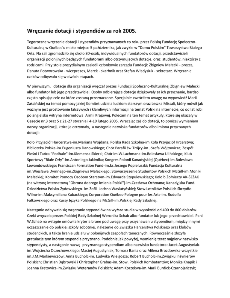 Wręczanie dotacji i stypendiów za rok 2005. Tegoroczne wręczenie dotacji i stypendiów przyznawanych co roku przez Polską Fundację SpołecznoKulturalną w Québec'u miało miejsce 5 października, jak zwykle w "Domu Polskim" Towarzystwa Białego Orła. Na sali zgromadziło się około 80-osób, indywidualnych fundatorów dotacji, przedstawicieli organizacji polonijnych będących fundatorami albo otrzymujących dotacje, oraz studentów, niektórzy z rodzicami. Przy stole prezydialnym zasiedli członkowie zarządu Fundacji: Zbigniew Małecki - prezes, Danuta Potworowska - wiceprezes, Marek - skarbnik oraz Stefan Władysiuk - sekretarz. Wręczanie czeków odbywało się w dwóch etapach. W pierwszym, dotacje dla organizacji wręczał prezes Fundacji Społeczno-Kulturalnej Zbigniew Małecki albo fundator lub jego przedstawiciel. Osoby odbierające dotacje dziękowały za ich przyznanie, bardzo często opisując cele na które zostaną przeznaczone. Specjalnie zwróciłem uwagę na wypowiedź Marii Zaścińskiej na temat pomocy jakiej Komitet udziela ludziom starszym oraz Leszka Missali, który mówił jak ważnym jest prostowanie fałszywych i kłamliwych informacji na temat Polski na internecie, co od lat robi po angielsku witryna internetowa Armii Krajowej. Polecam na ten temat artykuły, które się ukazały w Gazecie nr.3 oraz 5 z 21-27 stycznia i 4-10 lutego 2005. Wracając zaś do dotacji, to poniżej wymieniam nazwy organizacji, które je otrzymały, a następnie nazwiska fundatorów albo imiona przyznanych dotacji: Koło Przyjaciół Harcerstwa-im.Mariana Wojdana; Polska Rada Szkolna-im.Koła Przyjaciół Hrcerstwa; Biblioteka Polska-im.Eugeniusza Danowskiego; Chór Parafii św.Trójcy-im.Józefa Wójtowicza; Zespół Pieśni i Tańca "Podhale"-im.Klemensa Skierki; Chór im.W.Lachmana-im.Bolesława Ulińskiego; Klub Sportowy "Białe Orły"-im.Antoniego Jakimika; Kongres Polonii Kanadyjskiej (Québec)-im.Bolesława Lewandowskiego; Franciscan Formation Fund-im.ks.Jerzego Popiełuszki; Fundacja Kulturalna im.Wiesława Dymnego-im.Zbigniewa Małeckiego; Stowarzyszenie Studentów Polskich McGill-im.Moniki Małeckiej; Komitet Pomocy Osobom Starszym-im.Edwarda Szypulewskiego; Koło b.Żołnierzy AK-ŚZŻAK (na witrynę internetową "Obrona dobrego imienia Polski")-im.Czesława Ochmana; Kanadyjska Fund. Dziedzictwa Polsko-Żydowskiego- im.Zofii Lechno Wasiutyńskiej; Stow.Lotników Polskich Skrzydło Wilno-im.Maksymiliana Kubackiego; Corporation Québec-Pologne pour les Arts-im. Rudolfa Falkowskiego oraz Kursy Języka Polskiego na McGill-im.Polskiej Rady Szkolnej. Następnie odbywało się wręczanie stypendiów na wyższe studia w wysokości od 400 do 800 dolarów. Czeki wręczała prezes Polskiej Rady Szkolnej Weronika Schab albo fundator lub jego przedstawiciel. Pani W.Schab na wstępie omówiła kryteria brane pod uwagę przy przyznawaniu stypendium, między innymi uczęszczanie do polskiej szkoły sobotniej, należenie do Związku Harcerstwa Polskiego oraz klubów studenckich, a także branie udziału w polonijnych zespołach tanecznych. Równocześnie złożyła gratulacje tym którym stypendia przyznano. Podobnie jak powyżej, wymienię teraz najpierw nazwisko stypendysty, a następnie nazwę przyznanego stypendium albo nazwisko fundatora: Jacek Augustyniakim.Wojciecha Oczechowskiego; Maciej Augustyniak, Tomasz Bania oraz Milena Brozdowska-wszystkie im.J.M.Markiewiczów; Anna Bucholc-im. Ludwika Wielgosza; Robert Bucholc-im.Związku Inżynierów Polskich; Christian Dąbrowski i Christopher Grabas-im. Stow. Polskich Kombatantów; Monika Knapik i Joanna Kretowicz-im.Związku Weteranów Polskich; Adam Korzekwa-im.Marii Burdick-Czarnojańczyk; Georges Kubicki-im.Jana Zaścińskiego; Agnieszka Kwiatkowska, Dorota Mędrzycka oraz Dominik Pogorzelski-im.Franciszka Moskala; Aleksandra Sobol-im.Srebrnego Jubileuszu Fundacji; Barbara Szymula-im.Ligii Ofrecht; Katarzyna Wiśniewska-im.Stanisława Ofrechta i na zakończenie stypendium otrzymała Katarzyna Studzińska. Obecni na sali stypendyści, odbierając czeki dziękowali w bardzo dobrym polskim języku. Radowało się serce, że tutaj urodzone pokolenie tak dobrze mówi w języku rodziców. Oczywiście jest to zasługa polskich szkół sobotnich ale tak samo rodziców. Wiem z własnego doświadczenia, że naleganie na używanie w domu języka polskiego daje doskonałe rezultaty. Nasz syn mieszkający od lat w Ontario, w rozmowach telefonicznych i w czasie wizyt, rozmawia z żoną oraz ze mną, tylko po polsku, z czego jesteśmy bardzo dumni! Wracając do tegorocznych stypendystów, to bardzo mi zaimponował jeden, który dziękując powiedział "że ma nadzieję po studiach oddać Fundacji, więcej niż to co otrzymał, aby mogła kontynuować swoją niezmiernie ważną pracę". Od siebie jescze dodam, że w tym roku przyznano 2-stypendia imienia Związku Weteranów Polskich im.marsz.Józefa Piłsudskiego, które wręczyła Władysława Rolicz. Na przyszły rok tych stypendiów będzie pięć, ponieważ przed kilku dniami Związek Weteranów Polski z okazji swojego 75-lecia przekazał Fundacji Społeczno-Kulturalnej dalsze 30-tysięcy dolarów na ten cel. Na zakończenie parę słów o organizatorce omawianego spotkania, Polskiej Fundacji SpołecznoKulturalnej w Quebecu, która w ubiegłym roku obchodziła swój 25-ty Jubileusz (Gazeta nr.94 z 14-16 maja 2004). Piszę krótko, a zainteresowanych pełnymi informacjami odsyłam do wydanej broszury jubileuszowej. Polska Fundacja Społeczno-Kulturalna w Quebecu jest niewątpliwie jedną z najbardziej cenionych organizacji polonijnych w Montrealu. Nie ma w tym stwierdzeniu nic nowego, bo wszyscy znają jej działalność i zasługi ale warto o tym od czasu do czasu przypominać. Celem przyznawanych przez Fundacje dotacji jest wspieranie działalności kulturalnej oraz oświatowej obejmujące naukę, sztukę, a przedewszystkim wychowanie młodzieży w duchu polskości. W tej działalności na