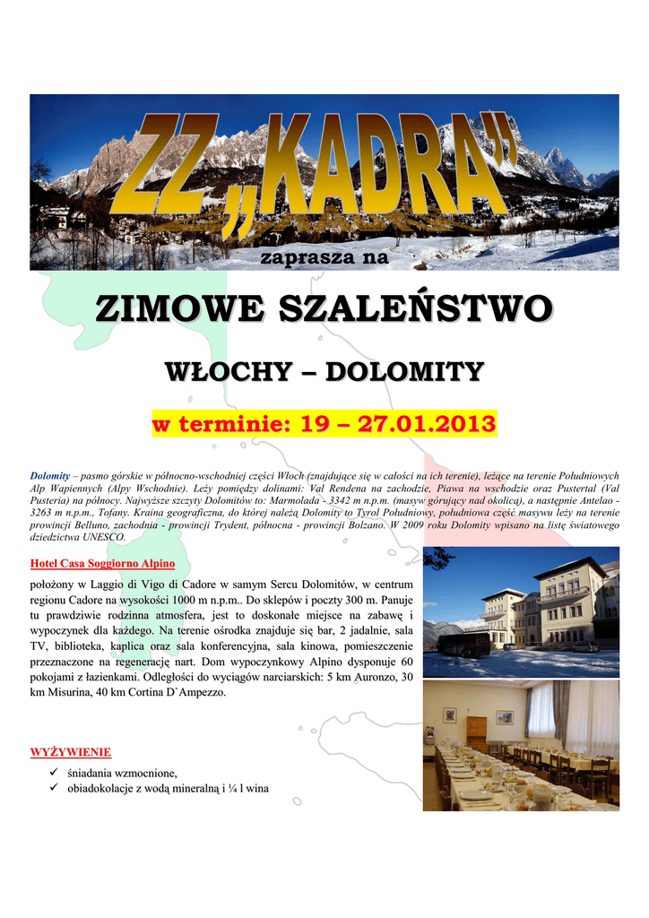zaprasza na ZIMOWE SZALEŃSTWO WŁOCHY – DOLOMITY w terminie: 19 – 27.01.2013 Dolomity – pasmo górskie w północno-wschodniej części Włoch (znajdujące się w całości na ich terenie), leżące na terenie Południowych Alp Wapiennych (Alpy Wschodnie). Leży pomiędzy dolinami: Val Rendena na zachodzie, Piawa na wschodzie oraz Pustertal (Val Pusteria) na północy. Najwyższe szczyty Dolomitów to: Marmolada - 3342 m n.p.m. (masyw górujący nad okolicą), a następnie Antelao 3263 m n.p.m., Tofany. Kraina geograficzna, do której należą Dolomity to Tyrol Południowy, południowa część masywu leży na terenie prowincji Belluno, zachodnia - prowincji Trydent, północna - prowincji Bolzano. W 2009 roku Dolomity wpisano na listę światowego dziedzictwa UNESCO. Hotel Casa Soggiorno Alpino położony w Laggio di Vigo di Cadore w samym Sercu Dolomitów, w centrum regionu Cadore na wysokości 1000 m n.p.m.. Do sklepów i poczty 300 m. Panuje tu prawdziwie rodzinna atmosfera, jest to doskonałe miejsce na zabawę i wypoczynek dla każdego. Na terenie ośrodka znajduje się bar, 2 jadalnie, sala TV, biblioteka, kaplica oraz sala konferencyjna, sala kinowa, pomieszczenie przeznaczone na regenerację nart. Dom wypoczynkowy Alpino dysponuje 60 pokojami z łazienkami. Odległości do wyciągów narciarskich: 5 km Auronzo, 30 km Misurina, 40 km Cortina D`Ampezzo. WYŻYWIENIE śniadania wzmocnione, obiadokolacje z wodą mineralną i ¼ l wina CENA OBEJMUJE: wyżywienie HB: śniadania wzmocnione + obiadokolacje z wodą mineralną i ¼ l wina, zakwaterowanie - 6 noclegów w pokojach 2, 3, 4 os., ubezpieczenie NW, KL, bagaż - SKI (AXA TUiR S.A., O/Katowice, ul. Chorzowska 50/1), licencjonowany pilot - rezydent, dowóz na stoki i ze stoków, transport autokarem LUX w obie strony (klimatyzacja, bar, video, WC), podatek VAT. DODATKOWO PŁATNE: SKIPASS – płatny na miejscu w euro (zapisy na listę grupową w biurze ZZ KADRA): GRUPOWY OSOBISTY normalny – 168 €, normalny – 206 €, junior (ur. po 01.12.1996) – 118 €, junior (ur. po 01.12.1996) – 144 €, UWAGA!!! obowiązkowo kask do lat 14, zalecamy również posiadanie Europejskiej Karty Ubezpieczenia Zdrowotnego EKUZ (wydawanej bezpłatnie w oddziałach wojewódzkich NFZ). RAMOWY PROGRAM IMPREZY: Dzień 1 wyjazd z Brzeszcz o godz. 21:00, Dzień 2 przyjazd ok. 14:00, odpoczynek, spacer po okolicy, 19:00 kolacja, spotkanie organizacyjne, rozdanie skipassów, Dzień 3 7:30 śniadanie, 8:10 wyjazd na stok, 9:15 – 16:00 San Vito di Cadore, 19:00 kolacja, D ni 4–7 7:30 śniadanie, 8:10 wyjazd na stok, 9:15 – 16:00 Cortina D’Ampezzo, 19:00 kolacja, Dzień 8 7:30 śniadanie, 8:40 wyjazd na stok, 9:00 – 16:00 Auronzo. Wyjazd do kraju 20:00 (pokoje dostępne do 20:00!) Dzień 9 przyjazd do Polski ok. godz. 12:00. Zapisy na wycieczkę w biurze związku: koszt imprezy dla członków związku i ich rodzin koszt imprezy dla pozostałych pracowników – 1 380,00 zł/os., – 1 500,00 zł/os. Warunki rezerwacji: 300 zł/os. do 14.09.2012 (ew. 100 zł/os. wrzesień, 200 zł/os. październik), 300 zł/os. do 14.11.2012, rozliczenie do 19.12.2012.