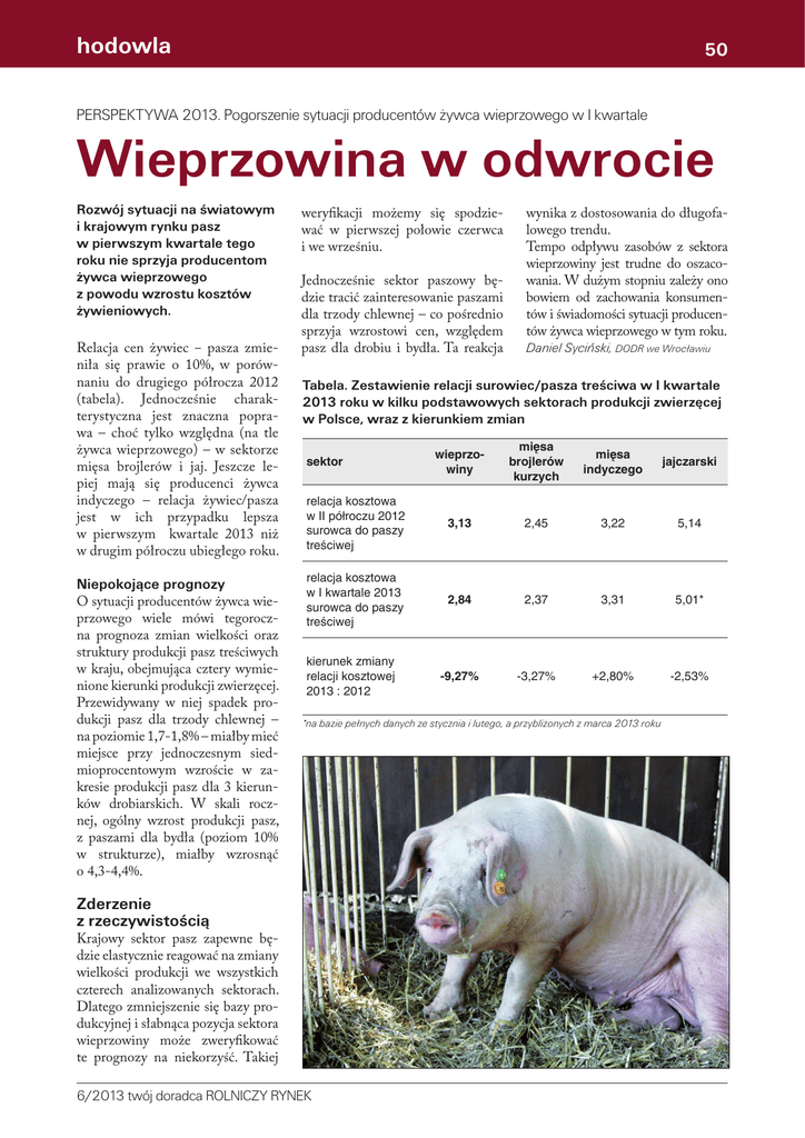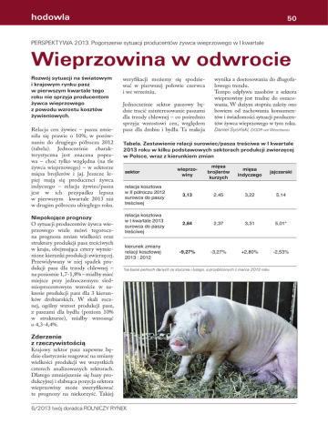 aktualności hodowla 50 PERSPEKTYWA 2013. Pogorszenie sytuacji producentów żywca wieprzowego w I kwartale Wieprzowina w odwrocie Rozwój sytuacji na światowym i krajowym rynku pasz w pierwszym kwartale tego roku nie sprzyja producentom żywca wieprzowego z powodu wzrostu kosztów żywieniowych. Relacja cen żywiec ‒ pasza zmieniła się prawie o 10%, w porównaniu do drugiego półrocza 2012 (tabela). Jednocześnie charakterystyczna jest znaczna poprawa – choć tylko względna (na tle żywca wieprzowego) – w sektorze mięsa brojlerów i jaj. Jeszcze lepiej mają się producenci żywca indyczego – relacja żywiec/pasza jest w ich przypadku lepsza w pierwszym kwartale 2013 niż w drugim półroczu ubiegłego roku. Niepokojące prognozy O sytuacji producentów żywca wieprzowego wiele mówi tegoroczna prognoza zmian wielkości oraz struktury produkcji pasz treściwych w kraju, obejmująca cztery wymienione kierunki produkcji zwierzęcej. Przewidywany w niej spadek produkcji pasz dla trzody chlewnej – na poziomie 1,7-1,8% – miałby mieć miejsce przy jednoczesnym siedmioprocentowym wzroście w zakresie produkcji pasz dla 3 kierunków drobiarskich. W skali rocznej, ogólny wzrost produkcji pasz, z paszami dla bydła (poziom 10% w strukturze), miałby wzrosnąć o 4,3-4,4%. weryfikacji możemy się spodziewać w pierwszej połowie czerwca i we wrześniu. Jednocześnie sektor paszowy będzie tracić zainteresowanie paszami dla trzody chlewnej – co pośrednio sprzyja wzrostowi cen, względem pasz dla drobiu i bydła. Ta reakcja wynika z dostosowania do długofalowego trendu. Tempo odpływu zasobów z sektora wieprzowiny jest trudne do oszacowania. W dużym stopniu zależy ono bowiem od zachowania konsumentów i świadomości sytuacji producentów żywca wieprzowego w tym roku. Daniel Syciński, DODR we Wrocławiu Tabela. Zestawienie relacji surowiec/pasza treściwa w I kwartale 2013 roku w kilku podstawowych sektorach produkcji zwierzęcej w Polsce, wraz z kierunkiem zmian wieprzowiny PLÔVD brojlerów kurzych PLÔVD indyczego MDMF]DUVNL relacja kosztowa Z,,S´êURF]X VXURZFDGRSDV]\ WUHþFLZHM 3,13 relacja kosztowa Z,NZDUWDOH VXURZFDGRSDV]\ WUHþFLZHM 2,84 -9,27% sektor NLHUXQHN]PLDQ\ UHODFMLNRV]WRZHM *na bazie pełnych danych ze stycznia i lutego, a przybliżonych z marca 2013 roku Zderzenie z rzeczywistością Krajowy sektor pasz zapewne będzie elastycznie reagować na zmiany wielkości produkcji we wszystkich czterech analizowanych sektorach. Dlatego zmniejszenie się bazy produkcyjnej i słabnąca pozycja sektora wieprzowiny może zweryfikować te prognozy na niekorzyść. Takiej 6/2013 twój doradca ROLNICZY RYNEK