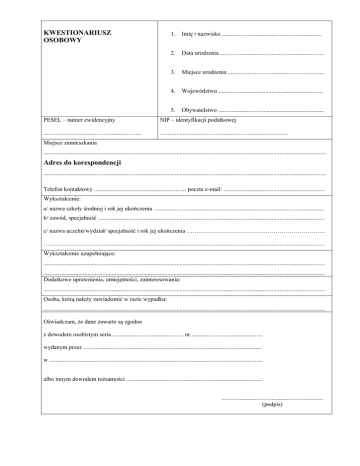 KWESTIONARIUSZ OSOBOWY 1. Imię i nazwisko .................................................................. 2. Data urodzenia ..................................................................... 3. Miejsce urodzenia ................................................................ 4. Województwo ..................................................................... 5. Obywatelstwo ...................................................................... PESEL – numer ewidencyjny NIP – identyfikacji podatkowej ................................................................. ..................................................................................... Miejsce zamieszkania ........................................................................................................................................................................................... Adres do korespondencji ........................................................................................................................................................................................... Telefon kontaktowy ............................................................. poczta e-mail: ................................................................... Wykształcenie: a/ nazwa szkoły średniej i rok jej ukończenia ................................................................................................................. b/ zawód, specjalność ...................................................................................................................................................... c/ nazwa uczelni/wydział/ specjalność i rok jej ukończenia …………………………………………………………… ………………………...................................................................................................................................................... Wykształcenie uzupełniające: .......................................................................................................................................................................................... .......................................................................................................................................................................................... Dodatkowe uprawnienia, umiejętności, zainteresowania: .......................................................................................................................................................................................... Osoba, którą należy zawiadomić w razie wypadku: .......................................................................................................................................................................................... Oświadczam, że dane zawarte są zgodne z dowodem osobistym seria ............................................... nr................................................ wydanym przez ...................................................................................................................... w ............................................................................................................................................. albo innym dowodem tożsamości .......................................................................................... ................................................................... (podpis)