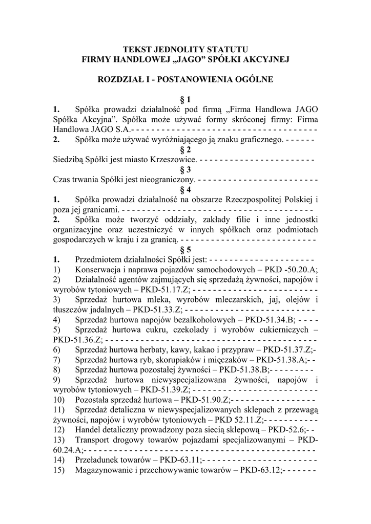 TEKST JEDNOLITY STATUTU FIRMY HANDLOWEJ „JAGO” SPÓŁKI AKCYJNEJ ROZDZIAŁ I - POSTANOWIENIA OGÓLNE §1 1. Spółka prowadzi działalność pod firmą „Firma Handlowa JAGO Spółka Akcyjna”. Spółka może używać formy skróconej firmy: Firma Handlowa JAGO S.A.- - - - - - - - - - - - - - - - - - - - - - - - - - - - - - - - - - - - 2. Spółka może używać wyróżniającego ją znaku graficznego. - - - - - §2 Siedzibą Spółki jest miasto Krzeszowice. - - - - - - - - - - - - - - - - - - - - - - §3 Czas trwania Spółki jest nieograniczony. - - - - - - - - - - - - - - - - - - - - - - - §4 1. Spółka prowadzi działalność na obszarze Rzeczpospolitej Polskiej i poza jej granicami. - - - - - - - - - - - - - - - - - - - - - - - - - - - - - - - - - - - - - 2. Spółka może tworzyć oddziały, zakłady filie i inne jednostki organizacyjne oraz uczestniczyć w innych spółkach oraz podmiotach gospodarczych w kraju i za granicą. - - - - - - - - - - - - - - - - - - - - - - - - - - §5 1. Przedmiotem działalności Spółki jest: - - - - - - - - - - - - - - - - - - - - 1) Konserwacja i naprawa pojazdów samochodowych – PKD -50.20.A; 2) Działalność agentów zajmujących się sprzedażą żywności, napojów i wyrobów tytoniowych – PKD-51.17.Z; - - - - - - - - - - - - - - - - - - - - - - - - 3) Sprzedaż hurtowa mleka, wyrobów mleczarskich, jaj, olejów i tłuszczów jadalnych – PKD-51.33.Z; - - - - - - - - - - - - - - - - - - - - - - - - - 4) Sprzedaż hurtowa napojów bezalkoholowych – PKD-51.34.B; - - - 5) Sprzedaż hurtowa cukru, czekolady i wyrobów cukierniczych – PKD-51.36.Z; - - - - - - - - - - - - - - - - - - - - - - - - - - - - - - - - - - - - - - - - - 6) Sprzedaż hurtowa herbaty, kawy, kakao i przypraw – PKD-51.37.Z;7) Sprzedaż hurtowa ryb, skorupiaków i mięczaków – PKD-51.38.A;- 8) Sprzedaż hurtowa pozostałej żywności – PKD-51.38.B;- - - - - - - - 9) Sprzedaż hurtowa niewyspecjalizowana żywności, napojów i wyrobów tytoniowych – PKD-51.39.Z; - - - - - - - - - - - - - - - - - - - - - - - - 10) Pozostała sprzedaż hurtowa – PKD-51.90.Z;- - - - - - - - - - - - - - - - 11) Sprzedaż detaliczna w niewyspecjalizowanych sklepach z przewagą żywności, napojów i wyrobów tytoniowych – PKD 52.11.Z;- - - - - - - - - - 12) Handel detaliczny prowadzony poza siecią sklepową – PKD-52.6;- 13) Transport drogowy towarów pojazdami specjalizowanymi – PKD60.24.A;- - - - - - - - - - - - - - - - - - - - - - - - - - - - - - - - - - - - - - - - - - - - - 14) Przeładunek towarów – PKD-63.11;- - - - - - - - - - - - - - - - - - - - - - 15) Magazynowanie i przechowywanie towarów – PKD-63.12;- - - - - - - 16) Wynajem nieruchomości na własny rachunek – PKD-70.20.Z;- - - - 17) Wynajem pozostałych środków transportu lądowego – PKD 71.21.Z;- - - - - - - - - - - - - - - - - - - - - - - - - - - - - - - - - - - - - - - - - - - - - 18) Wynajem pozostałych maszyn i urządzeń – PKD-71.34.Z;- - - - - - - 19) Badanie rynku i opinii publicznej – PKD-74.13.Z;- - - - - - - - - - - - 20) Reklama – PKD-74.40.Z.- - - - - - - - - - - - - - - - - - - - - - - - - - - - - 2. Uchwała o istotnej zmianie przedmiotu działalności Spółki nie wymaga wykupu akcji, o którym mowa w art. 416 § 4 Kodeksu spółek handlowych, jeżeli uchwała zostanie powzięta większością dwóch trzecich głosów w obecności osób reprezentujących co najmniej połowę kapitału zakładowego Spółki.- - - - - - - - - - - - - - - - - - - - - - - - - - - - - - - - - - - - - ROZDZIAŁ II KAPITAŁ ZAKŁADOWY, PRAWA I OBOWIĄZKI AKCJONARIUSZY §6 Kapitał zakładowy wynosi 15.140.100,- zł (piętnaście milionów sto czterdzieści tysięcy sto złotych) i dzieli się na 15.140.100 (piętnaście milionów sto czterdzieści tysięcy sto) akcji o wartości nominalnej 1,00 (jeden) złoty każda, w tym:---------------------------------------------------------a. 7.640.100 akcji zwykłych na okaziciela serii A,---------------------------b. 7.500.000 akcji zwykłych na okaziciela serii B.---------------------------§7 1. Spółka może emitować akcje imienne i na okaziciela.- - - - - - - - - - 2. Akcje imienne mogą być zamienione na akcje na okaziciela przez Zarząd na wniosek akcjonariusza. Zamiany akcji imiennej posiadanej przez członka Zarządu na akcję na okaziciela dokonuje Rada Nadzorcza.- - - - - 3. Akcje na okaziciela nie mogą być zamienione na akcje imienne.- - - §8 Spółka może emitować obligacje, w tym obligacje z prawem pierwszeństwa i obligacje zamienne na akcje Spółki. Całkowita liczba obligacji wyemitowanych, forma, sposób i zasady ewentualnej zmiany obligacji na akcje zostaną ustalone w poszczególnych uchwałach Walnego Zgromadzenia.- - - - - - - - - - - - - - - - - - - - - - - - - - - - - - - - - - - - - - - - - §9 1. Spółka może umarzać własne akcje.- - - - - - - - - - - - - - - - - - - - - - 2. Akcja może być umorzona za zgodą akcjonariusza w drodze jej nabycia przez Spółkę (umorzenie dobrowolne). .- - - - - - - - - - - - - - - - - - 3. Akcjonariuszowi, którego akcje mają być umorzone przysługuje wynagrodzenie w wysokości nie niższej od wartości przypadających na akcje aktywów netto, wykazanych w sprawozdaniu finansowym za ostatni rok obrotowy, pomniejszonych o kwotę przeznaczoną do podziału między akcjonariuszy.- - - - - - - - - - - - - - - - - - - - - - - - - - - - - - - - - - - - - - - - - ROZDZIAŁ III – ORGANY SPÓŁKI § 10 Organami Spółki są: 1) Walne Zgromadzenie, .- - - - - - - - - - - - - - - - - - - - - - - - - - - - - - - 2) Rada Nadzorcza,- - - - - - - - - - - - - - - - - - - - - - -.- - - - - - - - - - - 3) Zarząd. .- - - - - - - - - - - - - - - - - - - - - - - - - - - - - - - - - - - - - - - - WALNE ZGROMADZENIE § 11 1. Walne Zgromadzenia mogą być zwyczajne i nadzwyczajne.- - - - - - 2. Zwyczajne Walne Zgromadzenie zwołuje Zarząd Spółki raz w roku nie później niż do dnia 30 czerwc
