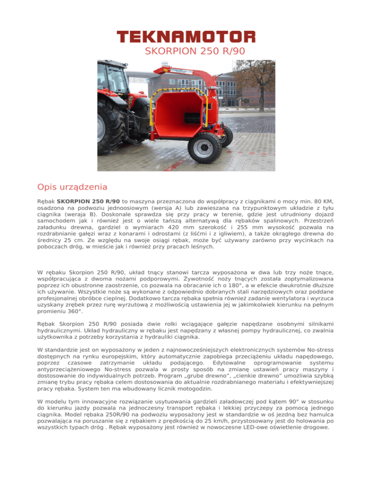 SKORPION 250 R/90 Opis urządzenia Rębak SKORPION 250 R/90 to maszyna przeznaczona do współpracy z ciągnikami o mocy min. 80 KM, osadzona na podwoziu jednoosiowym (wersja A) lub zawieszana na trzypunktowym układzie z tyłu ciągnika (weraja B). Doskonale sprawdza się przy pracy w terenie, gdzie jest utrudniony dojazd samochodem jak i również jest o wiele tańszą alternatywą dla rębaków spalinowych. Przestrzeń załadunku drewna, gardziel o wymiarach 420 mm szerokość i 255 mm wysokość pozwala na rozdrabnianie gałęzi wraz z konarami i odrostami (z liśćmi i z igliwiem), a także okrągłego drewna do średnicy 25 cm. Ze względu na swoje osiągi rębak, może być używany zarówno przy wycinkach na poboczach dróg, w mieście jak i również przy pracach leśnych. W rębaku Skorpion 250 R/90, układ tnący stanowi tarcza wyposażona w dwa lub trzy noże tnące, współpracująca z dwoma nożami podporowymi. Żywotność noży tnących została zoptymalizowana poprzez ich obustronne zaostrzenie, co pozwala na obracanie ich o 180°, a w efekcie dwukrotnie dłuższe ich używanie. Wszystkie noże są wykonane z odpowiednio dobranych stali narzędziowych oraz poddane profesjonalnej obróbce cieplnej. Dodatkowo tarcza rębaka spełnia również zadanie wentylatora i wyrzuca uzyskany zrębek przez rurę wyrzutową z możliwością ustawienia jej w jakimkolwiek kierunku na pełnym promieniu 360°. Rębak Skorpion 250 R/90 posiada dwie rolki wciągające gałęzie napędzane osobnymi silnikami hydraulicznymi. Układ hydrauliczny w rębaku jest napędzany z własnej pompy hydraulicznej, co zwalnia użytkownika z potrzeby korzystania z hydrauliki ciągnika. W standardzie jest on wyposażony w jeden z najnowocześniejszych elektronicznych systemów No-stress dostępnych na rynku europejskim, który automatycznie zapobiega przeciążeniu układu napędowego, poprzez czasowe zatrzymanie układu podającego. Edytowalne oprogramowanie systemu antyprzeciążeniowego No-stress pozwala w prosty sposób na zmianę ustawień pracy maszyny i dostosowanie do indywidualnych potrzeb. Program „grube drewno”, „cienkie drewno” umożliwia szybką zmianę trybu pracy rębaka celem dostosowania do aktualnie rozdrabnianego materiału i efektywniejszej pracy rębaka. System ten ma wbudowany licznik motogodzin. W modelu tym innowacyjne rozwiązanie usytuowania gardzieli załadowczej pod kątem 90° w stosunku do kierunku jazdy pozwala na jednoczesny transport rębaka i lekkiej przyczepy za pomocą jednego ciągnika. Model rębaka 250R/90 na podwoziu wyposażony jest w standardzie w oś jezdną bez hamulca pozwalająca na poruszanie się z rębakiem z prędkością do 25 km/h, przystosowany jest do holowania po wszystkich typach dróg . Rębak wyposażony jest również w nowoczesne LED-owe oświetlenie drogowe. Uzyskany poprzez proces zrębkowania zrębek może zostać wykorzystany do bezpośredniego spalania w piecach, do produkcji kompostu, do celów dekoracyjnych oraz po wtórnym rozdrobnieniu przez młyn bijakowy jako surowiec do produkcji brykietu i pelletu. Dane techniczne MODEL URZĄDZENIA Gabaryty (dł. x szer. x wys.) [mm] Waga [kg] Średnica gałęzi [mm] Ilość noży Szybkość podawania [mb/min] Wydajność zrębkowania [m3/h] Szerokość zrębka [mm] Sposób podawania Średnica tarczy [mm] Wymiary gardzieli (szer. x wys.) [mm] Rodzaj napędu Minimalna moc ciągnika [KM] SKORPION 250 R/90 2830 x 2400 x 2680 [A] 1800 x 2100 x 2480 (2780)* [B] 1450 [A]** 1200 [B] 250 2 lub 3 tnące + 2 podporowe do 42 do 18 od 9 do 14 dwie rolki zębate o napędzie hydraulicznym 800 420 x 255 z WOM od ciągnika 80 ()* - wymiar po rozłożeniu, w trakcie pracy ()** - zależy od zastosowanej osi jezdnej Wyposażenie standardowe: Oś jezdna do 25km/h [wersja A] Wałek odbioru mocy. Rura wyrzutowa ze ślimakową obrotnicą 360°, deflektor. Własny system hydrauliczny. System antyprzeciążeniowy No-stress z licznikiem motogodzin. Wyposażenie opcjonalne: Podwyższenie rury wyrzutowej. Oś jezdna z zawieszeniem resorowanym wyposażona w hamulec pneumatyczny - [wersja A]. Powered by TCPDF (www.tcpdf.org)