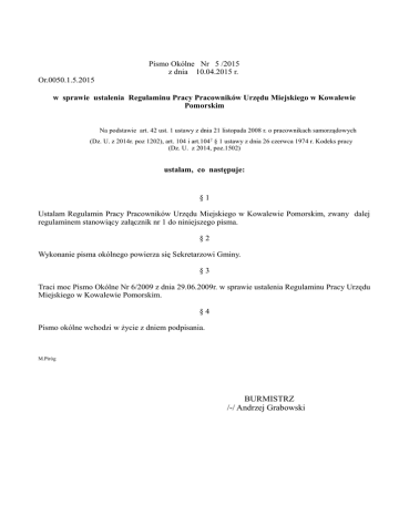 Or.0050.1.5.2015 Pismo Okólne Nr 5 /2015 z dnia 10.04.2015 r. w sprawie ustalenia Regulaminu Pracy Pracowników Urzędu Miejskiego w Kowalewie Pomorskim Na podstawie art. 42 ust. 1 ustawy z dnia 21 listopada 2008 r. o pracownikach samorządowych (Dz. U. z 2014r. poz 1202), art. 104 i art.1042 § 1 ustawy z dnia 26 czerwca 1974 r. Kodeks pracy (Dz. U. z 2014, poz.1502) ustalam, co następuje: §1 Ustalam Regulamin Pracy Pracowników Urzędu Miejskiego w Kowalewie Pomorskim, zwany dalej regulaminem stanowiący załącznik nr 1 do niniejszego pisma. §2 Wykonanie pisma okólnego powierza się Sekretarzowi Gminy. §3 Traci moc Pismo Okólne Nr 6/2009 z dnia 29.06.2009r. w sprawie ustalenia Regulaminu Pracy Urzędu Miejskiego w Kowalewie Pomorskim. §4 Pismo okólne wchodzi w życie z dniem podpisania. M.Piróg BURMISTRZ /-/ Andrzej Grabowski Załącznik do Pisma Okólnego nr5/2015 Burmistrz Miasta Kowalewo Pomorskie z dnia 10.04.2015r Rozdział I POSTANOWIENIA OGÓLNE Regulamin ustala, w szczególności: §1 1. Obowiązki i uprawnienia pracodawcy. 2. Obowiązki i uprawnienia pracownika. 3. Odpowiedzialność za naruszenie obowiązków pracowniczych, powierzone mienie i za szkodę wyrządzoną pracodawcy. 4. System i rozkład czasu pracy. 5. Porządek pracy. 6. Termin, miejsce i częstotliwość wypłaty wynagrodzenia za pracę. 7. Zasady usprawiedliwiania nieobecności w pracy i spóźnień oraz udzielania zwolnień od pracy. 8. Urlopy wypoczynkowe, szkoleniowe, bezpłatne. 9. Obowiązki dotyczące bezpieczeństwa i higieny pracy oraz ochrony przeciwpożarowej. 10. Zasady ochrony pracy kobiet oraz wykaz prac wzbronionych kobietom. 11. Odpowiedzialność porządkową pracownika. §2 Regulamin Pracy Urzędu Miejskiego w Kowalewie Pomorskim, zwany dalej regulaminem ustala porządek wewnętrzny i rozkład czasu pracy oraz związane z tym prawa i obowiązki pracodawcy i pracowników. §3 Ilekroć w regulaminie jest mowa o: Pracodawcy - należy przez to rozumieć Urząd Miejski w Kowalewie Pomorskim reprezentowany przez Burmistrza Miasta Kowalewo Pomorskie, Pracownikach - należy przez to rozumieć osobę zatrudnioną w Urzędzie Miejskim w Kowalewie Pomorskim na podstawie umowy o pracę, bez względu na rodzaj umowy o pracę i wymiar czasu pracy, Urzędzie - należy przez to rozumieć Urząd Miejski w Kowalewie Pomorskim, Burmistrzu - należy przez to rozumieć Burmistrza Miasta Kowalewo Pomorskie, Zastępcy Burmistrza - należy przez to rozumieć Zastępcę Burmistrza Miasta Kowalewo Pomorskie, Sekretarzu - należy przez to rozumieć Sekretarza Gminy Kowalewo Pomorskie, Skarbniku - należy przez to rozumieć Skarbnika Gminy Kowalewo Pomorskie będącego jednocześnie Głównym Księgowym Budżetu, Kierownikach referatów - należy przez to rozumieć kierowników wyodrębnionych w strukturze urzędu referatów oraz osoby zajmujące samodzielne stanowiska pracy. §4 Przepisy niniejszego regulaminu obowiązują wszystkich pracowników, bez względu na rodzaj wykonywanej pracy i zajmowane stanowisko służbowe. §5 1 1. Pracodawca zapoznaje z treścią regulaminu każdego przyjmowanego do pracy pracownika przed rozpoczęciem przez niego pracy, a pracownik potwierdza zapoznanie się z regulaminem podpisując stosowne oświadczenie, które zostaje dołączone do jego akt osobowych. 2. Egzemplarz regulaminu musi znajdować się w każdym referacie i ma być dostępny dla każdego pracownika. 3. Kierownicy poszczególnych referatów zobowiązani są do zapoznania pracowników ze zmianami w regulaminie. Rozdział II OBOWIĄZKI I UPRAWNIENIA PRACODAWCY §6 Pracodawca jest obowiązany w szczególności: 1. Zaznajamiać pracowników podejmujących pracę z zakresem ich obowiązków, sposobem wykonywania pracy na wyznaczonych stanowiskach oraz ich podstawowymi uprawnieniami. 2. Organizować pracę w sposób zapewniający pełne wykorzystanie czasu pracy, jak również osiąganie przez pracowników, przy wykorzystaniu ich uzdolnień i kwalifikacji, wysokiej wydajności i należytej jakości pracy. 3. Organizować pracę w sposób zapewniający zmniejszenie uciążliwości pracy, zwłaszcza pracy monotonnej i pracy w ustalonym z góry tempie. 4. Przeciwdziałać dyskryminacji w zatrudnieniu, w szczególności ze względu na płeć, wiek, niepełnosprawność, rasę, religię, narodowość, przekonania polityczne, przynależność związkową, pochodzenie etniczne, wyznanie, orientację seksualną, a także ze względu na zatrudnienie na czas określony lub nieokreślony, albo w pełnym lub w niepełnym wymiarze czasu pracy. 5. Zapewniać bezpieczne i higieniczne warunki pracy oraz prowadzić systematyczne szkolenia pracowników w zakresie bezpieczeństwa i higieny pracy. 6. Terminowo i prawidłowo wypłacać wynagrodzenie. 7. Ułatwiać pracownikom podnoszenie kwalifikacji zawodowych. 8. Zaspokajać w miarę posiadanych środków socjalne potrzeby pracowników. 9. Stosować obiektywne i sprawiedliwe kryteria oceny pracowników oraz wyników ich pracy. 10. Prowadzić dokumentację w sprawach związanych ze stosunkiem pracy oraz akta osobowe pracowników. 11. Informować pracowników o ryzyku zawodowym, które wiąże się z wykonywaną pracą oraz o zasadach ochrony przed tymi zagrożeniami. 12. Wpływać na kształtowanie w zakładzie pracy zasad współżycia społecznego. 13. Pracodawca ma obowiązek poinformować pracownika na piśmie, nie później niż w ciągu 7 dni od dnia zawarcia umowy o pracę, o obowiązującej dobowej i tygodniowej normie czasu pracy, częstotliwości wypłaty wynagrodzenia za pracę, urlopie wypoczynkowym oraz długości okresu wypowiedzenia umowy o pracę. Rozdział III OBOWIĄZKI I UPRAWNIENIA PRACOWNIKA 2 §7 1. Pracownik obowiązany jest wykonywać pracę sumiennie i starannie oraz stosować się do poleceń przełożonych, które dotyczą pracy, jeżeli nie są one sprzeczne z przepisami prawa pracy lub umowy o pracę. 2. Podstawowym obowiązkiem pracownika jest w szczególn