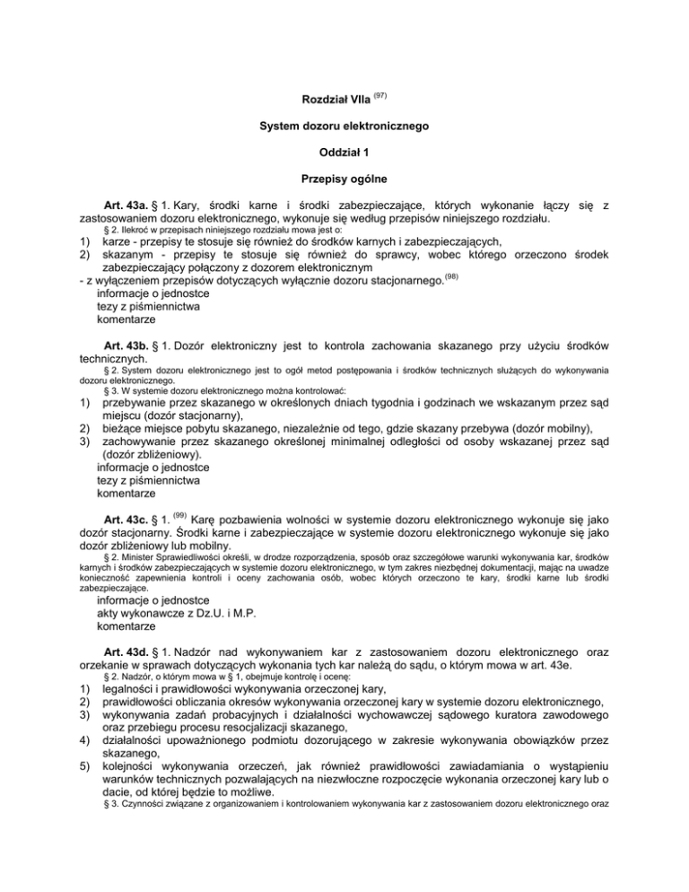Rozdział VIIa (97) System dozoru elektronicznego Oddział 1 Przepisy ogólne Art. 43a. § 1. Kary, środki karne i środki zabezpieczające, których wykonanie łączy się z zastosowaniem dozoru elektronicznego, wykonuje się według przepisów niniejszego rozdziału. § 2. Ilekroć w przepisach niniejszego rozdziału mowa jest o: karze - przepisy te stosuje się również do środków karnych i zabezpieczających, skazanym - przepisy te stosuje się również do sprawcy, wobec którego orzeczono środek zabezpieczający połączony z dozorem elektronicznym (98) - z wyłączeniem przepisów dotyczących wyłącznie dozoru stacjonarnego. informacje o jednostce tezy z piśmiennictwa komentarze 1) 2) Art. 43b. § 1. Dozór elektroniczny jest to kontrola zachowania skazanego przy użyciu środków technicznych. § 2. System dozoru elektronicznego jest to ogół metod postępowania i środków technicznych służących do wykonywania dozoru elektronicznego. § 3. W systemie dozoru elektronicznego można kontrolować: przebywanie przez skazanego w określonych dniach tygodnia i godzinach we wskazanym przez sąd miejscu (dozór stacjonarny), 2) bieżące miejsce pobytu skazanego, niezależnie od tego, gdzie skazany przebywa (dozór mobilny), 3) zachowywanie przez skazanego określonej minimalnej odległości od osoby wskazanej przez sąd (dozór zbliżeniowy). informacje o jednostce tezy z piśmiennictwa komentarze 1) (99) Art. 43c. § 1. Karę pozbawienia wolności w systemie dozoru elektronicznego wykonuje się jako dozór stacjonarny. Środki karne i zabezpieczające w systemie dozoru elektronicznego wykonuje się jako dozór zbliżeniowy lub mobilny. § 2. Minister Sprawiedliwości określi, w drodze rozporządzenia, sposób oraz szczegółowe warunki wykonywania kar, środków karnych i środków zabezpieczających w systemie dozoru elektronicznego, w tym zakres niezbędnej dokumentacji, mając na uwadze konieczność zapewnienia kontroli i oceny zachowania osób, wobec których orzeczono te kary, środki karne lub środki zabezpieczające. informacje o jednostce akty wykonawcze z Dz.U. i M.P. komentarze Art. 43d. § 1. Nadzór nad wykonywaniem kar z zastosowaniem dozoru elektronicznego oraz orzekanie w sprawach dotyczących wykonania tych kar należą do sądu, o którym mowa w art. 43e. § 2. Nadzór, o którym mowa w § 1, obejmuje kontrolę i ocenę: 1) 2) 3) 4) 5) legalności i prawidłowości wykonywania orzeczonej kary, prawidłowości obliczania okresów wykonywania orzeczonej kary w systemie dozoru elektronicznego, wykonywania zadań probacyjnych i działalności wychowawczej sądowego kuratora zawodowego oraz przebiegu procesu resocjalizacji skazanego, działalności upoważnionego podmiotu dozorującego w zakresie wykonywania obowiązków przez skazanego, kolejności wykonywania orzeczeń, jak również prawidłowości zawiadamiania o wystąpieniu warunków technicznych pozwalających na niezwłoczne rozpoczęcie wykonania orzeczonej kary lub o dacie, od której będzie to możliwe. § 3. Czynności związane z organizowaniem i kontrolowaniem wykonywania kar z zastosowaniem dozoru elektronicznego oraz nałożonych w związku z nimi obowiązków wykonuje sądowy kurator zawodowy. Przepisy o dozorze i kuratorze sądowym stosuje się odpowiednio. informacje o jednostce komentarze (100) Art. 43e. § 1. W sprawach związanych z udzieleniem zezwolenia na odbycie kary pozbawienia wolności w systemie dozoru elektronicznego właściwy jest sąd penitencjarny, w którego okręgu skazany przebywa. § 2. W sprawach związanych z wykonaniem postanowienia o udzieleniu zezwolenia na odbycie kary pozbawienia wolności w systemie dozoru elektronicznego i jego uchyleniem właściwy jest sąd penitencjarny, w którego okręgu kara jest wykonywana, z wyjątkiem uchylenia zezwolenia z powodów, o których mowa w art. 43zaa § 1 pkt 1, kiedy to właściwy jest sąd penitencjarny, który zezwolenia udzielił. § 3. W sprawach wykonywania dozoru zbliżeniowego i mobilnego właściwy jest sąd, w którego okręgu skazany ma miejsce stałego pobytu, a jeżeli skazany nie posiada takiego miejsca - sąd, w którego okręgu orzeczono środek karny lub zabezpieczający wykonywany w systemie dozoru elektronicznego. informacje o jednostce tezy z piśmiennictwa komentarze 1) 2) 3) 4) Art. 43f. § 1. Środkami technicznymi służącymi do wykonywania dozoru elektronicznego są: centrala monitorowania, system teleinformatyczny, za pomocą którego podmiot prowadzący centralę monitorowania, podmiot dozorujący, sądy, sądowi kuratorzy zawodowi i inne uprawnione podmioty przetwarzają informacje związane z organizowaniem i kontrolowaniem wykonywania kar w systemie dozoru elektronicznego (system komunikacyjno-monitorujący), nadajniki, rejestratory stacjonarne i przenośne. § 2. Minister Sprawiedliwości określi, w drodze rozporządzenia, szczegółowe warunki techniczne i wymagania funkcjonalne, jakie powinny spełniać środki techniczne służące do wykonywania dozoru elektronicznego, a także sposób funkcjonowania systemu komunikacyjno-monitorującego, w tym sposób przekazywania danych wewnątrz tego systemu, mając na względzie konieczność zapewnienia prawidłowego działania systemu dozoru elektronicznego oraz zabezpieczenia danych osobowych i informacji związanych z działaniem tego systemu przed ich nieuprawnionym ujawnieniem. informacje o jednostce akty wykonawcze z Dz.U. i M.P. komentarze 1) 2) Art. 43g. § 1. Dozór elektroniczny wykonywany jest przez: podmiot prowadzący centralę monitorowania - w zakresie czynności związanych z obsługą tej centrali, podmiot dozorujący - w zakresie pozostałych czynności. § 2. Podmiotem prowadzącym centralę monitorowania jest podmiot dozorujący lub jednostka organizacyjna podległa Ministrowi Sprawiedliwości. § 3. Podmiotem dozorującym może być przedsiębiorca, instytucja państwowa lub podmiot zagraniczny będący przedsiębiorcą w rozum