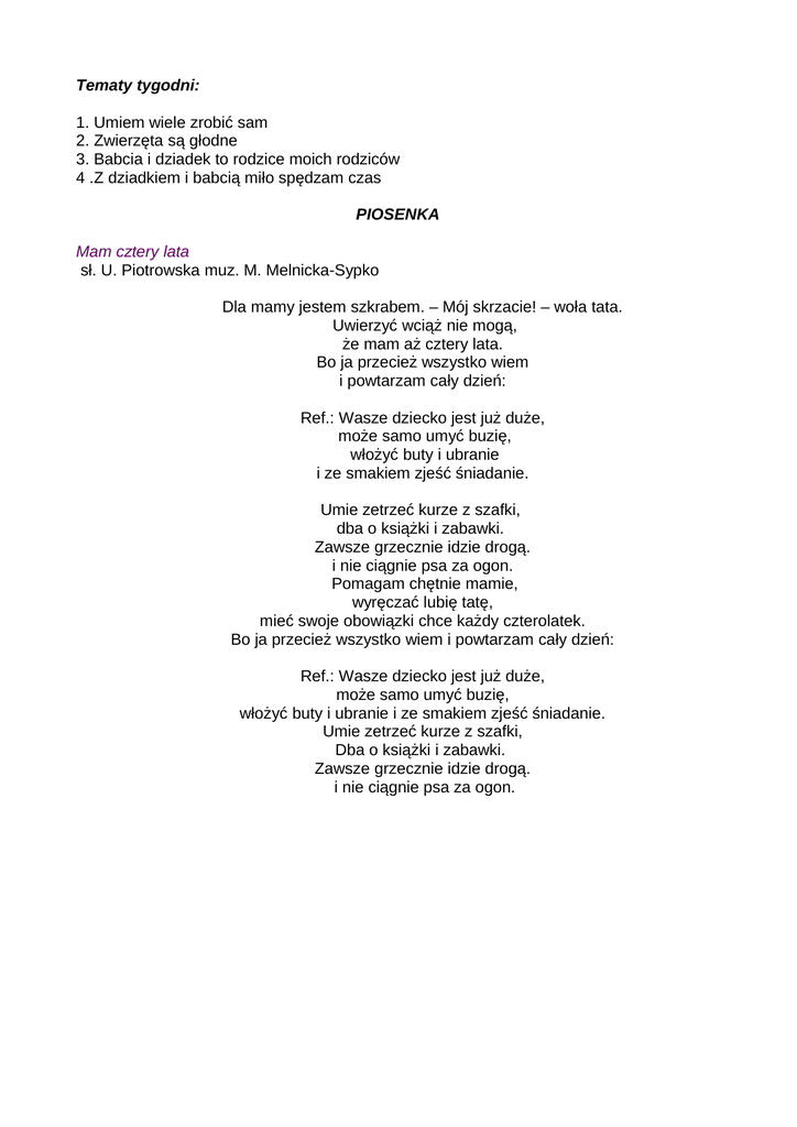 Tematy tygodni: 1. Umiem wiele zrobić sam 2. Zwierzęta są głodne 3. Babcia i dziadek to rodzice moich rodziców 4 .Z dziadkiem i babcią miło spędzam czas PIOSENKA Mam cztery lata sł. U. Piotrowska muz. M. Melnicka-Sypko Dla mamy jestem szkrabem. – Mój skrzacie! – woła tata. Uwierzyć wciąż nie mogą, że mam aż cztery lata. Bo ja przecież wszystko wiem i powtarzam cały dzień: Ref.: Wasze dziecko jest już duże, może samo umyć buzię, włożyć buty i ubranie i ze smakiem zjeść śniadanie. Umie zetrzeć kurze z szafki, dba o książki i zabawki. Zawsze grzecznie idzie drogą. i nie ciągnie psa za ogon. Pomagam chętnie mamie, wyręczać lubię tatę, mieć swoje obowiązki chce każdy czterolatek. Bo ja przecież wszystko wiem i powtarzam cały dzień: Ref.: Wasze dziecko jest już duże, może samo umyć buzię, włożyć buty i ubranie i ze smakiem zjeść śniadanie. Umie zetrzeć kurze z szafki, Dba o książki i zabawki. Zawsze grzecznie idzie drogą. i nie ciągnie psa za ogon. WIERSZ Dziś dla babci słońce mamy. I całuski dla dziadziusia. Dziś życzenia wnuczek składa. I piosenki śpiewa wnusia. Aby babcia i dziadziunio w zdrowiu długo żyli. Aby uśmiech dla nas mieli w każdej wolnej chwili. Babciu, babciu coś ci dam. Uśmiech w sercu, który mam. Kolorowe kwiatki trzy, żebyś miała miłe sny. Narysuję słonko tobie I życzenia nim ozdobię.