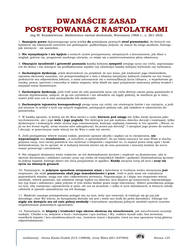 DWANAŚCIE ZASAD POSTĘPOWANIA Z NASTOLATKAMI (wg M. Kozakiewicza: Małżeństwo niemal doskonałe, Warszawa 1968 r., s. 261-263) 1. Szanujcie prawo dojrzewającego syna (córki) do posiadania pewnych stref prywatności, do których nie będziecie się włamywali natrętnie ani podstępnie, podkreślając jedynie, że macie do niego zaufanie, którego jak wierzycie - nie zawiedzie. 2. Nie wyszydzajcie i nie kpijcie z nowych rysów postępowania, związanych z dorastaniem, jak dbać o wygląd, golenie się, pragnienie modnego ubrania, co wiąże się z zainteresowaniem płcią odmienną. 3. Okazujcie życzliwość i gotowość poznania każdej kolejnej sympatii swojego syna czy córki, zapraszając ich do domu i nie starajcie się profilaktycznie szydzić czy ośmieszyć każdej kolejnej wybranki czy wybrańca. 4. Zachowujcie dyskrecję, jeżeli dostrzeżecie na przykład; że syn wasz, jak większość jego rówieśników, uprawia okresowy onanizm, nie przeprowadzajcie z nim z własnej inicjatywy żadnych rozmów na ten temat, podrzućcie mu odpowiednią lekturę, a sami zatroszczcie się o intensyfikację życia chłopca., o wypełnienie go nauką, pracą, sportem i rozrywką w takim stopniu, żeby kładł się spać przyjemnie zmęczony pełnią wrażeń i zasypiał snem kamiennym. 5. Zachowajcie dyskrecję, jeśli trafi wam do ręki pamiętnik syna czy córki (którzy często piszą pamiętniki w okresie dojrzewania), udajcie, że go nie czytaliście i nie zdradźcie się nigdy później, że mieliście go w ręku, nawet jeśli was coś w nim zaniepokoiło lub zaskoczyło. 6. Zachowujcie tajemnicę korespondencji swego syna czy córki, nie otwierajcie listów i nie czytajcie, a jeśli już musicie to zrobić z tych czy innych względów, postępujcie później tak, jak radziłem w odniesieniu do pamiętnika. 7. W każdej sprawie, w której się do Was zwróci o radę, bierzcie pod uwagę nie tylko swoje życzenia jako wychowawców, ale i jego wolę i jego poglądy. Nie dyktujcie już jak małemu dziecku decyzji i rozwiązań, tylko dyskutujcie i wskazujcie słabe strony jego rozumowania, kończąc najlepiej rozmowy w ten sposób: „Wiesz, co ja na ten temat myślę, teraz musisz sam zdecydować, bo jesteś już dorosły”. I oznajmić jego prawo do wyboru i decyzji, w przeciwnym razie więcej się do Was o radę nie zwróci. 8. Jeśli postąpiwszy wbrew waszej radzie, poniesie ujemne skutki i zapłaci za to cierpieniem, nie wypominajcie mu zrządzeniem: „A mówiłem, a uprzedzałem”, bo po takiej nauczce on sam Wam w duchu przyzna rację, lecz raczej pomóżcie mu wybrnąć z kłopotów i naprawić to, co zepsuł przez swój upór i brak doświadczenia, bo to sprawi, że w kolejnej kwestii zwróci się do was ponownie i mocniej weźmie do serca wasze przestrogi i ostrzeżenia. 9. Nie ulegajcie złudzeniu wielu rodziców, że ich doświadczenie życiowe i mądrość są dostateczne, aby w okresie dorastania i młodości ustrzec syna czy córkę od wszystkich błędów i potknięć Doświadczenia życiowe to jedyny kapitał, którego dzieci nie chcą przyjmować w spadku. Każdy zaczyna tutaj od zera i uczy się życia na własnych gruzach. 10. Pamiętajcie, że jedynym sposobem utrzymania więzi z dzieckiem w trudnym wieku dorastania jest stopniowe, ale stałe poszerzenie skali jego samodzielności i praw. Jeśli w porę sami nie rozluźnicie poprzednich więzów, mogą one ulec całkowitemu zerwaniu. Popuszczając je i dając mu stopniowo więcej swobody, wbrew pozorom, nie osłabicie swego wpływ na dziecko, lecz dopiero go wzmocnicie, wprowadzając ten typ więzi i zależności, jakie jedynie w tym wieku będzie przez niego tolerowany. Sekret powodzenia polega na tym, aby rozszerzyć uprawnienia w porę, ale nie za wcześnie, i tylko w tych dziedzinach, w których młody człowiek w sposób uzasadniony się ich domaga. 11. Mądrość naszego postępowania polegać ma na tym, żeby syn uwierzył, iż traktuje się go już jak dorosłego, choć Wy wiecie, że bynajmniej dorosły nie jest i wiele mu brak do pełni dorosłości. Dlatego też nigdy nie dawajcie mu od razu pełnej swobody i warunkiem uzyskania jednych swobód czyńcie uczciwe respektowanie pozostałych ograniczeń. 12. Pamiętajcie, że kłopoty i trudności tego okresu skończą się nieuchronnie, jak nieuchronnie musiały nadejść. Chodzi o to, żebyście z burz i wstrząsów i syn (córka), i Wy, rodzice wyszli cało, bez zerwania wszelkich więzów i bez nieodwracalnych ran. Jesteście starsi i dojrzalsi, toteż na was spoczywa tutaj główna odpowiedzialność. mediatorzy - Iwona Kitala-Dudek (515-128808), Jerzy Śliwa (601-637984) Strona 125