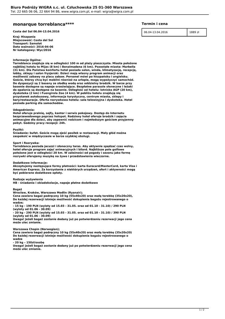 Biuro Podróży WIGRA s.c. ul. Człuchowska 25 01-360 Warszawa Tel. 22 665 06 06, 22 664 94 86, www.wigra.com.pl, e-mail: [email protected] monarque torreblanca**** Costa del Sol 06.04-13.04.2016 Termin i cena 06.04-13.04.2016 1889 zł Kraj: Hiszpania Miejscowość: Costa del Sol Transport: Samolot Data ważności: 2016-04-06 Nr katalogowy: Wyc/2016 Informacje Ogólne: Torreblanca znajduje się w odległości 100 m od plaży piaszczysta. Miasta położone najbliżej hotelu to Mijas (8 km) i Benalmadena (6 km). Pozostałe miasta: Marbella (31 km). Dla Państwa komfortu hotel posiada salon, winda, klimatyzację, recepcję, lobby, sklepy i salon fryzjerski. Dzieci mają własny program animacji oraz możliwość zabawy na placu zabaw. Personel mówi po hiszpańsku i angielsku. Goście, którzy chcą być mobilni również na urlopie, mogą wypożyczyć samochód. Do dyspozycji są 2 baseny ze słodką wodą oraz oddzielny brodzik. W barze przy basenie dostępne są napoje orzeźwiające. Bezpłatne parasole słoneczne i leżaki do opalania są dostępne na basenie. Odległość od hotelu: lotnisko AGP (20 km), dyskoteka (2 km) i Fuengirola Zoo (4 km). W pobliżu hotelu znajdują się przystanek autobusowy, informacja turystyczna, centrum miasta, sklepy i bary/restauracje. Oferta rozrywkowa hotelu: sala telewizyjna i dyskoteka. Hotel posiada parking dla samochodów. Udogodnienia: Hotel oferuje pralnię, sejfy, kantor i serwis pokojowy. Dostęp do Internetu bezprzewodowego poprzez hotspot. Rodzinny hotel oferuje brodzik i zajęcia animacyjne dla dzieci, aby zapewnić rodzicom i najmłodszym gościom przyjemny pobyt. Godziny pracy recepcji: 24h. Posiłki: Śniadanie: bufet. Goście mogą zjeść posiłek w restauracji. Mały głód można zaspokoić w międzyczasie w barze szybkiej obsługi. Sport i Rozrywka: Torreblanca posiada jacuzzi i słoneczny taras. Aby aktywnie spędzać czas wolny, hotel oferuje program zajęć animacyjnych i bilard. Najbliższe pole golfowe położone jest w odległości 20 km. W zależności od pogody i sezonu jako formę rozrywki oferujemy muzykę na żywo i przedstawienia wieczorne. Dodatkowe Informacje: Akceptujemy następujące formy płatności: karta Eurocard/MasterCard, karta Visa i American Express. Za korzystanie z niektórych urządzeń, ofert i aktywności mogą być pobierane dodatkowe opłaty. Rodzaje wyżywienia HB - śniadania i obiadokolacje, napoje płatne dodatkowo Bagaż Wrocław, Kraków, Warszawa Modlin (Ryanair); Cena zawiera bagaż podręczny 10 kg (55x40x20) oraz małą torebkę (35x20x20), Do każdej rezerwacji istnieje możliwość dokupienia bagażu rejestrowanego o wadze; - 15 kg - 190 PLN (wyloty od 15.03 - 31.05. oraz od 01.10 - 31.10) / 290 PLN (wyloty od 01.06 - 30.09) - 20 kg - 290 PLN (wyloty od 15.03 - 31.05. oraz od 01.10 - 31.10) / 390 PLN (wyloty od 01.06 - 30.09) Uwaga! Jeżeli bagaż zostanie dodany już po potwierdzeniu rezerwacji jego cena może ulec zmianie. Warszawa Chopin (Norwegian); Cena zawiera bagaż podręczny 10 kg (55x40x20) oraz małą torebkę (35x20x20) Do każdej rezerwacji istnieje możliwość dokupienia bagażu rejestrowanego o wadze - 20 kg – 150zł/osobę Uwaga! Jeżeli bagaż zostanie dodany już po potwierdzeniu rezerwacji jego cena może ulec zmianie. 1/2 Biuro Podróży WIGRA s.c. ul. Człuchowska 25 01-360 Warszawa Tel. 22 665 06 06, 22 664 94 86, www.wigra.com.pl, e-mail: [email protected] 2/2 Powered by TCPDF (www.tcpdf.org)