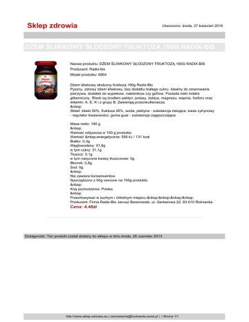 Sklep zdrowia Utworzono: środa, 27 kwiecień 2016 DŻEM ŚLIWKOWY SŁODZONY FRUKTOZĄ 190G RADIX-BIS Nazwa produktu: DŻEM ŚLIWKOWY SŁODZONY FRUKTOZĄ 190G RADIX-BIS Producent: Radix-bis Model produktu: 6954 Dżem śliwkowy słodzony fruktozą 190g Radix-Bis Pyszny, zdrowy dżem śliwkowy, bez dodatku białego cukru. Idealny do smarowania pieczywa, dodatek do wypiekow, naleśnikow czy gofrow. Posiada niski indeks glikemiczny. Śliwki są źrodłem pektyn, potasy, żelaza, magnezu, wapnia, fosforu oraz witamin: A, E, K i z grupy B. Zawierają przeciwutleniacze. Skład: śliwki 50%, fruktoza 26%, woda, pektyna - substancja żelująca, kwas cytrynowy - regulator kwasowości, guma guar - substancja zagęszczająca Masa netto: 190 g Wartość odżywcza w 100 g produktu Wartość energetyczna: 556 kJ / 131 kcal Białko: 0,3g Węglowodany: 31,8g w tym cukry: 31,1g Tłuszcz: 0,1g w tym nasycone kwasy tłuszczowe: 0g Błonnik: 0,8g Sod: 0g Nie zawiera konserwantow. Sporządzono z 50g owocow na 100g produktu Kraj pochodzenia: Polska Przechowywać w suchym i chłodnym miejscu. Producent: Firma Radix-Bis Janusz Baranowski, ul. Gerberowa 22, 83-010 Rotmanka Cena: 4.48zł Dostępność: Ten produkt został dodany do sklepu w dniu środa, 26 czerwiec 2013 http://www.sklep-zdrowia.eu | [email protected] | | Strona 1/1