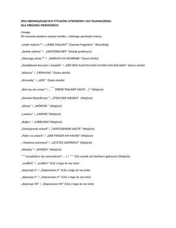 SPIS OBOWIĄZUJĄCYCH TYTUŁÓW UTWORÓW I ICH TŁUMACZENIA DLA OBSZARU PIERWSZEGO Uwaga. W nawiasie podano nazwę tomiku, z którego pochodzi wiersz. „Unde malum?” / „UNDE MALUM?“ (Zawsze fragment * Recycling) „Statek widmo“ / „GEISTERSCHIFF“ (Nożyk profesora) „Dlaczego piszę ?“ / „WARUM ICH SCHREIBE“ (Szara strefa) „Dodatkowe korzyści z książek“ / „ÜER DEN ZUSӒTZLICHEN NUTZEN VON BÜCHERN“ (Szara strefa) „Wiosna“ / „FRÜHLING“ (Szara strefa) „Krzywda” / „LEID “ (Szara strefa) „Biel się nie smuci“ / „ *** (WEIß TRAUERT NICHT …)” (Wyjście) „Kamień filozoficzny“ / „STEIN DER WEISEN“ (Wyjście) „Słowa” / „WŎRTER ” (Wyjście) „Lawina” / „LAWINE”(Wyjście) „Bajka” / „MӒRCHEN”(Wyjście) „Dostojewski mówił“ / „DOSTOJEWSKI SAGTE” (Wyjście) „Palec na ustach” / „DER FINGER AM MUND” (Wyjście) „ Ostatnia rozmowa“ / „LETZTES GESPRӒCH“ (Wyjście) „Wiedza“ / „WISSEN“ (Wyjście) ***(urodziłem się nosorożcem“ … ) / ***(ich wurde als Nashorn geboren) (Wyjście) „endlich” / „endlich“ (Cóż z tego że we śnie) „depresje II” / „Depression II” (Cóż z tego że we śnie) „depresje V” / „Depression V” (Cóż z tego że we śnie) „depresje VII” / „Depression VII” (Cóż z tego że we śnie) SPIS OBOWIĄZUJĄCYCH TYTUŁÓW UTWORÓW DLA OBSZARU DRUGIEGO Uwaga. W nawiasie podano nazwę tomiku, z którego pochodzi wiersz. „Unde malum?” (Zawsze fragment * Recycling) „Statek widmo“ (Nożyk profesora) „Dlaczego piszę ?“ (Szara strefa) „Dodatkowe korzyści z książek“ (Szara strefa) „Wiosna“ (Szara strefa) „Krzywda” (Szara strefa) „Biel się nie smuci“ (Wyjście) „Kamień filozoficzny“ (Wyjście) „Słowa” (Wyjście) „Lawina” (Wyjście) „Bajka” (Wyjście) „Dostojewski mówił“ (Wyjście) „Palec na ustach” (Wyjście) „ Ostatnia rozmowa“ (Wyjście) „Wiedza“ (Wyjście) ***(urodziłem się nosorożcem“ … ) (Wyjście) „endlich” (Cóż z tego że we śnie) „depresje II” (Cóż z tego że we śnie) „depresje V” (Cóż z tego że we śnie) „depresje VII” (Cóż z tego że we śnie)