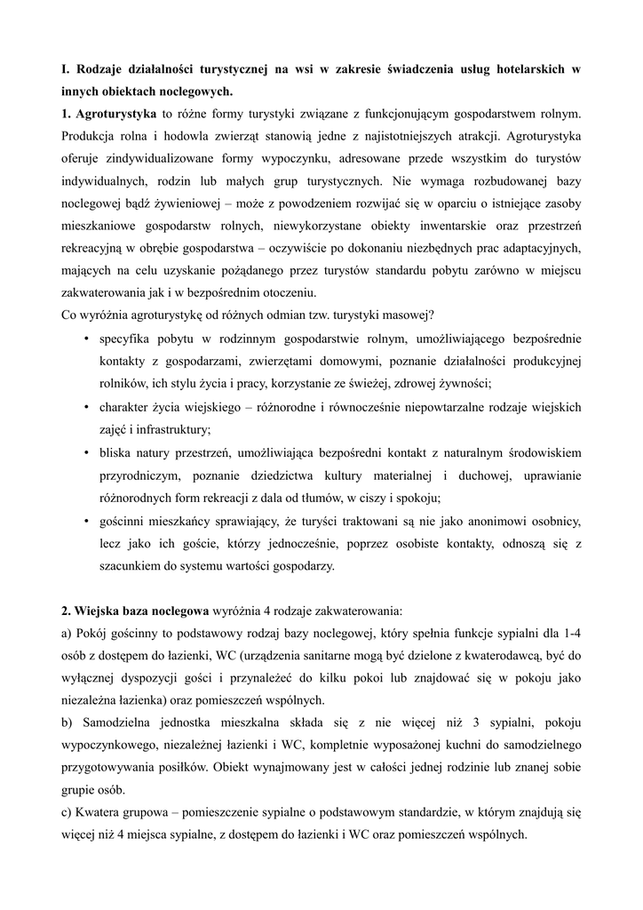 I. Rodzaje działalności turystycznej na wsi w zakresie świadczenia usług hotelarskich w innych obiektach noclegowych. 1. Agroturystyka to różne formy turystyki związane z funkcjonującym gospodarstwem rolnym. Produkcja rolna i hodowla zwierząt stanowią jedne z najistotniejszych atrakcji. Agroturystyka oferuje zindywidualizowane formy wypoczynku, adresowane przede wszystkim do turystów indywidualnych, rodzin lub małych grup turystycznych. Nie wymaga rozbudowanej bazy noclegowej bądź żywieniowej – może z powodzeniem rozwijać się w oparciu o istniejące zasoby mieszkaniowe gospodarstw rolnych, niewykorzystane obiekty inwentarskie oraz przestrzeń rekreacyjną w obrębie gospodarstwa – oczywiście po dokonaniu niezbędnych prac adaptacyjnych, mających na celu uzyskanie pożądanego przez turystów standardu pobytu zarówno w miejscu zakwaterowania jak i w bezpośrednim otoczeniu. Co wyróżnia agroturystykę od różnych odmian tzw. turystyki masowej? • specyfika pobytu w rodzinnym gospodarstwie rolnym, umożliwiającego bezpośrednie kontakty z gospodarzami, zwierzętami domowymi, poznanie działalności produkcyjnej rolników, ich stylu życia i pracy, korzystanie ze świeżej, zdrowej żywności; • charakter życia wiejskiego – różnorodne i równocześnie niepowtarzalne rodzaje wiejskich zajęć i infrastruktury; • bliska natury przestrzeń, umożliwiająca bezpośredni kontakt z naturalnym środowiskiem przyrodniczym, poznanie dziedzictwa kultury materialnej i duchowej, uprawianie różnorodnych form rekreacji z dala od tłumów, w ciszy i spokoju; • gościnni mieszkańcy sprawiający, że turyści traktowani są nie jako anonimowi osobnicy, lecz jako ich goście, którzy jednocześnie, poprzez osobiste kontakty, odnoszą się z szacunkiem do systemu wartości gospodarzy. 2. Wiejska baza noclegowa wyróżnia 4 rodzaje zakwaterowania: a) Pokój gościnny to podstawowy rodzaj bazy noclegowej, który spełnia funkcje sypialni dla 1-4 osób z dostępem do łazienki, WC (urządzenia sanitarne mogą być dzielone z kwaterodawcą, być do wyłącznej dyspozycji gości i przynależeć do kilku pokoi lub znajdować się w pokoju jako niezależna łazienka) oraz pomieszczeń wspólnych. b) Samodzielna jednostka mieszkalna składa się z nie więcej niż 3 sypialni, pokoju wypoczynkowego, niezależnej łazienki i WC, kompletnie wyposażonej kuchni do samodzielnego przygotowywania posiłków. Obiekt wynajmowany jest w całości jednej rodzinie lub znanej sobie grupie osób. c) Kwatera grupowa – pomieszczenie sypialne o podstawowym standardzie, w którym znajdują się więcej niż 4 miejsca sypialne, z dostępem do łazienki i WC oraz pomieszczeń wspólnych. d) Przyzagrodowe pola namiotowe podlegają systemowi kategoryzacji tylko wówczas, gdy stanowią dodatkową formę zakwaterowania w obiekcie, który dysponuje pokojami gościnnymi, jednostkami mieszkalnymi lub kwaterami grupowymi. Oferują turystom miejsce na ustawienie namiotu lub przyczepy kempingowej, dostęp do punktu poboru wody i do WC. II. Definicja działalności gospodarczej, przedsiębiorcy, rolnika. Ustawa z dnia 2 lipca 2004 r. o swobodzie działalności gospodarczej (Dz. U. Nr 173 poz.1807), definiuje pojęcie działalności gospodarczej i pojęcie przedsiębiorcy. Działalnością gospodarczą w rozumieniu art. 2 ust. 1 tej ustawy jest działalność spełniająca następujące cechy łącznie: • zarobkowa, • mieszcząca się w jednym z przedmiotowych działów - wytwórcza, handlowa, budowlana, usługowa oraz poszukiwanie, rozpoznawanie i wydobywanie kopalin ze złóż, • wykonywana w sposób zorganizowany, • wykonywana w sposób ciągły. Przedsiębiorcą jest osoba fizyczna, osoba prawna oraz jednostka organizacyjna niebędąca osobą prawną, której odrębna ustawa przyznaje zdolność prawną (np. spółka jawna według kodeksu spółek handlowych, która nie ma osobowości prawnej, ale może np. pozywać i być pozywana przed sądem), która podejmuje i wykonuje działalność gospodarczą we własnym imieniu (co oznacza zwykle także działalność także na własny rachunek – z odpowiedzialnością za skutki gospodarcze tej działalności). Przedsiębiorcą jest także każdy ze wspólników spółki cywilnej, w zakresie prowadzonej przez nich w ramach tej spółki działalności. Przepisów tej ustawy nie stosuje się do działalności wytwórczej w rolnictwie w zakresie upraw rolnych oraz chowu i hodowli zwierząt, ogrodnictwa, warzywnictwa, leśnictwa i rybactwa śródlądowego, a także wynajmowania przez rolników pokoi, sprzedaży posiłków domowych i świadczenia w gospodarstwach rolnych innych usług związanych z pobytem turystów. Zatem osoby rozpoczynające świadczenie usług agroturystycznych nie podlegają przepisom ustawy o swobodzie działalności gospodarczej, zgodnie z brzmieniem jej art. 3, w związku z czym agroturystyka nie wymaga zgłaszania do ewidencji gospodarczej. Zakres usług agroturystycznych obejmuje wynajmowanie pokoi (a zatem nie odrębnych miejsc noclegowych, całych domów, czy domków turystycznych, przyczep mieszkalnych itp.), sprzedaż posiłków domowych (nie zaś prowadzenie innych ogólnodostępnych usług gastronomicznych, także w zakresie tzw. małej gastronomii) i wreszcie świadczenie innych usług związanych z pobytem turystów. Te inne usługi powinny być świadczone w gospodarstwie rolnym i związane z pobytem turystów w tym gospodarstwie. Wynajmowanie miejsc na ustawienie namiotów, jest niewątpliwie usługą związaną z pobytem turystów (osób korzystających z noclegu), a zatem może być objęte wyłączeniem spod działania ustawy o swobodzie działalności gospodarczej. Za rolnika uznaje się pełnoletnią osobę fizyczną, zamieszkującą i prowadzącą na terytorium Rzeczypospolitej Polskiej, osobiście i na własny rachunek, działalność rolniczą w pozostającym w jej posiadaniu gospodarstwie rolnym, w tym rów