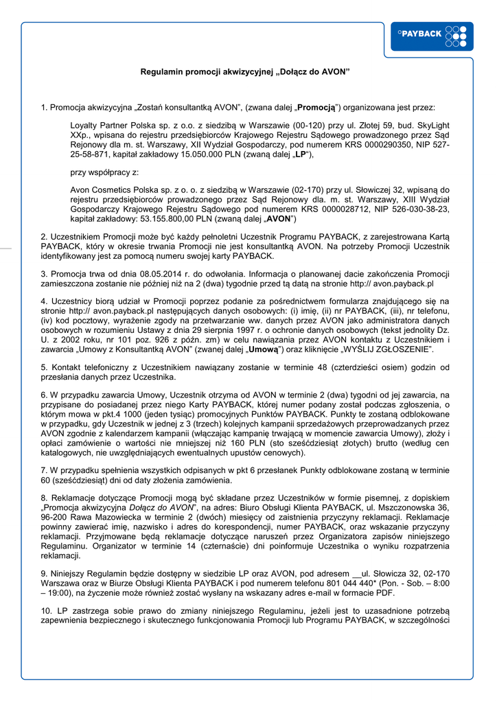 Regulamin promocji akwizycyjnej „Dołącz do AVON” 1. Promocja akwizycyjna „Zostań konsultantką AVON”, (zwana dalej „Promocją”) organizowana jest przez: Loyalty Partner Polska sp. z o.o. z siedzibą w Warszawie (00-120) przy ul. Złotej 59, bud. SkyLight XXp., wpisana do rejestru przedsiębiorców Krajowego Rejestru Sądowego prowadzonego przez Sąd Rejonowy dla m. st. Warszawy, XII Wydział Gospodarczy, pod numerem KRS 0000290350, NIP 52725-58-871, kapitał zakładowy 15.050.000 PLN (zwaną dalej „LP“), przy współpracy z: Avon Cosmetics Polska sp. z o. o. z siedzibą w Warszawie (02-170) przy ul. Słowiczej 32, wpisaną do rejestru przedsiębiorców prowadzonego przez Sąd Rejonowy dla. m. st. Warszawy, XIII Wydział Gospodarczy Krajowego Rejestru Sądowego pod numerem KRS 0000028712, NIP 526-030-38-23, kapitał zakładowy: 53.155.800,00 PLN (zwaną dalej „AVON”) 2. Uczestnikiem Promocji może być każdy pełnoletni Uczestnik Programu PAYBACK, z zarejestrowana Kartą PAYBACK, który w okresie trwania Promocji nie jest konsultantką AVON. Na potrzeby Promocji Uczestnik identyfikowany jest za pomocą numeru swojej karty PAYBACK. 3. Promocja trwa od dnia 08.05.2014 r. do odwołania. Informacja o planowanej dacie zakończenia Promocji zamieszczona zostanie nie później niż na 2 (dwa) tygodnie przed tą datą na stronie http:// avon.payback.pl 4. Uczestnicy biorą udział w Promocji poprzez podanie za pośrednictwem formularza znajdującego się na stronie http:// avon.payback.pl następujących danych osobowych: (i) imię, (ii) nr PAYBACK, (iii), nr telefonu, (iv) kod pocztowy, wyrażenie zgody na przetwarzanie ww. danych przez AVON jako administratora danych osobowych w rozumieniu Ustawy z dnia 29 sierpnia 1997 r. o ochronie danych osobowych (tekst jednolity Dz. U. z 2002 roku, nr 101 poz. 926 z późn. zm) w celu nawiązania przez AVON kontaktu z Uczestnikiem i zawarcia „Umowy z Konsultantką AVON” (zwanej dalej „Umową”) oraz kliknięcie „WYŚLIJ ZGŁOSZENIE”. 5. Kontakt telefoniczny z Uczestnikiem nawiązany zostanie w terminie 48 (czterdzieści osiem) godzin od przesłania danych przez Uczestnika. 6. W przypadku zawarcia Umowy, Uczestnik otrzyma od AVON w terminie 2 (dwa) tygodni od jej zawarcia, na przypisane do posiadanej przez niego Karty PAYBACK, której numer podany został podczas zgłoszenia, o którym mowa w pkt.4 1000 (jeden tysiąc) promocyjnych Punktów PAYBACK. Punkty te zostaną odblokowane w przypadku, gdy Uczestnik w jednej z 3 (trzech) kolejnych kampanii sprzedażowych przeprowadzanych przez AVON zgodnie z kalendarzem kampanii (włączając kampanię trwającą w momencie zawarcia Umowy), złoży i opłaci zamówienie o wartości nie mniejszej niż 160 PLN (sto sześćdziesiąt złotych) brutto (według cen katalogowych, nie uwzględniających ewentualnych upustów cenowych). 7. W przypadku spełnienia wszystkich odpisanych w pkt 6 przesłanek Punkty odblokowane zostaną w terminie 60 (sześćdziesiąt) dni od daty złożenia zamówienia. 8. Reklamacje dotyczące Promocji mogą być składane przez Uczestników w formie pisemnej, z dopiskiem „Promocja akwizycyjna Dołącz do AVON”, na adres: Biuro Obsługi Klienta PAYBACK, ul. Mszczonowska 36, 96-200 Rawa Mazowiecka w terminie 2 (dwóch) miesięcy od zaistnienia przyczyny reklamacji. Reklamacje powinny zawierać imię, nazwisko i adres do korespondencji, numer PAYBACK, oraz wskazanie przyczyny reklamacji. Przyjmowane będą reklamacje dotyczące naruszeń przez Organizatora zapisów niniejszego Regulaminu. Organizator w terminie 14 (czternaście) dni poinformuje Uczestnika o wyniku rozpatrzenia reklamacji. 9. Niniejszy Regulamin będzie dostępny w siedzibie LP oraz AVON, pod adresem __ul. Słowicza 32, 02-170 Warszawa oraz w Biurze Obsługi Klienta PAYBACK i pod numerem telefonu 801 044 440* (Pon. - Sob. – 8:00 – 19:00), na życzenie może również zostać wysłany na wskazany adres e-mail w formacie PDF. 10. LP zastrzega sobie prawo do zmiany niniejszego Regulaminu, jeżeli jest to uzasadnione potrzebą zapewnienia bezpiecznego i skutecznego funkcjonowania Promocji lub Programu PAYBACK, w szczególności zapobiegania nadużyciom, w Zmiany Regulaminu nie będą mieć negatywnego wpływu na prawa nabyte Uczestników i wchodzą w życie z chwilą ogłoszenia nowego brzmienia Regulaminu na stronie http://avon.payback.pl 11. LP zobowiązuje się do przesłania pisemnego uzasadnienia wprowadzonych zmian na podany przez Uczestnika adres e-mail w przypadku stwierdzenia przez Uczestnika naruszenia jego praw lub róznicowania jego sytuacji względem innych Uczestników z powodu wprowadzonych w Regulaminie zmian. *opłata za połączenie zgodna z taryfą operatora