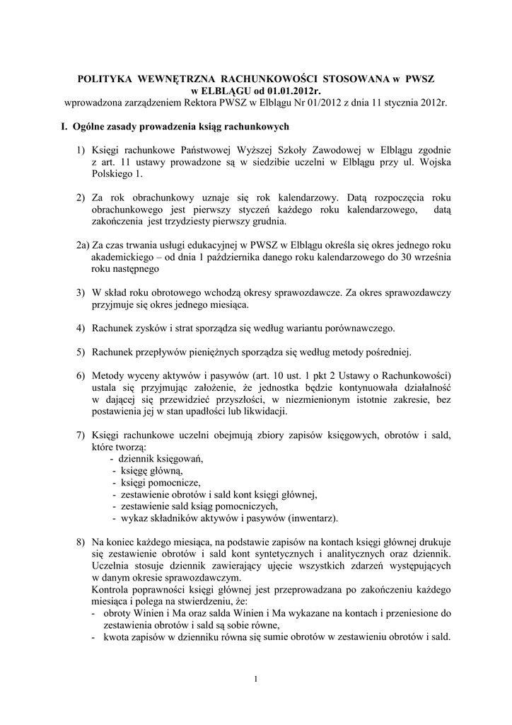 POLITYKA WEWNĘTRZNA RACHUNKOWOŚCI STOSOWANA w PWSZ w ELBLĄGU od 01.01.2012r. wprowadzona zarządzeniem Rektora PWSZ w Elblągu Nr 01/2012 z dnia 11 stycznia 2012r. I. Ogólne zasady prowadzenia ksiąg rachunkowych 1) Księgi rachunkowe Państwowej WyŜszej Szkoły Zawodowej w Elblągu zgodnie z art. 11 ustawy prowadzone są w siedzibie uczelni w Elblągu przy ul. Wojska Polskiego 1. 2) Za rok obrachunkowy uznaje się rok kalendarzowy. Datą rozpoczęcia roku obrachunkowego jest pierwszy styczeń kaŜdego roku kalendarzowego, datą zakończenia jest trzydziesty pierwszy grudnia. 2a) Za czas trwania usługi edukacyjnej w PWSZ w Elblągu określa się okres jednego roku akademickiego – od dnia 1 października danego roku kalendarzowego do 30 września roku następnego 3) W skład roku obrotowego wchodzą okresy sprawozdawcze. Za okres sprawozdawczy przyjmuje się okres jednego miesiąca. 4) Rachunek zysków i strat sporządza się według wariantu porównawczego. 5) Rachunek przepływów pienięŜnych sporządza się według metody pośredniej. 6) Metody wyceny aktywów i pasywów (art. 10 ust. 1 pkt 2 Ustawy o Rachunkowości) ustala się przyjmując załoŜenie, Ŝe jednostka będzie kontynuowała działalność w dającej się przewidzieć przyszłości, w niezmienionym istotnie zakresie, bez postawienia jej w stan upadłości lub likwidacji. 7) Księgi rachunkowe uczelni obejmują zbiory zapisów księgowych, obrotów i sald, które tworzą: - dziennik księgowań, - księgę główną, - księgi pomocnicze, - zestawienie obrotów i sald kont księgi głównej, - zestawienie sald ksiąg pomocniczych, - wykaz składników aktywów i pasywów (inwentarz). 8) Na koniec kaŜdego miesiąca, na podstawie zapisów na kontach księgi głównej drukuje się zestawienie obrotów i sald kont syntetycznych i analitycznych oraz dziennik. Uczelnia stosuje dziennik zawierający ujęcie wszystkich zdarzeń występujących w danym okresie sprawozdawczym. Kontrola poprawności księgi głównej jest przeprowadzana po zakończeniu kaŜdego miesiąca i polega na stwierdzeniu, Ŝe: - obroty Winien i Ma oraz salda Winien i Ma wykazane na kontach i przeniesione do zestawienia obrotów i sald są sobie równe, - kwota zapisów w dzienniku równa się sumie obrotów w zestawieniu obrotów i sald. 1 Spełnienie tych zgodności dowodzi, Ŝe Ŝaden dokument wprowadzony do systemu nie został pominięty oraz została zachowana zasada podwójnego zapisu. 9) Konta ksiąg pomocniczych słuŜą do uszczegółowienia i uzupełnienia zapisów kont księgi głównej. W uczelni prowadzi się konta ksiąg pomocniczych dla: - wartości niematerialnych i prawnych, - środków trwałych oraz dokonywanych od nich odpisów amortyzacyjnych i umorzeniowych, - środków trwałych w budowie, - rozrachunków z kontrahentami, - rozrachunków z budŜetem, - rozrachunków z pracownikami, - rozrachunków ze studentami, - operacji sprzedaŜy (przychodów), - kosztów i innych istotnych operacji związanych z działalnością, - operacji gotówkowych. Konta ksiąg pomocniczych uzgadnia się z saldami i zapisami na kontach księgi głównej na koniec kaŜdego miesiąca. 10 ) Podstawą zapisów księgowych w księgach rachunkowych uczelni jest dowód księgowy, który odzwierciedla treść operacji i zdarzenia gospodarcze podlegające ewidencji księgowej. Obieg dowodów księgowych związanych z gospodarką finansową PWSZ w Elblągu opisany jest w załączniku nr 2. Dowód księgowy powinien zawierać co najmniej: - określenie rodzaju dowodu, - określenie stron ( nazwy, adresy ) dokumentujących operacje gospodarcze, - datę wystawienia, przedmiot operacji gospodarczej, wartość i ilościowe określenie przedmiotu operacji, jeŜeli jest wymieniony w jednostkach naturalnych, - własnoręczny podpis osób odpowiedzialnych za prawidłowe dokonanie operacji gospodarczej i jej prawidłowe udokumentowanie, - sprawdzony pod względem merytorycznym, formalno-rachunkowym i na dowód sprawdzenia podpisany przez osoby dokonujące kontroli oraz zaakceptowany przez dysponentów środków, - dekretację wydatków ukierunkowaną na rodzaj działalności, zadania lub umowy, - numer identyfikacyjny dowodu. Dowody księgowe powinny być wystawiane w sposób staranny, czytelny i trwały, treść dowodu powinna być pełna i zrozumiała. Niedopuszczalne są poprawki w dowodach obcych, które mogą być sprostowane jedynie przez wystawienie i przesłanie kontrahentowi dowodu korygującego. 2 Dowody wewnętrzne poprawia się przez skreślenie błędnej treści lub kwoty z utrzymaniem czytelności zapisu i wpisanie treści poprawionej oraz naniesienie daty dokonanej poprawki i złoŜenia podpisu. Nie powinno się poprawiać pojedynczych liter lub cyfr lecz całe wyrazy lub kwoty. Dowód księgowy powinien być sporządzony w języku polskim lub w języku obcym, jeŜeli dotyczy realizacji operacji gospodarczych z kontrahentem zagranicznym. Dowód księgowy winien w sposób jednoznaczny i zrozumiały dokumentować zaistniałe zdarzenie gospodarcze. 11) W dokumentowaniu zapisów w księgach rachunkowych mogą być stosowane dowody zastępcze, stanowiące potwierdzenie dokonania i rozliczenia zakupu materiałów. Nie moŜe to jednak dotyczyć skupu od ludności metali nieŜelaznych oraz operacji gospodarczych, których przedmiotem są zakupy opodatkowane podatkiem od towarów i usług. Dowód zastępczy powinien zawierać: - datę dokonania operacji gospodarczej, - miejsce i datę wystawienia dowodu, - przedmiot, ilość, cenę i wartość dokonywanego zakupu, - nazwisko i imię oraz podpis osoby uczestniczącej bezpośrednio w transakcji, - akcept osoby zlecającej dokonanie zakupu. Maksymalna wartość transakcji udokumentowanej dowodem zastępczym nie moŜe przekroczyć kwoty 350,00 złotych. 12) Do wyceny majątku uczelni stosuje się cenę nabycia, która jest ceną zakupu składnika aktywów i obejmuje kwotę naleŜną sprzedającemu razem z podatkiem V