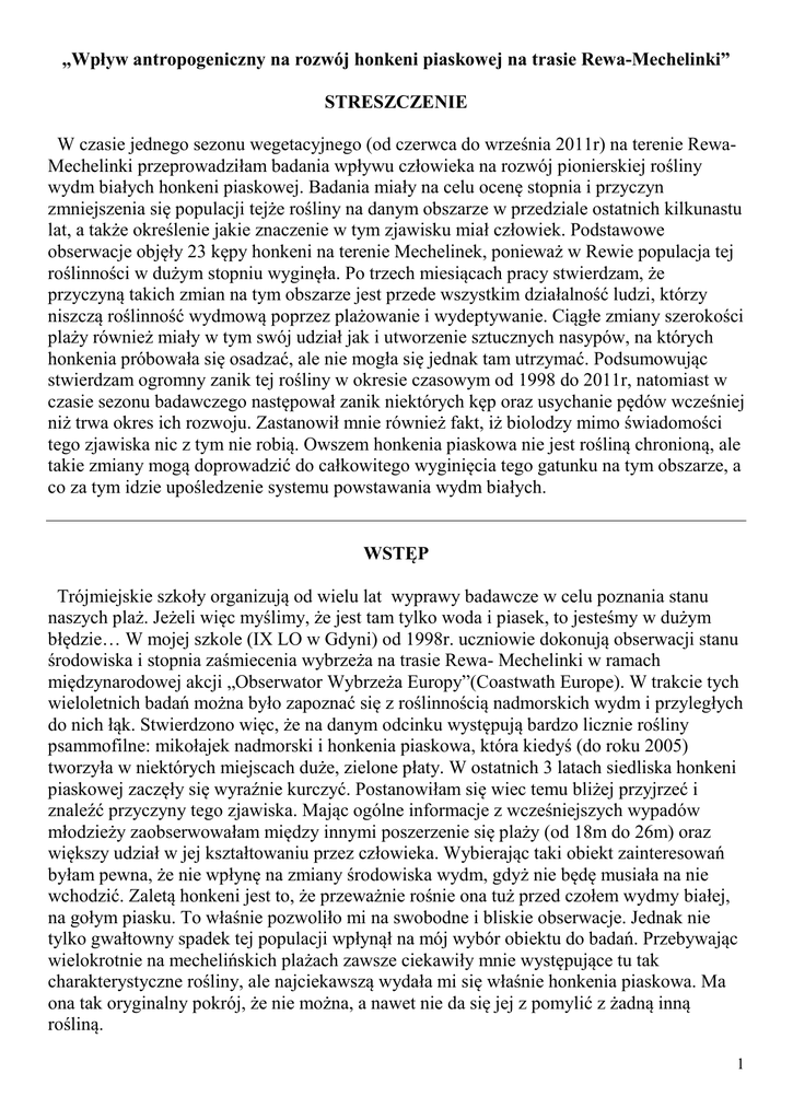 „Wpływ antropogeniczny na rozwój honkeni piaskowej na trasie Rewa-Mechelinki” STRESZCZENIE W czasie jednego sezonu wegetacyjnego (od czerwca do września 2011r) na terenie RewaMechelinki przeprowadziłam badania wpływu człowieka na rozwój pionierskiej rośliny wydm białych honkeni piaskowej. Badania miały na celu ocenę stopnia i przyczyn zmniejszenia się populacji tejże rośliny na danym obszarze w przedziale ostatnich kilkunastu lat, a także określenie jakie znaczenie w tym zjawisku miał człowiek. Podstawowe obserwacje objęły 23 kępy honkeni na terenie Mechelinek, ponieważ w Rewie populacja tej roślinności w dużym stopniu wyginęła. Po trzech miesiącach pracy stwierdzam, że przyczyną takich zmian na tym obszarze jest przede wszystkim działalność ludzi, którzy niszczą roślinność wydmową poprzez plażowanie i wydeptywanie. Ciągłe zmiany szerokości plaży również miały w tym swój udział jak i utworzenie sztucznych nasypów, na których honkenia próbowała się osadzać, ale nie mogła się jednak tam utrzymać. Podsumowując stwierdzam ogromny zanik tej rośliny w okresie czasowym od 1998 do 2011r, natomiast w czasie sezonu badawczego następował zanik niektórych kęp oraz usychanie pędów wcześniej niż trwa okres ich rozwoju. Zastanowił mnie również fakt, iż biolodzy mimo świadomości tego zjawiska nic z tym nie robią. Owszem honkenia piaskowa nie jest rośliną chronioną, ale takie zmiany mogą doprowadzić do całkowitego wyginięcia tego gatunku na tym obszarze, a co za tym idzie upośledzenie systemu powstawania wydm białych. WSTĘP Trójmiejskie szkoły organizują od wielu lat wyprawy badawcze w celu poznania stanu naszych plaż. Jeżeli więc myślimy, że jest tam tylko woda i piasek, to jesteśmy w dużym błędzie… W mojej szkole (IX LO w Gdyni) od 1998r. uczniowie dokonują obserwacji stanu środowiska i stopnia zaśmiecenia wybrzeża na trasie Rewa- Mechelinki w ramach międzynarodowej akcji „Obserwator Wybrzeża Europy”(Coastwath Europe). W trakcie tych wieloletnich badań można było zapoznać się z roślinnością nadmorskich wydm i przyległych do nich łąk. Stwierdzono więc, że na danym odcinku występują bardzo licznie rośliny psammofilne: mikołajek nadmorski i honkenia piaskowa, która kiedyś (do roku 2005) tworzyła w niektórych miejscach duże, zielone płaty. W ostatnich 3 latach siedliska honkeni piaskowej zaczęły się wyraźnie kurczyć. Postanowiłam się wiec temu bliżej przyjrzeć i znaleźć przyczyny tego zjawiska. Mając ogólne informacje z wcześniejszych wypadów młodzieży zaobserwowałam między innymi poszerzenie się plaży (od 18m do 26m) oraz większy udział w jej kształtowaniu przez człowieka. Wybierając taki obiekt zainteresowań byłam pewna, że nie wpłynę na zmiany środowiska wydm, gdyż nie będę musiała na nie wchodzić. Zaletą honkeni jest to, że przeważnie rośnie ona tuż przed czołem wydmy białej, na gołym piasku. To właśnie pozwoliło mi na swobodne i bliskie obserwacje. Jednak nie tylko gwałtowny spadek tej populacji wpłynął na mój wybór obiektu do badań. Przebywając wielokrotnie na mechelińskich plażach zawsze ciekawiły mnie występujące tu tak charakterystyczne rośliny, ale najciekawszą wydała mi się właśnie honkenia piaskowa. Ma ona tak oryginalny pokrój, że nie można, a nawet nie da się jej z pomylić z żadną inną rośliną. 1 MATERIAŁ I METODY ORAZ OBSZAR BADAŃ Główne dane zbierane były na terenie Rewa- Mechelinki o długości ponad 3km , na plaży przyległej do rezerwatu „Mechlińskie łąki”, a dane porównawcze pochodzą z obszarów pobliskich do tych dwóch miejscowości w woj. Pomorskim(nr.2 i 3), co daje nam ponad 10km terenu badań. Swoje badania rozpoczęłam 14 czerwca 2011 roku i kontynuowałam je w odstępie mniej więcej miesiąca aż do 4 września 2011 roku (14 czerwiec, 30 czerwiec, 2 sierpień i 4 wrzesień). Obszarem moich badań był nadmorski odcinek trasy Rewa- Mechelinki. Oprócz terenu, który objęłam obserwacją dokonałam także jednorazowego badania (4 września 2011roku) na terenach przyległych: w Pierwoszynie gdzie plaża jest kamienista i trudniej dostępna dla ludzi oraz między Rewą a rezerwatem przyrody „Beka” odwiedzaną głównie przez wędkarzy, ornitologów i przypadkowych turystów. Metodą moich badań było oznaczanie kolejnymi numerami skupisk honkeni paskowej i nadawanie im charakterystycznych nazw. W kolejnych etapach wyznaczałam zajmujące przez nie obszary i przyrównywałam je do figur geometrycznych, gdzie następnie liczyłam ich pola powierzchni, wysokość łodyg za pomocą metrowej miarki oraz średnią gęstość. OPIS HONKENI: Honkrenia piaskowa( Honckenya peploides) należy do roślin halofilnych porastających podłoże charakteryzujące się dużym zasoleniem [Łabuz T. 2002]. Zaliczana jest ona do roślin klasy dwuliściennych(Magnoliopdsida) z rzędu i rodziny goździkowatych. Jest to bylina o rozesłanej, gęsto ulistnionej łodydze, dorastającej do 15-30cm. Liście jej są siedzące, odstające od łodygi, o blaszkach mięsistych, ułożone naprzeciwlegle i u podstawy zrośnięte. Są one uszeregowane w 4 rzędy [Podbielkowski Zb.1962]. Kwiaty ma drobne, zielonkawobiałe lub różowawe, umieszczone na krótkich szypułkach, pojedynczo w kątach liści i w rozwidleniach łodyg. Owoce natomiast są mięsiste i kuliste. Okres kwitnienia przypada od czerwca do lipca. Rośnie ona na piaszczystym wybrzeżu, na plaży i na wydmach. Występuje dość pospolicie wzdłuż całego wybrzeża Bałtyku w strefie umiarkowanej między 30 i 80 stopniem szerokości geograficznej [Kosińska R. i Kosiński M.]. Zapylenie honkeni następuje za pośrednictwem pędzonego przez wiatr piasku, rzadziej przez owady: niekiedy możliwe jest również samozapylenie. Roślina ta odgrywa ważna rolę w stabilizacji ruchomego piasku i zarastaniu wydm nadmorskich, jest 