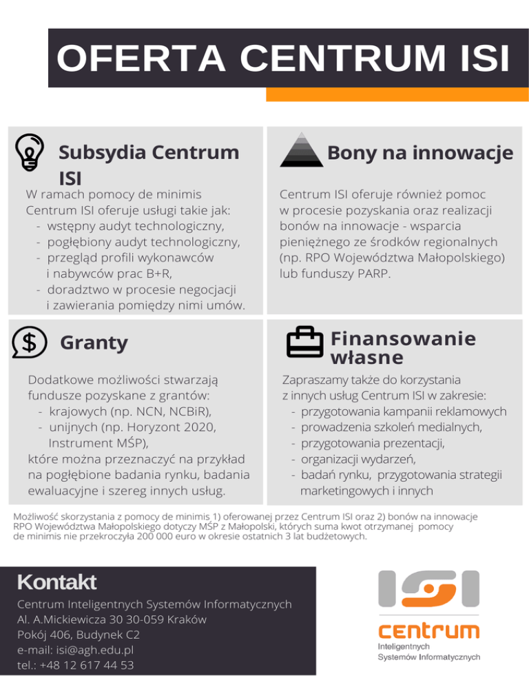 OFERTA CENTRUM ISI Subsydia Centrum ISI W ramach pomocy de minimis Centrum ISI oferuje usługi takie jak: - wstępny audyt technologiczny, - pogłębiony audyt technologiczny, - przegląd profili wykonawców i nabywców prac B+R, - doradztwo w procesie negocjacji i zawierania pomiędzy nimi umów. Bony na innowacje Centrum ISI oferuje również pomoc w procesie pozyskania oraz realizacji bonów na innowacje - wsparcia pieniężnego ze środków regionalnych (np. RPO Województwa Małopolskiego) lub funduszy PARP. Finansowanie własne Granty Dodatkowe możliwości stwarzają fundusze pozyskane z grantów: - krajowych (np. NCN, NCBiR), - unijnych (np. Horyzont 2020, Instrument MŚP), które można przeznaczyć na przykład na pogłębione badania rynku, badania ewaluacyjne i szereg innych usług. Zapraszamy także do korzystania z innych usług Centrum ISI w zakresie: - przygotowania kampanii reklamowych - prowadzenia szkoleń medialnych, - przygotowania prezentacji, - organizacji wydarzeń, - badań rynku, przygotowania strategii marketingowych i innych Możliwość skorzystania z pomocy de minimis 1) oferowanej przez Centrum ISI oraz 2) bonów na innowacje RPO Województwa Małopolskiego dotyczy MŚP z Małopolski, których suma kwot otrzymanej pomocy de minimis nie przekroczyła 200 000 euro w okresie ostatnich 3 lat budżetowych. Kontakt Centrum Inteligentnych Systemów Informatycznych Al. A.Mickiewicza 30 30-059 Kraków Pokój 406, Budynek C2 e-mail: [email protected] tel.: +48 12 617 44 53