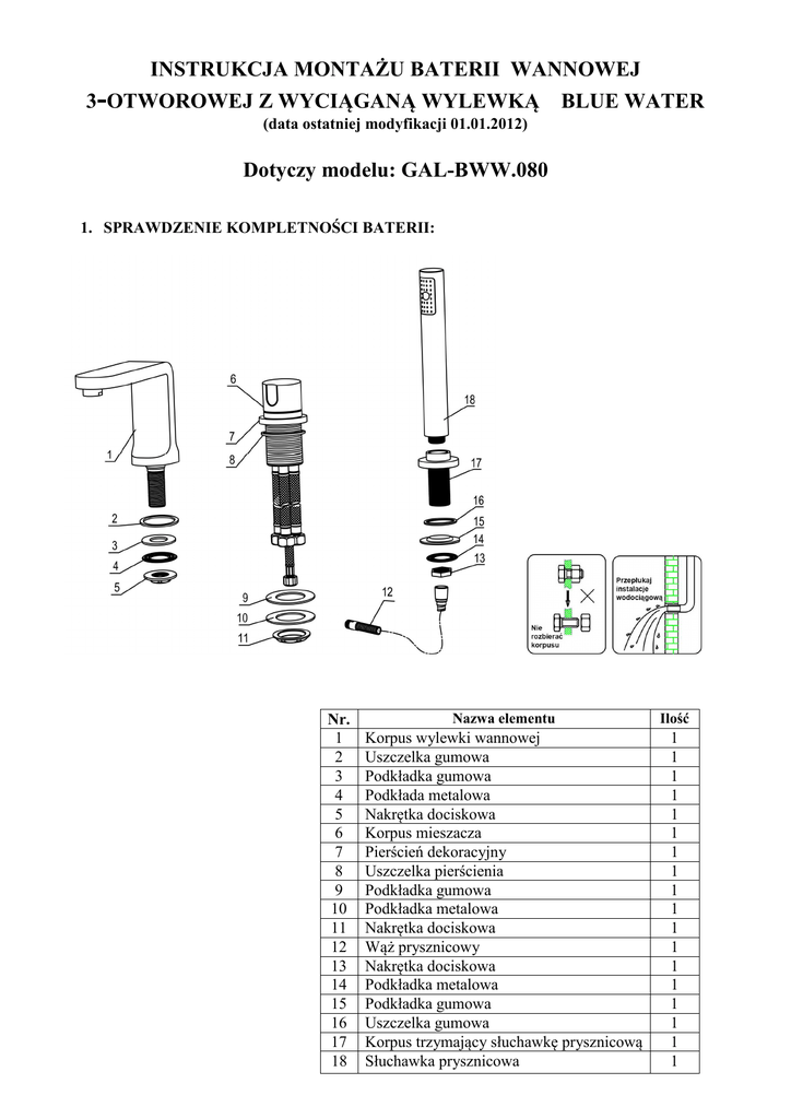 INSTRUKCJA MONTAŻU BATERII WANNOWEJ 3-OTWOROWEJ Z WYCIĄGANĄ WYLEWKĄ BLUE WATER (data ostatniej modyfikacji 01.01.2012) Dotyczy modelu: GAL-BWW.080 1. SPRAWDZENIE KOMPLETNOŚCI BATERII: Nr. 1 2 3 4 5 6 7 8 9 10 11 12 13 14 15 16 17 18 Nazwa elementu Ilość Korpus wylewki wannowej Uszczelka gumowa Podkładka gumowa Podkłada metalowa Nakrętka dociskowa Korpus mieszacza Pierścień dekoracyjny Uszczelka pierścienia Podkładka gumowa Podkładka metalowa Nakrętka dociskowa Wąż prysznicowy Nakrętka dociskowa Podkładka metalowa Podkładka gumowa Uszczelka gumowa Korpus trzymający słuchawkę prysznicową Słuchawka prysznicowa 1 1 1 1 1 1 1 1 1 1 1 1 1 1 1 1 1 1 2. UWAGA ! - Przed przystąpieniem do montażu baterii należy się upewnić w prawidłowości podłączeń rur zasilających w gorącą i zimną wodę. Jeżeli znajdujesz się przed baterią, wyjście gorącej wody powinno znajdować się z lewej strony, a zimnej z prawej strony. - Upewnij się, że zasilająca instalacja wodociągowa jest zaopatrzona w filtry siatkowe, tak aby do głowicy baterii nie przedostawały się zanieczyszczenia takie jak: piasek, rdza, kamień kotłowy lub inne. - Przepłukać instalację wodociągową 3. INSTRUKCJA MONTAŻU BATERII: Przed instalacją upewnij się, że: grubość wanny i otwory są odpowiednie. - W wannie należy wykonać 3 otwory: Ø 26-28 mm dla wylewki wannowej Ø 46-48 mm dla mieszacza wody gorącej i zimnej Ø 28-30 mm dla elementu trzymającego wylewkę prysznicową Ważne: Należy zwrócić uwagę żeby odstępy między otworami nie były zbyt duże, aby długość wężyków pozwoliła połączyć poszczególne elementy baterii (wylewkę wannową z mieszaczem i wylewką prysznicową). INSTALACJA WYLEWKI WANNOWEJ: - Z korpusu wylewki wannowej (1) odkręcić nakrętkę dociskową (5), zdejmij podkładkę metalową (4) oraz podkładkę gumową (3). Nie zdejmuj uszczelki gumowej (2). - Następnie należy włożyć korpus (1) do otworu w wannie, założyć podkładkę gumową (3), podkładkę metalową (4). - Za pomocą klucza płaskiego przykręcić nakrętkę dociskową (5). INSTALACJA MIESZACZA: - Z korpusu mieszacza (6) zdejmij nakrętkę dociskową (11). - Na korpus (6) załóż pierścień dekoracyjny (7) oraz uszczelkę pierścienia (8). - W otwór wanny włóż korpus mieszacza (6) wraz z wężykami. - Załóż podkładkę gumową (9), a następnie podkładkę metalową (10) i nakręć nakrętkę dociskową (11). - Przy pomocy klucza płaskiego dokręć podkładkę dociskową (11). INSTALACJA ELEMENTU TRZYMAJĄCEGO WYLEWKĘ PRYSZNICOWĄ: - Zdejmij z korpusu trzymającego słuchawkę prysznicową (17) elementy: nakrętkę dociskową (13) podkładkę metalową (14) podkładkę gumową (15) Nie zdejmuj uszczelki gumowej (16). - Włóż element (17) do otworu w wannie i załóż w odwrotnej kolejności zdjęte elementy. - Przy pomocy klucza płaskiego dokręć nakrętkę dociskową (13). INSTALACJA KOŃCOWA: - Zgodnie z rysunkiem podłącz wężyki zasilające (pamiętając o uszczelkach) do zaworków kątowych). Z lewej strony gorąca woda, z prawej zimna. - Wężyk (spout) połącz z korpusem wylewki (1). - W korpus (17) włóż końcówkę węża prysznicowego (12) i drugi koniec węża (12) połącz z końcówką najdłuższego węża (shower). - Nie przykręcać na razie słuchawki prysznicowej (18). - Po zakończeniu montażu przepłukać baterię, wcześniej odkręcając perlator z korpusu wylewki (1). - Po przepłukaniu baterii oraz węża prysznicowego (12), przykręcić słuchawkę prysznicową (18). Zwrócić uwagę aby wężyki nie były załamane i były w nich uszczelki. Sprawdzić prawidłowość połączenia wszystkich elementów, a w przypadku wykrycia nieszczelności dokręcić złączki, aż do uzyskania szczelnego połączenia. Bateria powinna być zamontowana w sposób umożliwiający swobodny dostęp do wszystkich elementów montażowych. Otwieranie i zamykanie, oraz przełączanie strumienia wody zgodnie z rysunkami. Ciśnienie robocze wody: do 6 atmosfer – przy wyższym ciśnieniu zastosować reduktor ciśnienia. Temperatura wody: 4°C - 90°C. UWAGA! Niniejsza instrukcja jest tylko informacyjna, montażu baterii musi dokonać osoba wykwalifikowana. Zastrzegamy sobie prawo do zmian technicznych. Prosimy zapoznać się z treścią karty gwarancyjnej.