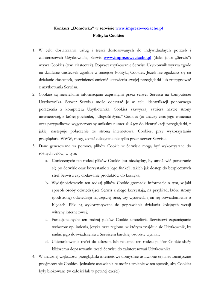 Konkurs „Domówka” w serwisie www.imprezoweciacho.pl Polityka Cookies 1. W celu dostarczania usług i treści dostosowanych do indywidualnych potrzeb i zainteresowań Użytkownika, Serwis www.imprezoweciacho.pl (dalej jako: „Serwis”) używa Cookies (tzw. ciasteczek). Poprzez użytkowanie Serwisu Użytkownik wyraża zgodę na działanie ciasteczek zgodnie z niniejszą Polityką Cookies. Jeżeli nie zgadzasz się na działanie ciasteczek, powinieneś zmienić ustawienia swojej przeglądarki lub zrezygnować z użytkowania Serwisu. 2. Cookies są niewielkimi informacjami zapisanymi przez serwer Serwisu na komputerze Użytkownika. Serwer Serwisu może odczytać je w celu identyfikacji ponownego połączenia z komputera Użytkownika. Cookies zazwyczaj zawiera nazwę strony internetowej, z której pochodzi, „długość życia” Cookies (to znaczy czas jego istnienia) oraz przypadkowo wygenerowany unikalny numer służący do identyfikacji przeglądarki, z jakiej następuje połączenie ze stroną internetową. Cookies, przy wykorzystaniu przeglądarki WWW, mogą zostać odczytane nie tylko przez serwer Serwisu. 3. Dane generowane za pomocą plików Cookie w Serwisie mogą być wykorzystane do różnych celów, w tym: a. Koniecznych: ten rodzaj plików Cookie jest niezbędny, by umożliwić poruszanie się po Serwisie oraz korzystanie z jego funkcji, takich jak dostęp do bezpiecznych stref Serwisu czy dodawanie produktów do koszyka; b. Wydajnościowych: ten rodzaj plików Cookie gromadzi informacje o tym, w jaki sposób osoby odwiedzające Serwis z niego korzystają, na przykład, które strony (podstrony) odwiedzają najczęściej oraz, czy wyświetlają im się powiadomienia o błędach. Pliki są wykorzystywane do poprawienia działania kolejnych wersji witryny internetowej; c. Funkcjonalnych: ten rodzaj plików Cookie umożliwia Serwisowi zapamiętanie wyborów np. imienia, języka oraz regionu, w którym znajduje się Użytkownik, by nadać jego doświadczeniu z Serwisem bardziej osobisty wymiar. d. Ukierunkowanie treści do adresata lub reklama: ten rodzaj plików Cookie służy bliższemu dopasowaniu treści Serwisu do zainteresowań Użytkownika. 4. W znacznej większości przeglądarki internetowe domyślnie ustawione są na automatyczne przyjmowanie Cookies. Jednakże ustawienia te można zmienić w ten sposób, aby Cookies były blokowane (w całości lub w pewnej części). 5. Aby dowiedzieć się więcej o sposobie zarządzania plikami Cookies, należy użyć funkcji Help/Pomoc w swojej przeglądarce internetowej, albo odwiedzić stronę www.aboutcookie.org, która podaje szczegółowe informacje o zarządzaniu plikami Cookie w popularnych przeglądarkach internetowych. Jeśli wyłączysz obsługę plików Cookie, pewne fragmenty Serwisu mogą nie działać poprawnie. 6. Serwis wykorzystuje dwa rodzaje plików Cookies: a. sesyjne (sessions Cookies), tj. pliki tymczasowe, które przechowywane są w urządzeniu końcowym Użytkownika do czasu wylogowania, opuszczenia Serwisu lub wyłączenia oprogramowania (przeglądarki internetowej); b. stałe (persistent Cookies), które są przechowywane są w urządzeniu końcowym Użytkownika przez czas określony w parametrach plików Cookies lub do czasu ich usunięcia przez Użytkownika. 7. Swoją przeglądarkę internetową Użytkownik może przystosować do informowania Użytkownika o tym, kiedy przesyłane są Cookies lub uniemożliwić przesyłanie Cookies. Administrator Serwisu używa ciasteczek w różnych celach: odczytywanie informacji na temat tego, w jaki sposób Użytkownicy poruszają się po stronie internetowej (a co za tym idzie, pomagających ją usprawniać), zapamiętywanie wybranych przez Użytkownika opcji (takich jak na przykład wybrany język strony, wpisane imię etc.), dostosowania zawartości witryny internetowej do potrzeb Użytkownika. Administrator Serwisu zbiera także dane eksploatacyjne informujące o tym, ilu Użytkowników korzysta z Serwisu. 8. Całkowite wyłączenie obsługi plików Cookie może spowodować obniżenie funkcjonalności Serwisu, na przykład uniemożliwienie dostępu do wszystkich jej obszarów bądź nie otrzymywania spersonalizowanych informacji podczas jej przeglądania. 9. Cookies nie mogą zostać wykorzystane do przejęcia danych z urządzenia Użytkownika, przejmowania poczty elektronicznej lub kradzieży osobistych lub poufnych informacji. Korzystanie z Cookies nie pozwala również na przedostawanie się wirusów. 10. Dane sumaryczne zbierane są metodą analizy adresów internetowych IP. Adres IP jest liczbą przypisaną do komputera kontaktującego się z Serwisem. Komputery prezentujące Serwis dokonują automatycznej identyfikacji komputera Użytkownika z wykorzystaniem adresu IP. 11. Sieć Administratora Serwisu zapisuje adres IP w celach administracyjnych, zapewnienia właściwego poziomu bezpieczeństwa oraz w celu badania poziomu zainteresowania Serwisem. Zebrane w ten sposób dane nie będą gromadzone pod kontem weryfikacji, jaki Użytkownik odwiedził Serwis, chyba że udzieli on dobrowolnej i wyraźnej zgody na zbieranie takich informacji.