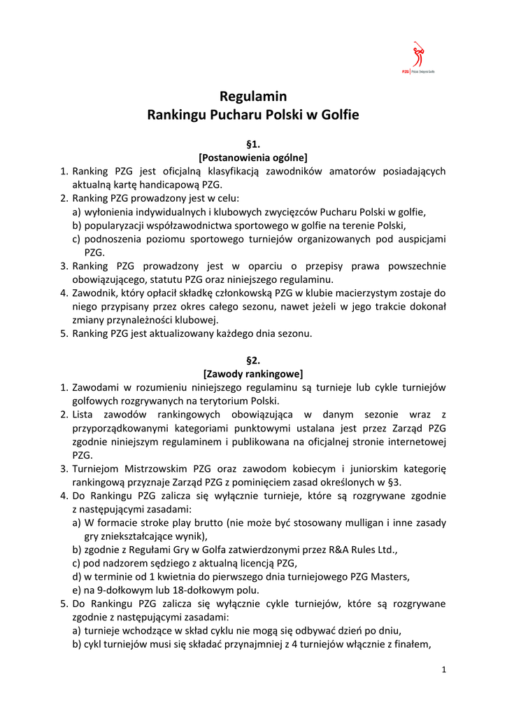 Regulamin Rankingu Pucharu Polski w Golfie 1. 2. 3. 4. 5. 1. 2. 3. 4. 5. §1. [Postanowienia ogólne] Ranking PZG jest oficjalną klasyfikacją zawodników amatorów posiadających aktualną kartę handicapową PZG. Ranking PZG prowadzony jest w celu: a) wyłonienia indywidualnych i klubowych zwycięzców Pucharu Polski w golfie, b) popularyzacji współzawodnictwa sportowego w golfie na terenie Polski, c) podnoszenia poziomu sportowego turniejów organizowanych pod auspicjami PZG. Ranking PZG prowadzony jest w oparciu o przepisy prawa powszechnie obowiązującego, statutu PZG oraz niniejszego regulaminu. Zawodnik, który opłacił składkę członkowską PZG w klubie macierzystym zostaje do niego przypisany przez okres całego sezonu, nawet jeżeli w jego trakcie dokonał zmiany przynależności klubowej. Ranking PZG jest aktualizowany każdego dnia sezonu. §2. [Zawody rankingowe] Zawodami w rozumieniu niniejszego regulaminu są turnieje lub cykle turniejów golfowych rozgrywanych na terytorium Polski. Lista zawodów rankingowych obowiązująca w danym sezonie wraz z przyporządkowanymi kategoriami punktowymi ustalana jest przez Zarząd PZG zgodnie niniejszym regulaminem i publikowana na oficjalnej stronie internetowej PZG. Turniejom Mistrzowskim PZG oraz zawodom kobiecym i juniorskim kategorię rankingową przyznaje Zarząd PZG z pominięciem zasad określonych w §3. Do Rankingu PZG zalicza się wyłącznie turnieje, które są rozgrywane zgodnie z następującymi zasadami: a) W formacie stroke play brutto (nie może być stosowany mulligan i inne zasady gry zniekształcające wynik), b) zgodnie z Regułami Gry w Golfa zatwierdzonymi przez R&A Rules Ltd., c) pod nadzorem sędziego z aktualną licencją PZG, d) w terminie od 1 kwietnia do pierwszego dnia turniejowego PZG Masters, e) na 9-dołkowym lub 18-dołkowym polu. Do Rankingu PZG zalicza się wyłącznie cykle turniejów, które są rozgrywane zgodnie z następującymi zasadami: a) turnieje wchodzące w skład cyklu nie mogą się odbywać dzień po dniu, b) cykl turniejów musi się składać przynajmniej z 4 turniejów włącznie z finałem, 1 c) finał turnieju musi trwać przynajmniej 2 dni. 6. Turnieje wchodzące w skład cyklu turniejów muszą spełniać warunki przewidziane dla turniejów rankingowych wskazane w ust. 4 powyżej. 7. Zarząd PZG może w drodze uchwały nadawać lub zmieniać kategorię rankingową w trakcie trwania sezonu. 1. 2. 3. 4. §3. [Nadawanie kategorii punktowych] Kategorie punktowe nadawane są poszczególnym zawodom na podstawie ich poziomu sportowego oraz liczby uczestniczących zawodników, w oparciu o dane wynikowe z poprzedniego sezonu W celu nadania kategorii punktowej jako narzędzie analityczne, sporządza się Klasyfikację Turniejów na podstawie liczby punktów stableford brutto uzyskanych przez uczestniczących zawodników oraz CR i SR pola golfowego. Premiowane są turnieje trwające dwa dni, które otrzymują dodatkowo 100 punktów stableford brutto do sumy punktów uzyskanych przez zawodników uczestniczących w danym turnieju. W przypadku turnieju trwającego 3 dni lub dłużej premia wynosi 200 pkt stableford brutto. W przypadku cyklów turniejów klasyfikacja rankingowa nadawana jest poprzez uzyskanie średniej arytmetycznej z kategorii punktowych nadanych zgodnie z zasadami w ust. 2 poszczególnym turniejom, wchodzących w skład danego cyklu. Cykle turniejów, w skład których wchodzą turnieje rozgrywane co najmniej w ¾ na różnych polach golfowych premiowane są 100 punktami stableford brutto. Organizatorzy zawodów, którym została nadana kategoria rankingowa (lub znalazły się na liście rezerwowej) przez Zarząd PZG, są zobowiązani pod rygorem utraty kategorii do: a) potwierdzenia organizacji zawodów w nadchodzącym sezonie do dnia 20 marca na adres [email protected], b) utworzenia zawodów w systemie PZG Eagle do dnia 31 marca. §4. [Kategorie rankingowe] 1. Zawody uwzględnione w Rankingu PZG otrzymują następujące kategorie rankingowe: b) “Premium”, c) “Super”, d) I, e) II, f) III, g) IV. 2. W danym sezonie do każdej kategorii rankingowej Zarząd PZG, uwzględniając postanowienia §2 ust. 2, przyporządkowuje następującą liczbę zawodów: 2 a) b) c) d) e) SUPER kategoria rankingowa (1 turniej) – turniej trwający co najmniej 2 dni. I kategoria rankingowa (3 turnieje) - turniej trwający co najmniej 2 dni, II kategoria rankingowa (10 turniejów) - turniej trwający co najmniej 2 dni, III kategoria rankingowa (20 turniejów + cykle turniejów), IV kategoria rankingowa (50 turniejów + cykle turniejów). §5. [Kategorie seniorskie] 1. Dla kategorii seniorskich wyróżnia się następujące klasyfikacje rankingowe: a) Klasyfikacja Główna Kobieta – klasyfikacja indywidualna, b) Klasyfikacja Główna Mężczyzn – klasyfikacja indywidualna, c) Klasyfikacja Kobiet 19-30 – klasyfikacja indywidualna, d) Klasyfikacja Mężczyzn 19 -30 – klasyfikacja indywidualna, e) Klasyfikacja Kobiet Mid Amatorek – klasyfikacja indywidualna, f) Klasyfikacja Mężczyzn Mid Amatorów – klasyfikacja indywidualna, g) Klasyfikacja Seniorek – klasyfikacja indywidualna, h) Klasyfikacja Seniorów – klasyfikacja indywidualna, i) Klubowy Puchar Polski – klasyfikacja klubowa. 2. Do klasyfikacji rankingowych dla kategorii seniorskich zaliczanych jest 5 najlepszych wyników uzyskanych w turniejach z serii zasadniczej oraz PZG Masters. 3. Do klasyfikacji Klubowy Puchar Polski sumowane są punkty rankingowe uzyskane: a) W Klasyfikacji Głównej Mężczyzn i Kobiet przez zawodników zrzeszonych w danym klubie, zgodnie z §1 pkt. 4 niniejszego regulaminu, b) w klubowych mistrzostwach Polski, c) przez zawodników w kategoriach juniorskich uczestniczących we wszystkich Turniejach Mistrzowskich PZG, z wyłączeniem mistrzostw Polski juniorów i mistrzostw Polski HCP. §6. [Kategorie juniorskie] 1. Dla kategorii juniorskich wyróżnia się następujące klasyfikacje rank