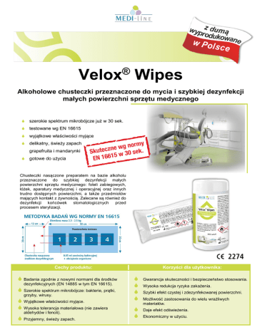 Velox® Wipes Alkoholowe chusteczki przeznaczone do mycia i szybkiej dezynfekcji małych powierzchni sprzętu medycznego szerokie spektrum mikrobójcze już w 30 sek. testowane wg EN 16615 wyjątkowe właściwości myjące delikatny, świeży zapach grapefruita i mandarynki gotowe do użycia Chusteczki nasączone preparatem na bazie alkoholu przeznaczone do szybkiej dezynfekcji małych powierzchni sprzętu medycznego: foteli zabiegowych, łóżek, aparatury medycznej i operacyjnej oraz innych trudno dostępnych powierzchni, a także przedmiotów mających kontakt z żywnością. Zalecane są również do dezynfekcji końcówek stomatologicznych przed procesem sterylizacji. Korzyści dla użytkownika: Cechy produktu: Badania zgodnie z nowymi normami dla środków dezynfekcyjnych (EN 14885 w tym EN 16615). Szerokie spektrum mikrobójcze: bakterie, prątki, grzyby, wirusy. Wyjątkowe właściwości myjące. Wysoka tolerancja materiałowa (nie zawiera aldehydów i fenoli). Przyjemny, świeży zapach. Gwarancja skuteczności i bezpieczeństwo stosowania. Wysoka redukcja ryzyka zakażenia. Szybki efekt czystej i zdezynfekowanej powierzchni. Możliwość zastosowania do wielu wrażliwych materiałów. Daje efekt odświeżenia. Ekonomiczny w użyciu. Velox® Wipes – Alkoholowe chusteczki przeznaczone do mycia i szybkiej dezynfekcji małych powierzchni sprzętu medycznego Zastosowanie: Velox Wipes zalecane są do dezynfekcji małych powierzchni sprzętu medycznego: łózek i foteli zabiegowych, łóżek, aparatury medycznej i operacyjnej oraz innych trudno dostępnych powierzchni, a także przedmiotów mających kontakt z żywnością. Polecane jest również do dezynfekcji końcówek stomatologicznych przed procesem sterylizacji oraz łyżek protetycznych i wycisków silikonowych. Preparat nie zawiera aldehydu i fenolu dzięki czemu nie odbarwia dezynfekowanych powierzchni. Dzięki innowacyjnej formule opartej na synergii surfaktantów i technologii nano-miceli produkt posiada szerokie spektrum bójcze i wyjątkowe właściwości myjące. Zalecane do dezynfekcji sprzętu rehabilitacyjnego, szafek pacjenta, blatów, łóżek. Posiadają pozytywną opinię producenta sprzętu medycznego Famed. Posiadają przyjemny świeży zapach. Spektrum Bakterie (w tym MRSA) Grzyby (C. albicans) Prątki gruźlicy (M. terrae) Wirus otoczkowe (HBV, HCV, HIV, Vaccinia, Ebola, wirus grypy A, B, C, Herpes simplex) Wirus Rota Wirus Adeno Normy wg EN 14885 Obciążenie organiczne niskie wysokie EN 1276 EN 13697 EN 13727 EN 16615 EN 1650 EN 13624 EN 16615 EN 14348 30 sek. 30 sek. 30 sek. 30 sek. 30 sek. 30 sek. 30 sek. 30 sek. 1 min. 1 min. 30 sek. 1 min. DVV/RKI 30 sek. 30 sek. EN 14476 EN 14476 30 sek. 1 min 30 sek. 1 min. Dokumentacja potwierdzająca skuteczność biobójczą preparatu dostępna u wytwórcy. Sposób użycia: Chusteczkę wyjąć z opakowania i przetrzeć nią dezynfekowaną powierzchnię. Dokładnie zamknąć wieczko puszki. Po otwarciu opakowanie zużyć w ciągu 21 dni. Nie używać jeśli chusteczka jest sucha. Nie stosować na powierzchniach wrażliwych na działanie alkoholi (np. szkło akrylowe). Produkt przeznaczony do użycia przez profesjonalnego użytkownika. Skład: 100 g zawiera: 40g - propan-2-ol (CAS:67-63-0) 20g - etanol 0,39g - aminy, n-C10-16-alkilotrimetylenodi-, produkty reakcji z kwasem chlorooctowym 0,25g - chlorek didecylodimetyloamoniowy Opakowanie: puszka 100 szt., opakowanie uzupełniające 100 szt. Środki ostrożności: Informacje dotyczące sposobu postępowania z preparatem dostępne są w karcie charakterystyki produktu na stronie www.medisept.pl Wyrób medyczny klasy II a w rozumieniu Ustawy o Wyrobach Medycznych. Przeznaczony do dezynfekcji nieinwazyjnych wyrobów medycznych. Data opracowania: 11.2016