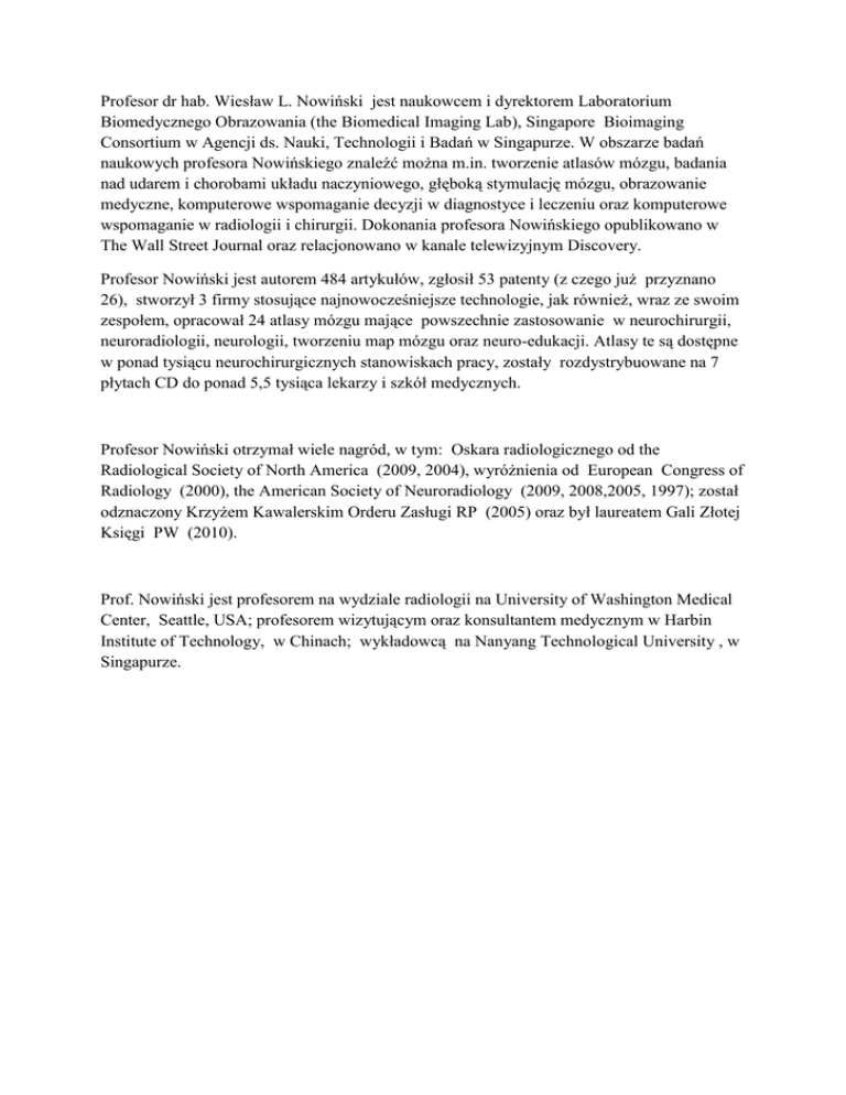 Profesor dr hab. Wiesław L. Nowiński jest naukowcem i dyrektorem Laboratorium Biomedycznego Obrazowania (the Biomedical Imaging Lab), Singapore Bioimaging Consortium w Agencji ds. Nauki, Technologii i Badań w Singapurze. W obszarze badań naukowych profesora Nowińskiego znaleźć można m.in. tworzenie atlasów mózgu, badania nad udarem i chorobami układu naczyniowego, głęboką stymulację mózgu, obrazowanie medyczne, komputerowe wspomaganie decyzji w diagnostyce i leczeniu oraz komputerowe wspomaganie w radiologii i chirurgii. Dokonania profesora Nowińskiego opublikowano w The Wall Street Journal oraz relacjonowano w kanale telewizyjnym Discovery. Profesor Nowiński jest autorem 484 artykułów, zgłosił 53 patenty (z czego już przyznano 26), stworzył 3 firmy stosujące najnowocześniejsze technologie, jak również, wraz ze swoim zespołem, opracował 24 atlasy mózgu mające powszechnie zastosowanie w neurochirurgii, neuroradiologii, neurologii, tworzeniu map mózgu oraz neuro-edukacji. Atlasy te są dostępne w ponad tysiącu neurochirurgicznych stanowiskach pracy, zostały rozdystrybuowane na 7 płytach CD do ponad 5,5 tysiąca lekarzy i szkół medycznych. Profesor Nowiński otrzymał wiele nagród, w tym: Oskara radiologicznego od the Radiological Society of North America (2009, 2004), wyróżnienia od European Congress of Radiology (2000), the American Society of Neuroradiology (2009, 2008,2005, 1997); został odznaczony Krzyżem Kawalerskim Orderu Zasługi RP (2005) oraz był laureatem Gali Złotej Księgi PW (2010). Prof. Nowiński jest profesorem na wydziale radiologii na University of Washington Medical Center, Seattle, USA; profesorem wizytującym oraz konsultantem medycznym w Harbin Institute of Technology, w Chinach; wykładowcą na Nanyang Technological University , w Singapurze.