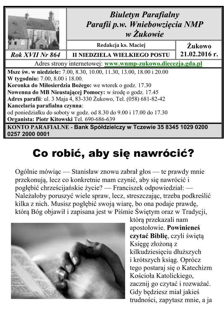 Biuletyn Parafialny Parafii p.w. Wniebowzięcia NMP w Żukowie Redakcja ks. Maciej Rok XVII Nr 864 II NIEDZIELA WIELKIEGO POSTU Żukowo 21.02.2016 r. Adres strony internetowej: www.wnmp-zukowo.diecezja.gda.pl Msze św. w niedziele: 7.00, 8.30, 10.00, 11.30, 13.00, 18.00 i 20.00 W tygodniu: 7.00, 8.00 i 18.00. Koronka do Miłosierdzia Bożego: we wtorek o godz. 17.30 Nowenna do MB Nieustającej Pomocy: w środę o godz. 17.45 Adres parafii: ul. 3 Maja 4, 83-330 Żukowo, Tel. (058) 681-82-42 Kancelaria parafialna czynna: od poniedziałku do soboty w godz. od 8.30 do 9.00 i 17.00 do 17.30 Organista: Piotr Kitowski Tel. 690-686-639 KONTO PARAFIALNE - Bank Spółdzielczy w Tczewie 35 8345 1029 0200 0257 2000 0001 Co robić, aby się nawrócić? Ogólnie mówiąc — Stanisław znowu zabrał głos — te prawdy mnie przekonują, lecz co konkretnie mam czynić, aby się nawrócić i pogłębić chrześcijańskie życie? — Franciszek odpowiedział: — Należałoby poruszyć wiele spraw, lecz, streszczając, trzeba podkreślić kilka z nich. Musisz pogłębić swoją wiarę, bo ona podaje prawdę, którą Bóg objawił i zapisana jest w Piśmie Świętym oraz w Tradycji, którą przekazali nam apostołowie. Powinieneś czytać Biblię, czyli świętą Księgę złożoną z kilkudziesięciu dłuższych i krótszych ksiąg. Oprócz tego postaraj się o Katechizm Kościoła Katolickiego, zacznij go czytać i rozważać. Gdy będziesz miał jakieś trudności, zapytasz mnie, a ja sięgając do różnych źródeł postaram się dać wyjaśnienie. Gdy sam nie będę mógł odpowiedzieć, zapytam księdza proboszcza. Już wiesz, że wierzyć nie oznacza recytować z pamięci różne formułki wiary, lecz przylgnąć całą swą osobą do Chrystusa i zacząć wypełniać Jego nakazy. Papież Franciszek mówi, że kto nie wprowadza wskazań wiary do swego postępowania, tym samym pokazuje, że jego wiara „nie jest w pełni przyjęta, niecałkowicie przemyślana, nieprzeżywana wiernie”. Wiara jest darem Bożym. Pan Bóg, śpiesząc nam z pomocą, przez Ducha Świętego oświeca nas, abyśmy z całkowitym zaufaniem przyjęli prawdy, które On nam podaje (por. 1 Kor 12, 3). Zacznij od dobrej spowiedzi. Podam ci szereg pytań, na które będziesz odpowiadał w swoim sercu i pomogą ci zrobić rachunek sumienia. Uczęszczaj na Mszę świętą niedzielną i połącz ją z Komunią świętą. Naśladując przykład Chrystusa, rozpocznij modlić się rano i wieczorem i pytaj się przy wieczornej modlitwie, jak podczas kończącego się dnia odnosiłeś się do Boga obecnego w tobie i w drugich. Bóg daje nam czas, aby na fundamencie, którym jest Chrystus Pan, z dostępnego nam materiału wznosić dom naszej świętości (por. 1 Kor 3, 11-17). Co jest tym materiałem? Jest nim to wszystko, co Bóg zsyła i dopuszcza na nas. Niekiedy w swym nieskończonym miłosierdziu sprawia, że już teraz ponosimy i cierpimy skutki naszych grzechów. Dzięki temu, przytomniejąc i nawracając się, unikniemy wiecznego cierpienia. Ten życiowy materiał trzeba scalać boską zaprawą działania Ducha Świętego. Wtedy wszystko posłuży nam do miłowania Boga i ludzi. (Fragmenty książki "Bóg jest w nas", której bohaterowie, Franciszek (katecheta) i Stanisław (letni katolik), rozmawiają ze sobą na tematy związane z wątpliwościami w wierze. WWW.opoka). Bardzo ważne krzesło – katedry św. Piotra, Apostoła. To święto jest jedyne w swoim rodzaju. 22 lutego nie świętujemy żadnej tajemnicy z życia Jezusa, nie wspominamy świętego lub rocznicy poświęcenia kościoła. Spoglądamy ze czcią na… krzesło. W Bazylice św. Piotra znajdują się także resztki drewnianego krzesła, na którym miał zasiadać sam św. Piotr. Ta relikwia przechowywana jest w potężnej rzeźbie Berniniego, która znajduje się za głównym ołtarzem. Chodzi o katedrę św. Piotra. Słowo „katedra” kojarzy się z kościołem biskupa. I słusznie, ale pierwotnie to słowo oznaczało podwyższone miejsce, z którego naucza biskup. Ten sens słowa „katedra” zachował się jeszcze w nazewnictwie uniwersyteckim. Jest symbolem posługi papieskiej w Kościele. Dzieje Apostolskie oraz Listy św. Pawła potwierdzają, że Piotr zajmował pierwsze miejsce w Kościele pierwotnym. Z Jerozolimy Piotr wyrusza do Antiochii, która stała się pierwszą stolicą Apostolską (w dawnym mszale było osobne święto „katedry św. Piotra w Antiochii”). Później dociera do Rzymu, gdzie zakłada Kościół i ginie jako męczennik. Zostaje pogrzebany na cmentarzu za miastem. Dokładnie w miejscu, nad którym wznosi się bazylika nosząca jego imię. Potwierdziły to badania archeologiczne wykonane na polecenie papieża Piusa XII. Katedra św. Piotra przypomina o trwaniu misji, którą Jezus powierzył Rybakowi znad Jeziora Galilejskiego. Każdy kolejny biskup Rzymu jest jednocześnie pasterzem całego Kościoła. Podstawową jego funkcją jest strzeżenie i przekazywanie drogocennej perły – Ewangelii. „Szymonie, Szymonie – mówił Jezus – (...) prosiłem za tobą, żeby nie ustała twoja wiara. Ty natomiast, gdy się nawrócisz, utwierdzaj twoich braci” (Łk 22,31–32). Papież jest pierwszym nauczycielem wiary w Kościele. Jednocześnie nigdy nie przestaje być uczniem Jezusa, pierwszym słuchającym Jego słów, pierwszym, który się nawraca. (www.wiara.pl.). EWANGELIA NA NIEDZIELĘ (Łk 9,28b-36) Jezus wziął z sobą Piotra, Jana i Jakuba i wyszedł na górę, aby się modlić. Gdy się modlił, wygląd Jego twarzy się odmienił, a Jego odzienie stało się lśniąco białe. A oto dwóch mężów rozmawiało z Nim. Byli to Mojżesz i Eliasz. Ukazali się oni w chwale i mówili o Jego odejściu, którego miał dokonać w Jerozolimie. Tymczasem Piotr i towarzysze snem byli zmorzeni. Gdy się ocknęli, ujrzeli Jego chwałę i obydwóch mężów, stojących przy Nim. Gdy oni odchodzili od Niego, Piotr rzekł do Jezusa: Mistr