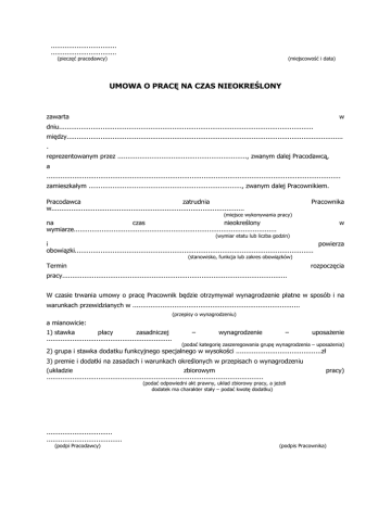 ................................. ................................. (pieczęć pracodawcy) (miejscowość i data) UMOWA O PRACĘ NA CZAS NIEOKREŚLONY zawarta w dniu................................................................................................................................ między........................................................................................................................................... . reprezentowanym przez ................................................................., zwanym dalej Pracodawcą, a .................................................................................................................................................... zamieszkałym ............................................................................., zwanym dalej Pracownikiem. Pracodawca zatrudnia w................................................................................................. Pracownika (miejsce wykonywania pracy) na czas nieokreślony wymiarze...................................................................................................... w (wymiar etatu lub liczba godzin) i powierza obowiązki........................................................................................................................ (stanowisko, funkcja lub zakres obowiązków) Termin rozpoczęcia pracy................................................................................................................. W czasie trwania umowy o pracę Pracownik będzie otrzymywał wynagrodzenie płatne w sposób i na warunkach przewidzianych w .................................................................................... (przepisy o wynagrodzeniu) a mianowicie: 1) stawka płacy zasadniczej ............................................................... – wynagrodzenie – uposażenie (podać kategorię zaszeregowania grupę wynagrodzenia – uposażenia) 2) grupa i stawka dodatku funkcyjnego specjalnego w wysokości ...........................................zł 3) premie i dodatki na zasadach i warunkach określonych w przepisach o wynagrodzeniu (układzie zbiorowym ............................................................................................................. pracy) (podać odpowiedni akt prawny, układ zbiorowy pracy, a jeżeli dodatek ma charakter stały – podać kwotę dodatku) ................................. ...................................... (podpi Pracodawcy) (podpis Pracownika)