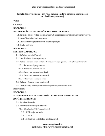 plan pracy magisterskiej - poglądowy konspekt Temat: Zapory ogniowe - ich rola, zadania i cele w ochronie komputerów w sieci komputerowej Wstęp Cel pracy ROZDZIAŁ 1 BEZPIECZEŃSTWO SYSTEMÓW INFORMATYCZNYCH 1.1.Definicja pojęć: system informatyczny, bezpieczeństwo systemów informatycznych 1.2.Identyfikacja i rodzaje zagrożeń 1.3.Zarządzanie bezpieczeństwem informatycznym 1.4. Środki ochrony ROZDZIAŁ 2 SYSTEMY ZAPOROWE 2.1. Definicja pojęcia Firewall 2.2. Idea działania ścian ogniowych 2.3. Rodzaje zabezpieczeń systemu komputerowego: podział i klasyfikacji Firewalli 2.3.1. Sprzętowe i programowe 2.3.2. Zapory na poziomie sieci 2.3.3. Zapory na poziomie aplikacji 2.3.4. Zapory na poziomie transmisji 2.3.5. Filtrowanie tematyki stron 2.4. Zadania i funkcje zapór ogniowych 2.5. Zalety i wady ścian ogniowych oraz problemy związane z ich stosowaniem DOZDZIAŁ 3 PORÓWNANIE FUNKCJONALNOŚCI DZIAŁANIA WYBRANYCH ZAPÓR SIECIOWYCH 3.1. Opis i cel badania 3.2. Porównanie wybranych firewalli 3.2.1. Checkpoint NG Feature Pack 3 3.2.1.1.Filtracj a pakietów 3.2.1.2.NAT 3.2.1.3.Kontrola protokołów aplikacyj nych prace magisterskie realizacj a: http: //www.biuroliterackie. net plan pracy magisterskiej - poglądowy konspekt 3.2.1.4. Tworzenie VPN 3.2.1.5. System wykrywania włamań - IDS 3.2.1.6.QoS (QualityofService) 3.2.1.7.Zarządzanie 3.2.2. Cisco Secure PIX Firewall (wersja 6.3) 3.2.2.1.Filtracja pakietów 3.2.2.2.NAT 3.2.2.3.Kontrola protokołów aplikacyjnych 3.2.2.4.Tworzenie VPN 3.2.2.5. System wykrywania włamań - IDS 3.2.2.6.QoS (Qualityof Service) 3.2.2.7.Zarządzanie 3.3. Wybór firewalla - zestawienie najważniejszych cech Zakończenie Bibliografia prace magisterskie realizacj a: http: //www.biuroliterackie. net