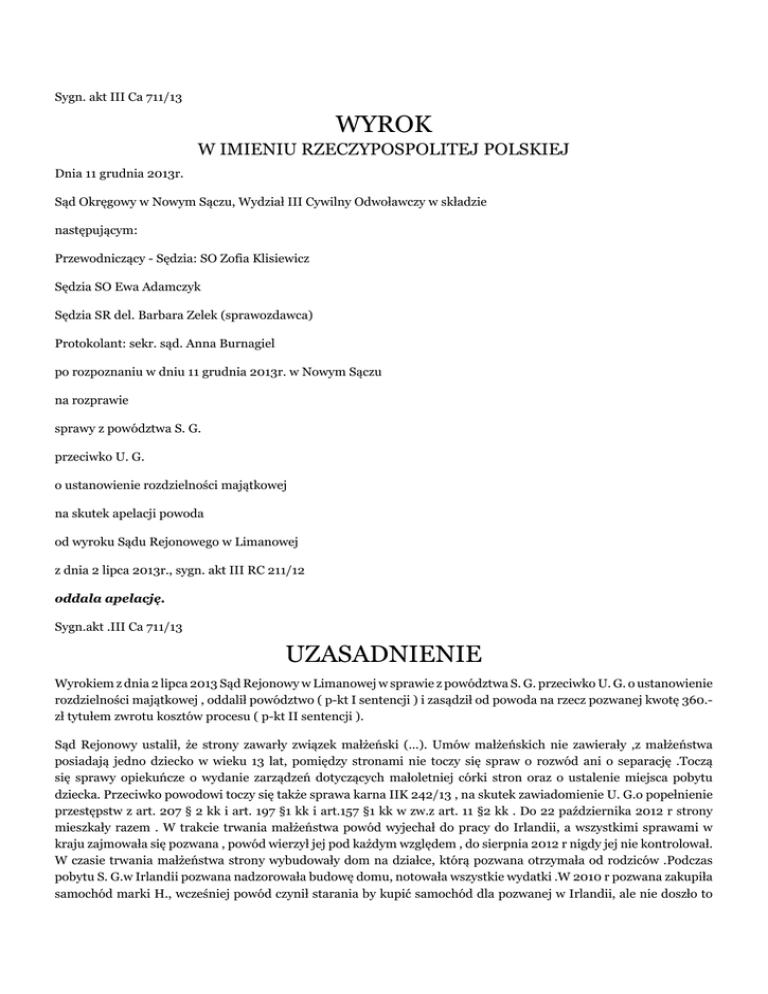 Sygn. akt III Ca 711/13 WYROK W IMIENIU RZECZYPOSPOLITEJ POLSKIEJ Dnia 11 grudnia 2013r. Sąd Okręgowy w Nowym Sączu, Wydział III Cywilny Odwoławczy w składzie następującym: Przewodniczący - Sędzia: SO Zofia Klisiewicz Sędzia SO Ewa Adamczyk Sędzia SR del. Barbara Zelek (sprawozdawca) Protokolant: sekr. sąd. Anna Burnagiel po rozpoznaniu w dniu 11 grudnia 2013r. w Nowym Sączu na rozprawie sprawy z powództwa S. G. przeciwko U. G. o ustanowienie rozdzielności majątkowej na skutek apelacji powoda od wyroku Sądu Rejonowego w Limanowej z dnia 2 lipca 2013r., sygn. akt III RC 211/12 oddala apelację. Sygn.akt .III Ca 711/13 UZASADNIENIE Wyrokiem z dnia 2 lipca 2013 Sąd Rejonowy w Limanowej w sprawie z powództwa S. G. przeciwko U. G. o ustanowienie rozdzielności majątkowej , oddalił powództwo ( p-kt I sentencji ) i zasądził od powoda na rzecz pozwanej kwotę 360.zł tytułem zwrotu kosztów procesu ( p-kt II sentencji ). Sąd Rejonowy ustalił, że strony zawarły związek małżeński (...). Umów małżeńskich nie zawierały ,z małżeństwa posiadają jedno dziecko w wieku 13 lat, pomiędzy stronami nie toczy się spraw o rozwód ani o separację .Toczą się sprawy opiekuńcze o wydanie zarządzeń dotyczących małoletniej córki stron oraz o ustalenie miejsca pobytu dziecka. Przeciwko powodowi toczy się także sprawa karna IIK 242/13 , na skutek zawiadomienie U. G.o popełnienie przestępstw z art. 207 § 2 kk i art. 197 §1 kk i art.157 §1 kk w zw.z art. 11 §2 kk . Do 22 października 2012 r strony mieszkały razem . W trakcie trwania małżeństwa powód wyjechał do pracy do Irlandii, a wszystkimi sprawami w kraju zajmowała się pozwana , powód wierzył jej pod każdym względem , do sierpnia 2012 r nigdy jej nie kontrolował. W czasie trwania małżeństwa strony wybudowały dom na działce, którą pozwana otrzymała od rodziców .Podczas pobytu S. G.w Irlandii pozwana nadzorowała budowę domu, notowała wszystkie wydatki .W 2010 r pozwana zakupiła samochód marki H., wcześniej powód czynił starania by kupić samochód dla pozwanej w Irlandii, ale nie doszło to do skutku .Pozwana na podstawie udzielonego jej przez powoda pełnomocnictwa reprezentowała męża w sprawach związanych z majątkiem odrębnym powoda , przy transakcji kupna sprzedaży nieruchomości znacznej wartości , położonej w K. .Pozwana składała także dyspozycje dotyczące lokat bankowych , pożyczyła swojej siostrze 5.000.-zł i suma ta została zwrócona . W ocenie Sądu Rejonowego powództwo nie zasługiwało na uwzględnienie Powód nie udowodnił bowiem, zgodnie z regułą dowodową z art. 6 kc, aby „ważne powody „ o jakich mowa w art. 52 §1 k.r.o występowały w przedmiotowej sprawie . Separacja faktyczna między stronami trwała kilkadziesiąt dni przed złożeniem pozwu ,a w dacie wyrokowania był to okres 9 miesięcy , jednak powód nie wykazał aby stan ten powodował niemożność zarządzania majątkiem wspólnym i był sprzeczny z dobrem rodziny . Zdaniem Sądu Rejonowego mimo faktycznej separacji , nie było sytuacji aby zarząd majątkiem był niemożliwy lub utrudniony .W dacie wyrokowania jedyną kwestią dotyczącą zarządu majątkiem wspólnym była konieczność spłaty rat kredytu hipotecznego .Strony nie posiadają żadnego innego majątku wymagającego podejmowania wspólnych decyzji , pozwana w tym zakresie wykazała wolę porozumienia, w czasie trwania postępowania zapłaciła raty kredytu za maj i czerwiec 2013 r . Według Sądu pierwszej instancji separacja faktyczna nie stanowi ważnego powodu dla ustanowienia rozdzielności majątkowej , nie zostało wykazane aby pozwana trwoniła majątek . W tym stanie rzeczy Sąd Rejonowy orzekł jak w sentencji . O kosztach postępowania Sąd I instancji orzekł na zasadzie art. 98 k.pc. Powyższy wyrok zaskarżył powód apelacją , w której zarzucił naruszenie prawa materialnego ,a to art. 52 § 1 k.r.o przez błędne uznanie ,że istniejąca pomiędzy stronami separacja faktyczna nie stanowi ważnego powodu dla orzeczenia rozdzielności majątkowej ,w sytuacji gdy brak kontaktu pomiędzy stronami , skala konfliktu , który doprowadził do trwałego i zupełnego rozpadu małżeństwa wyklucza możliwość porozumienia się stron w sprawach dotyczących rodziny i wspólnego podejmowania decyzji majątkowych . Skarżący zarzucał nadto sprzeczność istotnych ustaleń z treścią zebranego w sprawie materiału, a także dowolność oceny materiału dowodowego , przez przyjęcie ,że stan faktyczny niniejszej sprawy nie uzasadnia ustanowienia rozdzielności majątkowej pomiędzy stronami . Wskazując na powyższe zarzuty apelujący wnosił o uchylenie zaskarżonego wyroku i uwzględnienie powództwa przez orzeczenie rozdzielności majątkowej z dniem 22 października 2012r i zasądzenie kosztów procesu ewentualnie o uchylenie zaskarżonego wyroku i przekazanie sprawy Sądowi Rejonowemu w Limanowej do ponownego rozpoznania . Sąd Okręgowy zważył , co następuje : Apelacja okazała się niezasadna . Sąd Okręgowy podziela ustalenia faktyczne i wnioski prawne Sądu I instancji . Stosownie do treści art. 52 § 1 k.r.o z ważnych powodów każdy z małżonków może żądać ustanowienia przez sąd rozdzielności majątkowej. Ustawa nie definiuje pojęcia „ ważne powody „ .Jego rozumienie kształtują doktryna i judykatura, wychodząc z ogólnych założeń, które legły u podstaw regulacji majątkowego ustroju małżonków. Ważne powody to okoliczności które powodują, że w sytuacji konkretnego małżeństwa ( rodziny ) istniejąca wspólność majątkowa nie służy dobru drugiego małżonka, a także rodziny, przeciwnie prowadzi do sytuacji postrzeganej jako sprzecznej z zasadami współżycia społecznego. Sprzeczność ta wyraża się w zagrożeniu lub naruszeniu interesu majątkowego nie tylko drugiego małżonka, ale także podstaw ekonomicznych funkcjonowania rodziny. W orzecznic