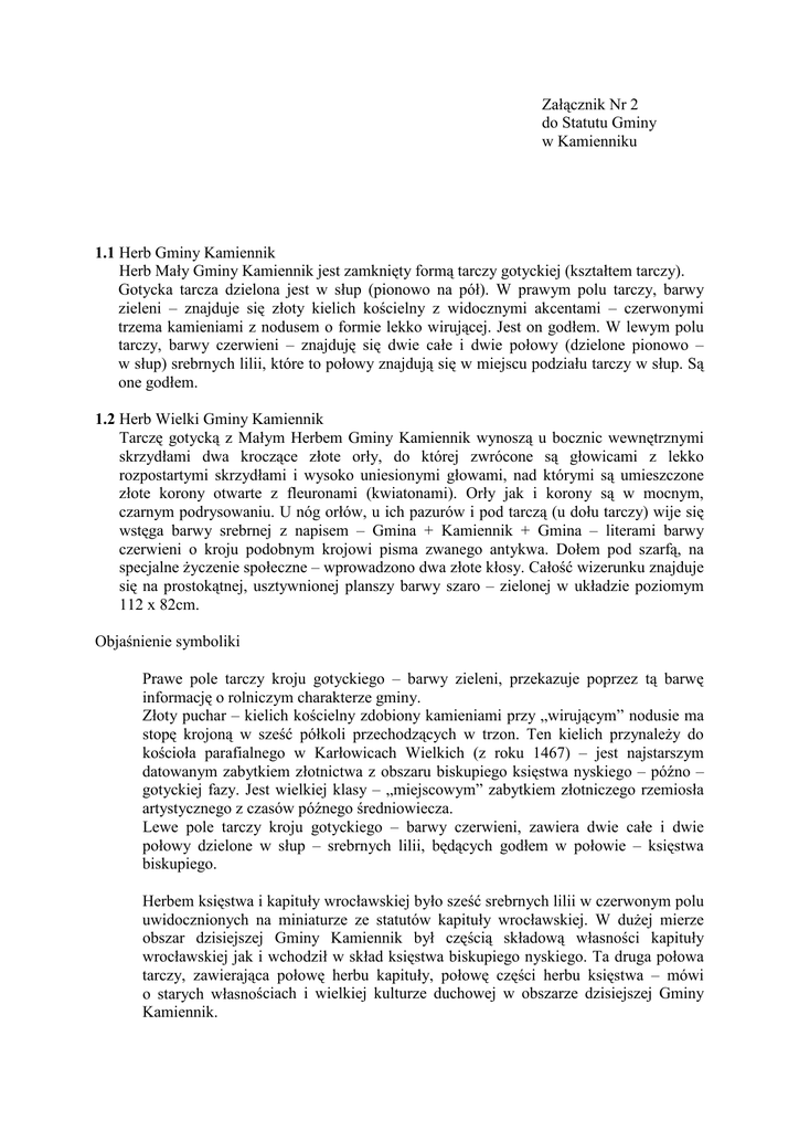 Załącznik Nr 2 do Statutu Gminy w Kamienniku 1.1 Herb Gminy Kamiennik Herb Mały Gminy Kamiennik jest zamknięty formą tarczy gotyckiej (kształtem tarczy). Gotycka tarcza dzielona jest w słup (pionowo na pół). W prawym polu tarczy, barwy zieleni – znajduje się złoty kielich kościelny z widocznymi akcentami – czerwonymi trzema kamieniami z nodusem o formie lekko wirującej. Jest on godłem. W lewym polu tarczy, barwy czerwieni – znajduję się dwie całe i dwie połowy (dzielone pionowo – w słup) srebrnych lilii, które to połowy znajdują się w miejscu podziału tarczy w słup. Są one godłem. 1.2 Herb Wielki Gminy Kamiennik Tarczę gotycką z Małym Herbem Gminy Kamiennik wynoszą u bocznic wewnętrznymi skrzydłami dwa kroczące złote orły, do której zwrócone są głowicami z lekko rozpostartymi skrzydłami i wysoko uniesionymi głowami, nad którymi są umieszczone złote korony otwarte z fleuronami (kwiatonami). Orły jak i korony są w mocnym, czarnym podrysowaniu. U nóg orłów, u ich pazurów i pod tarczą (u dołu tarczy) wije się wstęga barwy srebrnej z napisem – Gmina + Kamiennik + Gmina – literami barwy czerwieni o kroju podobnym krojowi pisma zwanego antykwa. Dołem pod szarfą, na specjalne życzenie społeczne – wprowadzono dwa złote kłosy. Całość wizerunku znajduje się na prostokątnej, usztywnionej planszy barwy szaro – zielonej w układzie poziomym 112 x 82cm. Objaśnienie symboliki Prawe pole tarczy kroju gotyckiego – barwy zieleni, przekazuje poprzez tą barwę informację o rolniczym charakterze gminy. Złoty puchar – kielich kościelny zdobiony kamieniami przy „wirującym” nodusie ma stopę krojoną w sześć półkoli przechodzących w trzon. Ten kielich przynależy do kościoła parafialnego w Karłowicach Wielkich (z roku 1467) – jest najstarszym datowanym zabytkiem złotnictwa z obszaru biskupiego księstwa nyskiego – późno – gotyckiej fazy. Jest wielkiej klasy – „miejscowym” zabytkiem złotniczego rzemiosła artystycznego z czasów późnego średniowiecza. Lewe pole tarczy kroju gotyckiego – barwy czerwieni, zawiera dwie całe i dwie połowy dzielone w słup – srebrnych lilii, będących godłem w połowie – księstwa biskupiego. Herbem księstwa i kapituły wrocławskiej było sześć srebrnych lilii w czerwonym polu uwidocznionych na miniaturze ze statutów kapituły wrocławskiej. W dużej mierze obszar dzisiejszej Gminy Kamiennik był częścią składową własności kapituły wrocławskiej jak i wchodził w skład księstwa biskupiego nyskiego. Ta druga połowa tarczy, zawierająca połowę herbu kapituły, połowę części herbu księstwa – mówi o starych własnościach i wielkiej kulturze duchowej w obszarze dzisiejszej Gminy Kamiennik. 2. Flaga Gminy Kamiennik 2.1 Flaga Gminy Kamiennik Flaga jest płat materiału w formie poziomego prostokąta, gdzie stosunek szerokości (wysokości) do jego długości (dłuższego boku) pozostaje w proporcji 5:8. Płat materiału prostokąt poziomy – składa się z trzech słupów barw, trzech pionowych pasów barwnych o jednakowej szerokości. Ich proporcja względem siebie ma się tak, jak 1:1:1. Flaga zbudowana jest z: 1a) pas pierwszy (pionowy) jest barwy ciemnej zieleni, 2a) – pas drugi (pionowy) jest barwy złota. W wydaniu seryjnym i w druku na materiale – złoto zastępuje żółć, 3a) – pas trzeci (pionowy) jest barwy czerwień. Czerwień ma być ciemna (nie czerwień cynobrowa, zwana proletariacką). Ten odcień czerwieni nazywa się kraplak. 2.2 Flaga urzędowa Gminy Kamiennik Flaga ta ma w miejscy centralnym – w rozpiętości materiału umieszczoną tarczę Herbu Małego Gminy Kamiennik. Inaczej w środku pasa środkowego, złotego (żółtego) równolegle do jego biegu. Rozpiętość pasa złotego w jego szerokości jest jak 6/6. Szerokość tarczy herbu jest w proporcji jak 4/6, gdzie pasy złote po obu stronach tarczy (przy jej bocznicach) – są szerokości 1/6 – każdy. Natomiast tarcza jest umieszczona nie w środku wysokości pasa żółtego – a powyżej. Jest umieszczona od górnej krawędzi materii flagi, górnej krawędzi pionowego pasa żółtego – w odległości połowy wysokości tarczy herbowej.