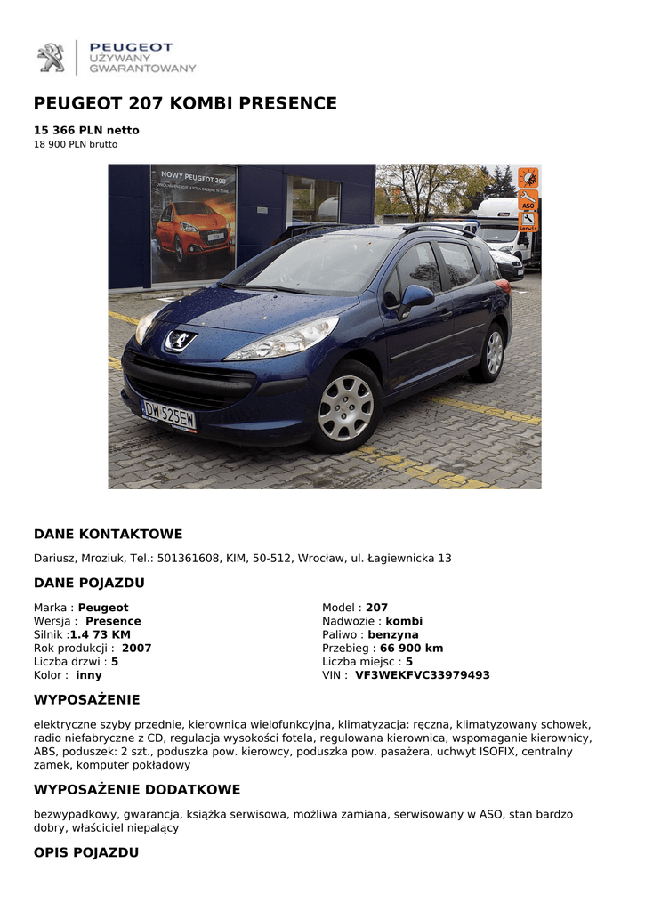 PEUGEOT 207 KOMBI PRESENCE 15 366 PLN netto 18 900 PLN brutto DANE KONTAKTOWE Dariusz, Mroziuk, Tel.: 501361608, KIM, 50-512, Wrocław, ul. Łagiewnicka 13 DANE POJAZDU Marka : Peugeot Wersja : Presence Silnik :1.4 73 KM Rok produkcji : 2007 Liczba drzwi : 5 Kolor : inny Model : 207 Nadwozie : kombi Paliwo : benzyna Przebieg : 66 900 km Liczba miejsc : 5 VIN : VF3WEKFVC33979493 WYPOSAŻENIE elektryczne szyby przednie, kierownica wielofunkcyjna, klimatyzacja: ręczna, klimatyzowany schowek, radio niefabryczne z CD, regulacja wysokości fotela, regulowana kierownica, wspomaganie kierownicy, ABS, poduszek: 2 szt., poduszka pow. kierowcy, poduszka pow. pasażera, uchwyt ISOFIX, centralny zamek, komputer pokładowy WYPOSAŻENIE DODATKOWE bezwypadkowy, gwarancja, książka serwisowa, możliwa zamiana, serwisowany w ASO, stan bardzo dobry, właściciel niepalący OPIS POJAZDU AUTORYZOWANY DEALER PEUGEOT KIM SP. Z O.O. OFERUJE SAMOCHODY UŻYWANE W PROGRAMIE GWARANCYJNYM „PEUGEOT UŻYWANY GWARANTOWANY” WE WROCŁAWIU PRZY UL. ŁAGIEWNICKIEJ 13. Opis pojazdu: -GWARANCJA -MOŻLIWOŚĆ KREDYTU BEZ WPŁATY I BEZ ZAŚWIADCZEŃ -PAKIET UBEZPIECZENIOWY AC/OC/NW NA ATRAKCYJNYCH WARUNKACH -PRZYJMUJEMY SAMOCHODY W ROZLICZENIU WSZYSTKICH MAREK -KUPUJĄCY ZWOLNIONY Z OPŁATY SKARBOWEJ 2% ZADZWOŃ I ZAPYTAJ O SZCZEGÓŁY, TEL : 501 36 16 08 WYPOSAŻENIE: poduszki powietrzne ABS klimatyzacja manualna światła do jazdy dziennej zamek centralny komputer pokladowy mocowanie fotelików dziecięcych isofix elektryczne szyby radio samochodowe ZADZWOŃ I ZAPYTAJ O SZCZEGÓŁY, TEL : 501 36 16 08 Dane zawarte w cenniku nie stanowią oferty w rozumieniu przepisów prawa polskiego. Treść ogłoszenia ma charakter wyłącznie informacyjny, w szczególności nie należy jej traktować jako wiążącego prawnie zobowiązania lub zapewnienia gwarancyjnego w rozumieniu art. 13. Ustawy z 27 lipca 2002 r. o szczególnych warunkach sprzedaży konsumenckiej – gwarancję stanowi wyłącznie dokument gwarancyjny wydany przez sprzedawcę. Zachęcamy do sprawdzenia samochodu przed zakupem i wykonania jazdy próbnej. Wspomaganie układu kierowniczego - progresywne, System wspomagania hamowania awaryjnego, Elektryczne podnoszenie szyb, przód, Airbag kierowcy i pasażera, ABS, Zamek centralny, Klimatyzacja, Lakier metalik Pierwszy właściciel, Bezwypadkowy, Kupiony w ASO w Polsce, Pojazd regularnie serwisowany QR CODE DLA OGŁOSZENIA W SERWISIE UZYWANYGWARANTOWANY.PL Powered by TCPDF (www.tcpdf.org)