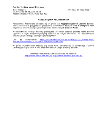 Politechnika Wrocławska Biuro Prasowe tel. 071 320-43-43, 320-43-54 Rzecznik Prasowy kom. 0695 350 432 Wrocław, 17 lipca 2013 r. NASZA PIĘKNA POLITECHNIKA Politechnika Wrocławska znalazła się w gronie 15 najpiękniejszych uczelni świata. Takie zestawienie przygotował prestiżowy internetowy dziennik The Huffington Post wspólnie z amerykańską wytwórnią filmów animowanych Disney-Pixar. W uzasadnieniu decyzji możemy przeczytać, że nasza uczelnia posiada liczne budynki (głównie w stylu modernistycznym) rozsiane po całym Wrocławiu. Te najważniejsze znajdują się na brzegu spokojnie płynącej Odry. Link do zestawienia: http://www.huffingtonpost.co.uk/2013/07/11/worlds-mostbeautiful-universities_n_3578402.html#slide=2682420 W gronie wyróżnionych znalazły się także m.in. uniwersytety w Cambridge i Oxfrod, Uniwersytet Cape Town w RPA oraz Uniwersytet Otago z Nowej Zelandii. Informacje dla mediów umieszczane są na stronach: http://www.portal.pwr.edu.pl; http://www.pryzmat.pwr.edu.pl/
