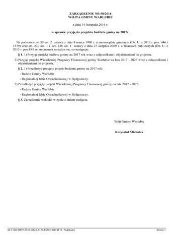 ZARZĄDZENIE NR 58/2016 WÓJTA GMINY WARLUBIE z dnia 14 listopada 2016 r. w sprawie przyjęcia projektu budżetu gminy na 2017r. Na podstawie art.30 ust. 2 ustawy z dnia 8 marca 1990 r. o samorządzie gminnym (Dz. U. z 2016 r. poz. 446 i 1579) oraz art. 230 ust. 1 i art. 238 ust. 1 ustawy z dnia 27 sierpnia 2009 r. o finansach publicznych (Dz. U. z 2013 r. poz.885 ze zmianami) zarządza się, co następuje: § 1. 1) Przyjąć projekt budżetu gminy na 2017 rok wraz z załącznikami i objaśnieniami do projektu. 2) Przyjąć projekt Wieloletniej Prognozy Finansowej gminy Warlubie na lata 2017 - 2026 wraz z załącznikami i objaśnieniami do projektu. § 2. 1) Przedłożyć przyjęty projekt budżetu gminy na 2017 rok: - Radzie Gminy Warlubie - Regionalnej Izbie Obrachunkowej w Bydgoszczy. 2) Przedłożyć przyjęty projekt Wieloletniej Prognozy Finansowej gminy na lata 2017 - 2026: - Radzie Gminy Warlubie - Regionalnej Izbie Obrachunkowej w Bydgoszczy. § 3. Zarządzenie wchodzi w życie z dniem podjęcia. Wójt Gminy Warlubie Krzysztof Michalak Id: C40C5B39-2538-4B28-8158-E90E13DC4F11. Podpisany Strona 1 UZASADNIENIE Przygotowanie projektu uchwały budżetowej wraz z objaśnieniami oraz projektu uchwały w sprawie wieloletniej pgognozy finansowej wraz z objaśnieniami należy do wyłącznej kompetencji Wójta Gminy. W terminie do 15 listopada został opracowany projekt budżetu gminy na 2017 rok i projekt uchwały w sprawie wieloletniej prognozy finansowej na lata 2017-2026. Wójt Gminy Warlubie Krzysztof Michalak Id: C40C5B39-2538-4B28-8158-E90E13DC4F11. Podpisany Strona 1