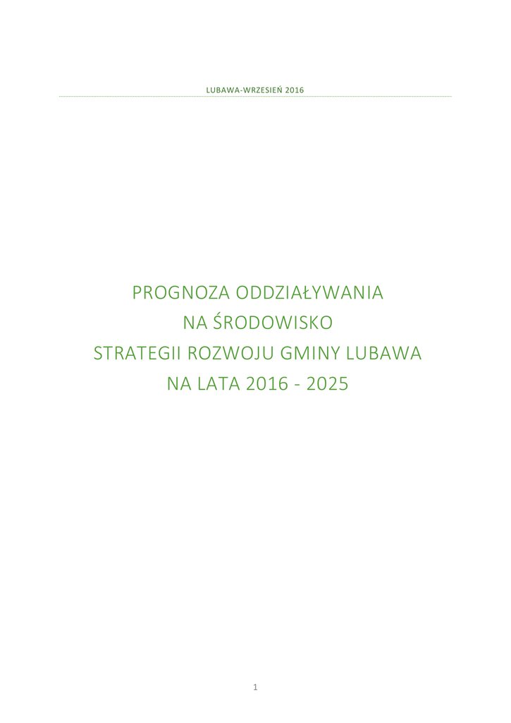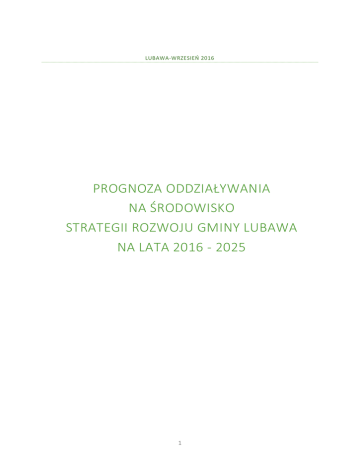 LUBAWA-WRZESIEŃ 2016 PROGNOZA ODDZIAŁYWANIA NA ŚRODOWISKO STRATEGII ROZWOJU GMINY LUBAWA NA LATA 2016 - 2025 1 SPIS TREŚCI Streszczenie w języku niespecjalistycznym ............................................................................................. 5 1. Wstęp............................................................................................................................................. 10 2. Metody zastosowane przy sporządzeniu prognozy....................................................................... 10 2.1 Ogólne podejście badawcze .................................................................................................. 10 2.2 Charakterystyka wybranych metod....................................................................................... 11 2.2.1 Analiza dokumentów strategicznych i zgodności celów zawartych w dokumencie z celami ochrony środowiska wyznaczonych w dokumentach strategicznych wyższego szczebla ............. 11 2.2.2 Analiza stanu środowiska ..................................................................................................... 11 2.2.3 Analiza potencjalnych oddziaływań zadań przewidzianych w Strategii na środowisko oraz na ludzi................................................................................................................................... 11 3. Informacje o zawartości i głównych celach dokumentu ............................................................... 12 4. Informacja na temat powiązań Strategii rozwoju gminy Lubawa z innymi dokumentami ........... 21 4.1 Powiązania SRGL z dokumentami strategicznymi, wskazane w SRGL ........................................ 21 4.2 Powiązania SRGL z pozostałymi dokumentami strategicznymi w zakresie rozwoju społeczno-gospodarczego ..................................................................................................... 23 4.3 Cele ochrony środowiska ustanowione na szczeblu międzynarodowym, wspólnotowym i krajowym, istotne z punktu widzenia projektowanego dokumentu................................... 29 5. Propozycje dotyczące przewidywanych metod analizy skutków realizacji postanowień projektowanego dokumentu oraz częstotliwość jej przeprowadzania ......................................... 33 6. Informacje o możliwym transgranicznym oddziaływaniu na środowisko ..................................... 35 7. Istniejący stan środowiska oraz potencjalne zmiany tego stanu w przypadku braku realizacji projektowanego dokumentu ......................................................................................................... 35 8. 7.1 Istniejący stan środowiska na obszarze objętym przewidywanym oddziaływaniem ............ 35 7.2 Istniejące problemy ochrony środowiska istotne z punktu widzenia realizacji projektowanego dokumentu, w szczególności dotyczące obszarów podlegających ochronie na podstawie ustawy z dnia 16 kwietnia 2004 r. o ochronie przyrody ................................. 45 7.3 Zmiany stanu środowiska w przypadku braku realizacji dokumentu.................................... 49 Przewidywane znaczące oddziaływania ........................................................................................ 50 8.1 W obszarze różnorodności biologicznej (w tym siedlisk roślinności, grzybów i porostów) .. 51 8.2 W obszarze oddziaływania na rośliny.................................................................................... 52 8.3 W obszarze oddziaływania na zwierzęta ............................................................................... 52 8.4 W obszarze oddziaływania na ludzi ....................................................................................... 52 8.5 W obszarze oddziaływania na wody...................................................................................... 53 8.6 W obszarze oddziaływania na powietrze .............................................................................. 53 8.7 W obszarze oddziaływania na powierzchnię ziemi ............................................................... 54 8.8 W obszarze oddziaływania na krajobraz ............................................................................... 54 2 9. 8.9 W obszarze oddziaływania na zabytki ................................................................................... 54 8.10 W obszarze oddziaływania na klimat .................................................................................... 55 8.11 W obszarze oddziaływania na zasoby naturalne ................................................................... 55 8.12 W obszarze gospodarki odpadami ........................................................................................ 55 8.13 W obszarze oddziaływania na dobra materialne .................................................................. 56 8.14 Oddziaływania skumulowane ................................................................................................ 56 Rozwiązania mające na celu zapobieganie, ograniczanie lub kompensację przyrodniczą negatywnych oddziaływań na środowisko, mogących być rezultatem realizacji projektowanego dokumentu ......................................................................................................... 56 10. Rozwiązania alternatywne do rozwiązań zawartych w projektowanym dokumencie wraz z uzasadnieniem ich wyboru ................................................................................................. 62 11. Trudności wynikające z niedostatków techniki lub luk we współczesnej wiedzy, napotkanych w trakcie sporządzania prognozy............................................................................. 62 Spis tabel ............................................................................................................................................... 64 Spis załączników ................................................................................