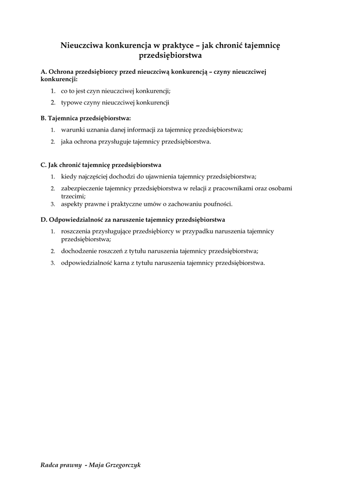 Nieuczciwa konkurencja w praktyce – jak chronić tajemnicę przedsiębiorstwa A. Ochrona przedsiębiorcy przed nieuczciwą konkurencją – czyny nieuczciwej konkurencji: 1. co to jest czyn nieuczciwej konkurencji; 2. typowe czyny nieuczciwej konkurencji B. Tajemnica przedsiębiorstwa: 1. warunki uznania danej informacji za tajemnicę przedsiębiorstwa; 2. jaka ochrona przysługuje tajemnicy przedsiębiorstwa. C. Jak chronić tajemnicę przedsiębiorstwa 1. kiedy najczęściej dochodzi do ujawnienia tajemnicy przedsiębiorstwa; zabezpieczenie tajemnicy przedsiębiorstwa w relacji z pracownikami oraz osobami trzecimi; 3. aspekty prawne i praktyczne umów o zachowaniu poufności. 2. D. Odpowiedzialność za naruszenie tajemnicy przedsiębiorstwa 1. roszczenia przysługujące przedsiębiorcy w przypadku naruszenia tajemnicy przedsiębiorstwa; 2. dochodzenie roszczeń z tytułu naruszenia tajemnicy przedsiębiorstwa; 3. odpowiedzialność karna z tytułu naruszenia tajemnicy przedsiębiorstwa. Radca prawny - Maja Grzegorczyk