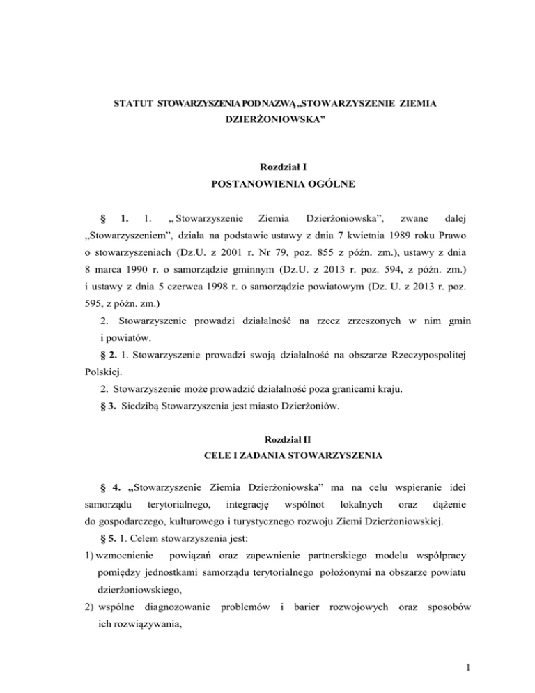 STATUT STOWARZYSZENIA POD NAZWĄ „STOWARZYSZENIE ZIEMIA DZIERŻONIOWSKA” Rozdział I POSTANOWIENIA OGÓLNE § 1. 1. „ Stowarzyszenie Ziemia Dzierżoniowska”, zwane dalej „Stowarzyszeniem”, działa na podstawie ustawy z dnia 7 kwietnia 1989 roku Prawo o stowarzyszeniach (Dz.U. z 2001 r. Nr 79, poz. 855 z późn. zm.), ustawy z dnia 8 marca 1990 r. o samorządzie gminnym (Dz.U. z 2013 r. poz. 594, z późn. zm.) i ustawy z dnia 5 czerwca 1998 r. o samorządzie powiatowym (Dz. U. z 2013 r. poz. 595, z późn. zm.) 2. Stowarzyszenie prowadzi działalność na rzecz zrzeszonych w nim gmin i powiatów. § 2. 1. Stowarzyszenie prowadzi swoją działalność na obszarze Rzeczypospolitej Polskiej. 2. Stowarzyszenie może prowadzić działalność poza granicami kraju. § 3. Siedzibą Stowarzyszenia jest miasto Dzierżoniów. Rozdział II CELE I ZADANIA STOWARZYSZENIA § 4. „Stowarzyszenie Ziemia Dzierżoniowska” ma na celu wspieranie idei samorządu terytorialnego, integrację wspólnot lokalnych oraz dążenie do gospodarczego, kulturowego i turystycznego rozwoju Ziemi Dzierżoniowskiej. § 5. 1. Celem stowarzyszenia jest: 1) wzmocnienie powiązań oraz zapewnienie partnerskiego modelu współpracy pomiędzy jednostkami samorządu terytorialnego położonymi na obszarze powiatu dzierżoniowskiego, 2) wspólne diagnozowanie problemów i barier rozwojowych oraz sposobów ich rozwiązywania, 1 3) realizacja wspólnie wybranych i zaakceptowanych projektów ze Strategii Rozwoju Ziemi Dzierżoniowskiej i programów sektorowych, 4) aktywne współdziałanie na rzecz pozyskiwania środków zewnętrznych, które mogą zostać wykorzystane na finansowanie strategicznych projektów dla Ziemi Dzierżoniowskiej, 5) upowszechnianie idei samorządności lokalnej i regionalnej oraz wspieranie jej rozwoju, 6) ochrona wspólnych interesów członków Stowarzyszenia, 7) kształtowanie wspólnej polityki samorządów lokalnych, 8) promowanie osiągnięć powiatu i gmin zrzeszonych w Stowarzyszeniu, 9) wspomaganie rozwoju wspólnot i społeczności lokalnych, 10) wspomaganie rozwoju gospodarczego, w tym rozwoju przedsiębiorczości, 11) wspieranie rozwoju obszarów wiejskich, 12) wspieranie uczestnictwa gmin i powiatu zrzeszonych w Stowarzyszeniu w programach Unii Europejskiej oraz skutecznego wykorzystania unijnych środków pomocowych, 13) prowadzenie działań na rzecz integracji europejskiej oraz rozwijania kontaktów i współpracy między społeczeństwami, 14) wspieranie integracji środowisk samorządowych, 15) działanie na rzecz rozwoju nauki, edukacji, oświaty i wychowania jeśli chodzi o zagadnienia będące przedmiotem działalności (zwłaszcza samorządu terytorialnego), 16) działanie na rzecz ochrony środowiska naturalnego, 17) działanie na rzecz ochrony i promocji zdrowia, 18) wspieranie rozwoju infrastruktury komunikacyjnej i transportowej na poziomie lokalnym i regionalnym z uwzględnieniem zasad transportu zrównoważonego oraz podejmowanie inicjatyw dotyczących rozwoju turystyki w regionie, 19) popularyzowanie wiedzy o Ziemi Dzierżoniowskiej, 20) wspomaganie członków w realizacji ich zadań, 21) wspieranie międzyregionalnej współpracy zagranicznej gmin i powiatów (w tym zwłaszcza współpracy transgranicznej). 2. Działalność Stowarzyszenia służąca realizacji celu, o którym mowa w ust. 1 obejmuje następujące zadania: 1) organizowanie współpracy i wymiany informacji między samorządem lokalnym 2 a Sejmikiem i Zarządem Województwa Dolnośląskiego. 2) promocja społeczności lokalnych regionu oraz osiągnięć gmin i powiatu należących do Stowarzyszenia (w tym wzorcowych i rozwiązań innowacyjnych wypracowanych w gminach i powiecie), 3) występowanie z inicjatywami na rzecz rozwoju Ziemi Dzierżoniowskiej, 4) wspieranie rozwoju i współpracy i wymiany doświadczeń w zakresie rozwoju gospodarczego, kulturalnego, oświatowego i społecznego, regionalnego i lokalnego rynku pracy, ochrony środowiska naturalnego, służby zdrowia oraz organizacji usług między publicznych gminami i należącymi powiatem do „Stowarzyszenia Ziemia Dzierżoniowska” , 5) wspieranie na rzecz obszarów rozwoju odnowy wsi wiejskich, w tym prowadzenie działań oraz upowszechnianie doświadczeń w zakresie rozwoju wsi, 6) wspieranie wymiany doświadczeń między członkami Stowarzyszenia a gminami i powiatami za granicą, 7) wspieranie rozwoju partnerskiej współpracy między miastami, powiatami i gminami oraz realizacji wspólnych projektów z partnerami z Unii Europejskiej, a także pozyskiwanie dodatkowych źródeł finansowania swojej działalności, m.in. ze środków pomocowych UE, 8) podejmowanie wszystkich innych zadań zmierzających do osiągnięcia celów Stowarzyszenia. Rozdział III CZŁONKOWIE STOWARZYSZENIA § 6. 1. Członkami Stowarzyszenia mogą być gminy i powiaty z obszaru Rzeczpospolitej Polskiej. 2. Uzyskanie członkostwa Stowarzyszenia wymaga podjęcia przez radę gminy lub powiatu uchwały o przystąpieniu do Stowarzyszenia. 3. Nabycie praw i obowiązków przez członka Stowarzyszenia następuje w dniu podjęcia uchwały przez Zarząd Stowarzyszenia o przyjęciu gminy lub powiatu do stowarzyszenia. Jednostka samorządu terytorialnego, której Zarząd Stowarzyszenia odmówił przyjęcia w skład członków Stowarzyszenia, może złożyć odwołanie do Zgromadzenia Ogólnego Stowarzyszenia w terminie 30 dni od dnia 3 doręczenia uchwały Zarządu. § 7. Członkom przysługuje: 1) prawo do udziału w Zgromadzeniu Ogólnym z głosem stanowiącym, 2) czynne i bierne prawo wyborcze dla ich przedstawicieli do organów Stowarzyszenia, 3) prawo do zgłaszania wniosków we wszystkich sprawach, dotyczących celów, zadań i konkretnych działań Stowarzyszenia oraz do przedkładania projektów uchwał Zgromadzenia Ogólnego i Zarządu, 4) prawo do korzystania z obiektów i urządzeń, będących w dyspozycji Stowarzyszenia na zasadach określonych przez Zarząd