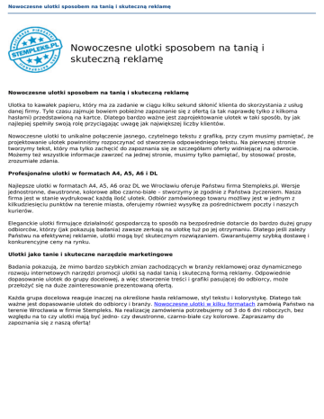 Nowoczesne ulotki sposobem na tanią i skuteczną reklamę Nowoczesne ulotki sposobem na tanią i skuteczną reklamę Nowoczesne ulotki sposobem na tanią i skuteczną reklamę Ulotka to kawałek papieru, który ma za zadanie w ciągu kilku sekund skłonić klienta do skorzystania z usług danej firmy. Tyle czasu zajmuje bowiem pobieżne zapoznanie się z ofertą (a tak naprawdę tylko z kilkoma hasłami) przedstawioną na kartce. Dlatego bardzo ważne jest zaprojektowanie ulotek w taki sposób, by jak najlepiej spełniły swoją rolę przyciągając uwagę jak największej liczby klientów. Nowoczesne ulotki to unikalne połączenie jasnego, czytelnego tekstu z grafiką, przy czym musimy pamiętać, że projektowanie ulotek powinniśmy rozpoczynać od stworzenia odpowiedniego tekstu. Na pierwszej stronie tworzymy tekst, który ma tylko zachęcić do zapoznania się ze szczegółami oferty widniejącej na odwrocie. Możemy też wszystkie informacje zawrzeć na jednej stronie, musimy tylko pamiętać, by stosować proste, zrozumiałe zdania. Profesjonalne ulotki w formatach A4, A5, A6 i DL Najlepsze ulotki w formatach A4, A5, A6 oraz DL we Wrocławiu oferuje Państwu firma Stempleks.pl. Wersje jednostronne, dwustronne, kolorowe albo czarno-białe – stworzymy je zgodnie z Państwa życzeniem. Nasza firma jest w stanie wydrukować każdą ilość ulotek. Odbiór zamówionego towaru możliwy jest w jednym z kilkudziesięciu punktów na terenie miasta, oferujemy również wysyłkę za pośrednictwem poczty i naszych kurierów. Eleganckie ulotki firmujące działalność gospodarczą to sposób na bezpośrednie dotarcie do bardzo dużej grupy odbiorców, którzy (jak pokazują badania) zawsze zerkają na ulotkę tuż po jej otrzymaniu. Dlatego jeśli zależy Państwu na efektywnej reklamie, ulotki mogą być skutecznym rozwiązaniem. Gwarantujemy szybką dostawę i konkurencyjne ceny na rynku. Ulotki jako tanie i skuteczne narzędzie marketingowe Badania pokazują, że mimo bardzo szybkich zmian zachodzących w branży reklamowej oraz dynamicznego rozwoju internetowych narzędzi promocji ulotki są nadal tanią i skuteczną formą reklamy. Odpowiednie dopasowanie ulotek do grupy docelowej, a więc stworzenie treści i grafiki pasującej do odbiorcy, może przełożyć się na duże zainteresowanie prezentowaną ofertą. Każda grupa docelowa reaguje inaczej na określone hasła reklamowe, styl tekstu i kolorystykę. Dlatego tak ważne jest dopasowanie ulotek do odbiorcy i branży. Nowoczesne ulotki w kilku formatach zamówią Państwo na terenie Wrocławia w firmie Stempleks. Na realizację zamówienia potrzebujemy od 3 do 6 dni roboczych, bez względu na to czy ulotki mają być jedno- czy dwustronne, czarno-białe czy kolorowe. Zapraszamy do zapoznania się z naszą ofertą! Powered by TCPDF (www.tcpdf.org)