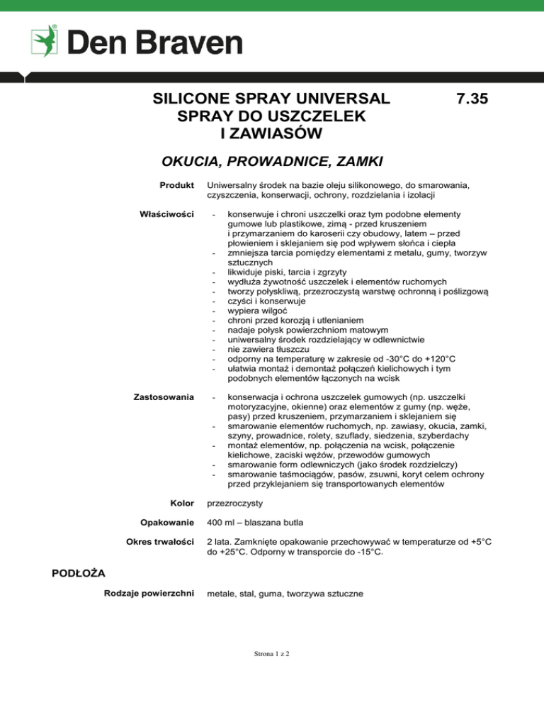 SILICONE SPRAY UNIVERSAL SPRAY DO USZCZELEK I ZAWIASÓW 7.35 OKUCIA, PROWADNICE, ZAMKI Produkt Właściwości Uniwersalny środek na bazie oleju silikonowego, do smarowania, czyszczenia, konserwacji, ochrony, rozdzielania i izolacji - - Zastosowania - - Kolor Opakowanie Okres trwałości konserwuje i chroni uszczelki oraz tym podobne elementy gumowe lub plastikowe, zimą - przed kruszeniem i przymarzaniem do karoserii czy obudowy, latem – przed płowieniem i sklejaniem się pod wpływem słońca i ciepła zmniejsza tarcia pomiędzy elementami z metalu, gumy, tworzyw sztucznych likwiduje piski, tarcia i zgrzyty wydłuża żywotność uszczelek i elementów ruchomych tworzy połyskliwą, przezroczystą warstwę ochronną i poślizgową czyści i konserwuje wypiera wilgoć chroni przed korozją i utlenianiem nadaje połysk powierzchniom matowym uniwersalny środek rozdzielający w odlewnictwie nie zawiera tłuszczu odporny na temperaturę w zakresie od -30°C do +120°C ułatwia montaż i demontaż połączeń kielichowych i tym podobnych elementów łączonych na wcisk konserwacja i ochrona uszczelek gumowych (np. uszczelki motoryzacyjne, okienne) oraz elementów z gumy (np. węże, pasy) przed kruszeniem, przymarzaniem i sklejaniem się smarowanie elementów ruchomych, np. zawiasy, okucia, zamki, szyny, prowadnice, rolety, szuflady, siedzenia, szyberdachy montaż elementów, np. połączenia na wcisk, połączenie kielichowe, zaciski wężów, przewodów gumowych smarowanie form odlewniczych (jako środek rozdzielczy) smarowanie taśmociągów, pasów, zsuwni, koryt celem ochrony przed przyklejaniem się transportowanych elementów przezroczysty 400 ml – blaszana butla 2 lata. Zamknięte opakowanie przechowywać w temperaturze od +5°C do +25°C. Odporny w transporcie do -15°C. PODŁOŻA Rodzaje powierzchni metale, stal, guma, tworzywa sztuczne Strona 1 z 2 SPOSÓB UŻYCIA Temperatura aplikacji Zalecenia Czyszczenie Ograniczenia Bezpieczeństwo od +5°C do +35°C Przed użyciem silnie wstrząsnąć. Spryskiwać z odległości 10-20 cm. Nadmiar usunąć suchą szmatką. Ręce myć wodą z mydłem. Do czyszczenia świeżych zabrudzeń z rąk, narzędzi czy powierzchni użyć specjalne ściereczki czyszczące Den Braven Bravo. Do starych zabrudzeń stosować benzynę ekstrakcyjną. Z uwagi na elektrostatyczny charakter środka, spryskane powierzchnie mogą lekko przyciągać kurz Patrz: Karta charakterystyki 7.35 UWAGA: Chronić przed dziećmi. Powyższe informacje są wynikiem badań i doświadczeń własnych Den Braven, co stanowi podstawę ich rzetelności oraz wiarygodności. Producent nie może przewidzieć wszystkich możliwych obszarów użycia swoich produktów. Ponadto sposób użycia produktów jest poza jego wiedzą i kontrolą. Dlatego użytkownik bierze na siebie odpowiedzialność za właściwy dobór i zastosowanie produktu do zamierzonego przez siebie użycia. Producent nie ponosi odpowiedzialności za jakiekolwiek straty powstałe na skutek nieprawidłowego, bądź błędnego użycia jego wyrobów. 25/05/2016 Strona 2 z 2