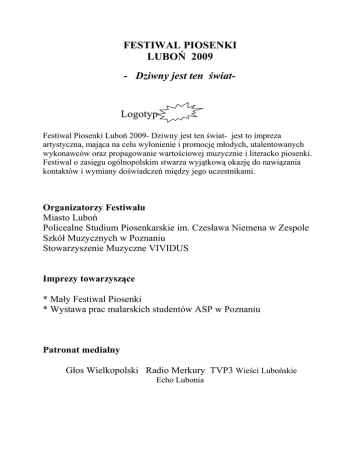 FESTIWAL PIOSENKI LUBOŃ 2009 - Dziwny jest ten świat- Logotyp Festiwal Piosenki Luboń 2009- Dziwny jest ten świat- jest to impreza artystyczna, mająca na celu wyłonienie i promocję młodych, utalentowanych wykonawców oraz propagowanie wartościowej muzycznie i literacko piosenki. Festiwal o zasięgu ogólnopolskim stwarza wyjątkową okazję do nawiązania kontaktów i wymiany doświadczeń między jego uczestnikami. Organizatorzy Festiwalu Miasto Luboń Policealne Studium Piosenkarskie im. Czesława Niemena w Zespole Szkół Muzycznych w Poznaniu Stowarzyszenie Muzyczne VIVIDUS Imprezy towarzyszące * Mały Festiwal Piosenki * Wystawa prac malarskich studentów ASP w Poznaniu Patronat medialny Głos Wielkopolski Radio Merkury TVP3 Wieści Lubońskie Echo Lubonia Regulamin Festiwalu 1. Do udziału w konkursie mogą zgłaszać się wykonawcy w wieku od 16 do 26 lat. Zainteresowani proszeni są o wypełnienie karty zgłoszenia i wysłanie jej wraz z płytą ,,demo” na adres organizatora: Urząd Miasta Luboń Pl. E. Bojanowskiego 2 62-030 Luboń z dopiskiem: FESTIWAL PIOSENKI LUBOŃ 2009 Termin nadsyłania zgłoszeń upływa z dniem 30. 04. 2009r. 2. W przypadku udziału w Festiwalu osób niepełnoletnich wymagana jest pisemna zgoda rodziców lub opiekunów prawnych. 3. Wykonawca zgłaszający udział w Festiwalu powinien przygotować dwie piosenki, w tym jedną z repertuaru Czesława Niemena. 4. Konkurs odbywa się w dwóch etapach. I Etap – eliminacje na podstawie: a) przesłuchań materiałów ,,demo” lub b) na podstawie prezentacji na żywo organizowanych w Zespole Szkół Muzycznych ul. Głogowska 90 w Poznaniu, dn. 10.05.2009r. godz.10.00. W ramach eliminacji do II-go etapu, organizator zastrzega sobie prawo do przeprowadzenia dodatkowych przesłuchań poza terminami wyznaczonymi w regulaminie. Rada Artystyczna na podstawie wyników przesłuchań podejmuje ostateczną decyzję o zakwalifikowaniu uczestnika do II-go etapu. Informacje o zakwalifikowaniu do II etapu będą podane zainteresowanym do dnia 20.05.2009r. Organizatorzy nie zwracają nadesłanych materiałów ,,demo”. II Etap 19.06.2009r.- przesłuchania, podczas których Rada Artystyczna dokonuje wyboru wykonawców Koncertu Finałowego. Wykonawcy zakwalifikowani do tego koncertu, zobowiązani są do wzięcia udziału w warsztatach artystycznych i próbach przygotowujących koncert. 20.06.2009r.- Koncert Finałowy 5. Nagrody Nagrody przyznaje Jury Festiwalu podczas Koncertu Finałowego w dniu 20.06. 2009r. I nagroda- 3000 zł. II nagroda- 2000 zł. III nagroda- 1000 zł. 6. Decyzje Rady Artystycznej i Jury są ostateczne na każdym etapie konkursu. 7. Uczestnicy zgłaszając swój udział w Festiwalu, zgadzają się powierzyć organizatorom prawo do wielokrotnej rejestracji i odtwarzania publicznego przedstawionej prezentacji artystycznej. 8. Spełnienie formalności związanych z wymogami prawa autorskiego bierze na siebie organizator. 9. W ramach Festiwalu Piosenki Luboń 2009 zostanie zorganizowany Mały Festiwal Piosenki dla młodzieży gimnazjalnej. Rada Artystyczna Festiwalu Dyr. Festiwalu – Antoni Urban- aktor, solista teatrów muzycznych; pedagog Policealnego Studium Piosenkarskiego im. Czesława Niemena w Poznaniu. Wojciech Michalski- dyr. Zespołu Szkół Muzycznych w Poznaniu. Ewa Świerkiel- kierownik Wydziału Kultury i Oświaty w Luboniu. Maciej Szymański- kompozytor, aranżer, dyrygent i szef zespołu Spirituals & Gospel Quartet. Magdalena Domek – wokalistka, absolwentka Policealnego Studium Piosenkarskiego im. Czesława Niemena w Poznaniu, pracownik Urzędu Miasta Luboń. Agnieszka Begier- kierownik Biura Organizacyjnego Festiwalu Piosenki Luboń 2009 Urząd Miasta Luboń PL. E. Bojanowskiego 2 62-030 Luboń www.lubon.pl tel. 061 813 00 11; tel.kom. 0697 630 979; e-mail: promocja @ lubon. pl.
