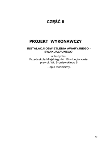 CZĘŚĆ II PROJEKT WYKONAWCZY INSTALACJI OŚWIETLENIA AWARYJNEGO EWAKUACYJNEGO w budynku Przedszkola Miejskiego Nr 10 w Legionowie przy ul. Wł. Broniewskiego 6 – opis techniczny. 13 PROJEKT WYKONAWCZY INSTALACJI OŚWIETLENIA AWARYJNEGO - EWAKUACYJNEGO w budynku Przedszkola Miejskiego Nr 10 w Legionowie przy ul. Wł. Broniewskiego 6 PROJEKT WYKONAWCZY Spis treści: 1 CZĘŚĆ OGÓLNA................................................................................................15 1.1 Przedmiot opracowania...............................................................................15 1.2 Zakres opracowania....................................................................................15 1.3 Przepisy i dokumenty związane...................................................................15 2 OŚWIETLENIE AWARYJNE - WYMAGANIA..........................................................15 3 OPIS TECHNICZNY PROJEKTOWANEJ INSTALACJI.............................................16 3.1 Zakres ochrony.........................................................................................16 3.2 Dobór i rozmieszczenie lamp.......................................................................16 3.3 Prowadzenie linii kablowych........................................................................16 3.4 Okablowanie..............................................................................................16 4 WSKAZÓWKI MONTAŻOWE..............................................................................16 4.1 Lampy.......................................................................................................16 4.2 Uwagi dodatkowe.......................................................................................16 5 UWAGI KOŃCOWE...........................................................................................17 5.1 Dokumentacja............................................................................................17 5.2 Szkolenie ..................................................................................................17 5.3 Konserwacja .............................................................................................17 5.4 Odbiór.......................................................................................................17 KSIĄŻKA PRACY.................................................................................18 INSTALACJI OŚWIETLENIA AWARYJNEGO...........................................18 KSIĄŻKA PRACY.................................................................................19 INSTALACJI OŚWIETLENIA AWARYJNEGO TABELA WPISÓW................19 14 1 1.1 CZĘŚĆ OGÓLNA Przedmiot opracowania Przedmiotem opracowania jest projekt wykonawczy instalacji oświetlenia awaryjnego w budynku Przedszkola Miejskiego Nr 10 w Legionowie przy ul. Wł. Broniewskiego 6. 1.2 Zakres opracowania Przedmiot opracowania stanowi projekt wykonawczy ( techniczny ) instalacji oświetlenia awaryjnego. 1.3 Przepisy i dokumenty związane [1] Ustawa o ochronie przeciwpożarowej z dnia 24 sierpnia 1991 r. (tekst jednolity: Dz. U. z 2002r. Nr 147, poz. 1229, z późniejszymi zmianami). [2] Rozporządzenie Ministra Spraw Wewnętrznych i Administracji z dnia 7 czerwca 2010 r. w sprawie ochrony przeciwpożarowej budynków, innych obiektów budowlanych i terenów (Dz. U. Nr 109, poz. 719). [3] Rozporządzenie Ministra Infrastruktury z dnia 12 kwietnia 2002 . w sprawie warunków technicznych, jakim powinny odpowiadać budynki i ich usytuowanie(Dz. U. Nr 75, poz. 690, z późniejszymi zmianami). [4] PN-76/E–05125 Elektroenergetyczne i sygnalizacyjne linie kablowe. Projektowanie i budowa. [5] BN –84/8984-10 Instalacje wnętrzowe. Ogólne wymagania. [6] BN-88/8984-17/03 Telekomunikacyjne sieci miejscowe. Linie kablowe. Ogólne wymagania i badania. 2 OŚWIETLENIE AWARYJNE - WYMAGANIA Budynki i obiekty budowlane, a przede wszystkim obiekty użyteczności publicznej, muszą być wyposażone w urządzenie przeciwpożarowe. Na podstawie Rozporządzenie Ministra Spraw Wewnętrznych i Administracji [2] instalacje oświetlenia awaryjnego są urządzeniami przeciwpożarowymi. Zgodnie z tym rozporządzeniem wszystkie urządzenia przeciwpożarowe powinny być poddawane przeglądom technicznym i czynnościom konserwacyjnym nie rzadziej niż raz w roku i muszą spełniać wymagania Polskich Norm. Instalacje oświetlenia awaryjnego związane są bezpośrednio z bezpieczeństwem ludzi co powoduje, że ich parametry techniczne, a przede wszystkim niezawodność, obwarowane są wieloma powiązanymi ze sobą normami. Dotyczy to zarówno przepisów określających ich własności funkcjonalne jak i parametry oświetleniowe czy elektryczne. W Polsce aktualnie najważniejszą normą dotyczącą oświetlenia awaryjnego jest PN EN 1838 „Stosowanie oświetlenia – oświetlenie awaryjne”. Norma ta jest tłumaczeniem normy EN 1838, która obowiązuje we wszystkich krajach członkowskich Unii Europejskiej. Wymagania zawarte w tej normie określają wartości minimalne, które muszą spełniać systemy oświetlenia awaryjnego. w poszczególnych krajach mogą istnieć obowiązujące przepisy zaostrzające wymagania normy EN 1838. Norma EN 1838 odwołuje się do innych norm, jak np. do EN 60598 – 2 – 22 dotyczącej opraw oświetleni awaryjnego, czy EN 50172 określającej instalację oświetlenia ewakuacyjnego. Normy te również zostały przetłumaczone na język polski i zatwierdzone przez Polski Komitet Normalizacyjny. W związku z tym obowiązuje obecnie wymóg normy PN EN 60598 – 2 –22 „Oprawy oświetlenia awaryjnego” dotyczący układów testujących do opraw awaryjnych, który mówi, że oprawy oświetlenia awaryjnego z własnym źródłem zasilania powinny być wyposażone w wewnętrzny układ testujący lub być podłączone do zdalnego układu testującego (część 2, dział 22). Na podstawie aktualnie obowiązujących przepisów i norm można sporz