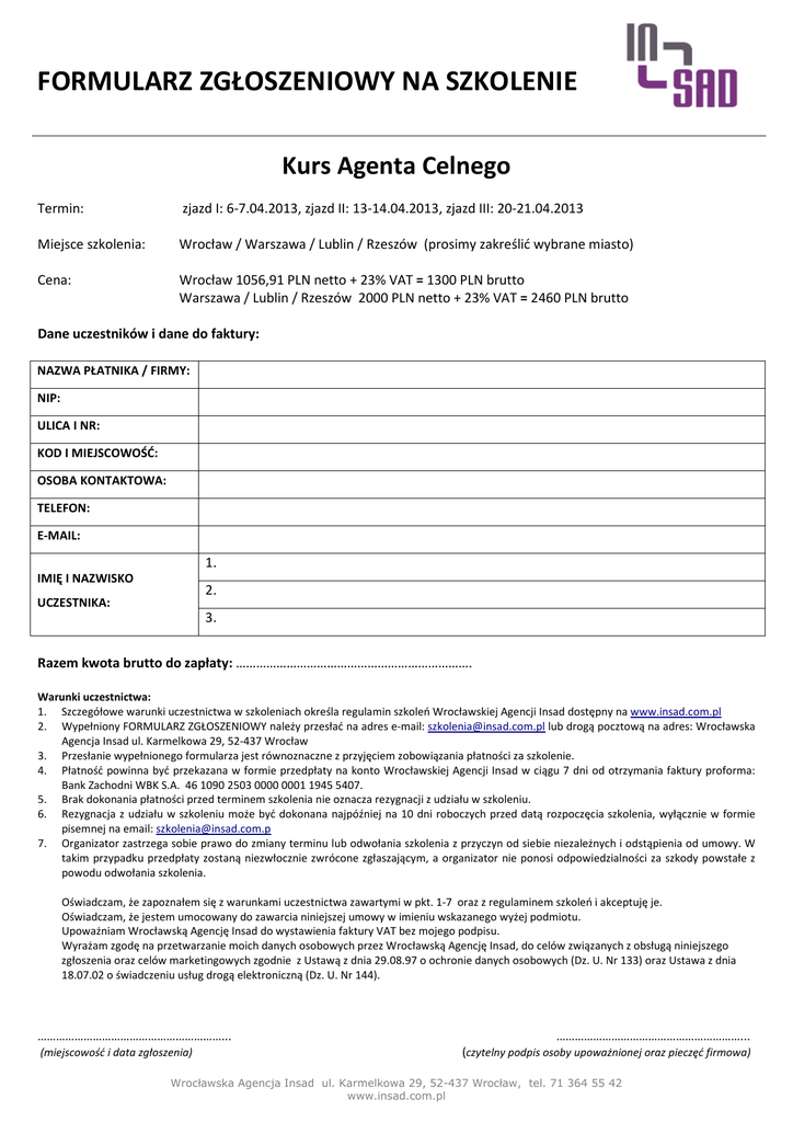 FORMULARZ ZGŁOSZENIOWY NA SZKOLENIE Kurs Agenta Celnego Termin: zjazd I: 6-7.04.2013, zjazd II: 13-14.04.2013, zjazd III: 20-21.04.2013 Miejsce szkolenia: Wrocław / Warszawa / Lublin / Rzeszów (prosimy zakreślić wybrane miasto) Cena: Wrocław 1056,91 PLN netto + 23% VAT = 1300 PLN brutto Warszawa / Lublin / Rzeszów 2000 PLN netto + 23% VAT = 2460 PLN brutto Dane uczestników i dane do faktury: NAZWA PŁATNIKA / FIRMY: NIP: ULICA I NR: KOD I MIEJSCOWOŚĆ: OSOBA KONTAKTOWA: TELEFON: E-MAIL: 1. IMIĘ I NAZWISKO 2. UCZESTNIKA: 3. Razem kwota brutto do zapłaty: ……………………………………………………………. Warunki uczestnictwa: 1. Szczegółowe warunki uczestnictwa w szkoleniach określa regulamin szkoleń Wrocławskiej Agencji Insad dostępny na www.insad.com.pl 2. Wypełniony FORMULARZ ZGŁOSZENIOWY należy przesłać na adres e-mail: [email protected] lub drogą pocztową na adres: Wrocławska Agencja Insad ul. Karmelkowa 29, 52-437 Wrocław 3. Przesłanie wypełnionego formularza jest równoznaczne z przyjęciem zobowiązania płatności za szkolenie. 4. Płatność powinna być przekazana w formie przedpłaty na konto Wrocławskiej Agencji Insad w ciągu 7 dni od otrzymania faktury proforma: Bank Zachodni WBK S.A. 46 1090 2503 0000 0001 1945 5407. 5. Brak dokonania płatności przed terminem szkolenia nie oznacza rezygnacji z udziału w szkoleniu. 6. Rezygnacja z udziału w szkoleniu może być dokonana najpóźniej na 10 dni roboczych przed datą rozpoczęcia szkolenia, wyłącznie w formie pisemnej na email: [email protected] 7. Organizator zastrzega sobie prawo do zmiany terminu lub odwołania szkolenia z przyczyn od siebie niezależnych i odstąpienia od umowy. W takim przypadku przedpłaty zostaną niezwłocznie zwrócone zgłaszającym, a organizator nie ponosi odpowiedzialności za szkody powstałe z powodu odwołania szkolenia. Oświadczam, że zapoznałem się z warunkami uczestnictwa zawartymi w pkt. 1-7 oraz z regulaminem szkoleń i akceptuję je. Oświadczam, że jestem umocowany do zawarcia niniejszej umowy w imieniu wskazanego wyżej podmiotu. Upoważniam Wrocławską Agencję Insad do wystawienia faktury VAT bez mojego podpisu. Wyrażam zgodę na przetwarzanie moich danych osobowych przez Wrocławską Agencję Insad, do celów związanych z obsługą niniejszego zgłoszenia oraz celów marketingowych zgodnie z Ustawą z dnia 29.08.97 o ochronie danych osobowych (Dz. U. Nr 133) oraz Ustawa z dnia 18.07.02 o świadczeniu usług drogą elektroniczną (Dz. U. Nr 144). ……………………………………………………... (miejscowość i data zgłoszenia) ……………………………………………………... (czytelny podpis osoby upoważnionej oraz pieczęć firmowa) Wrocławska Agencja Insad ul. Karmelkowa 29, 52-437 Wrocław, tel. 71 364 55 42 www.insad.com.pl