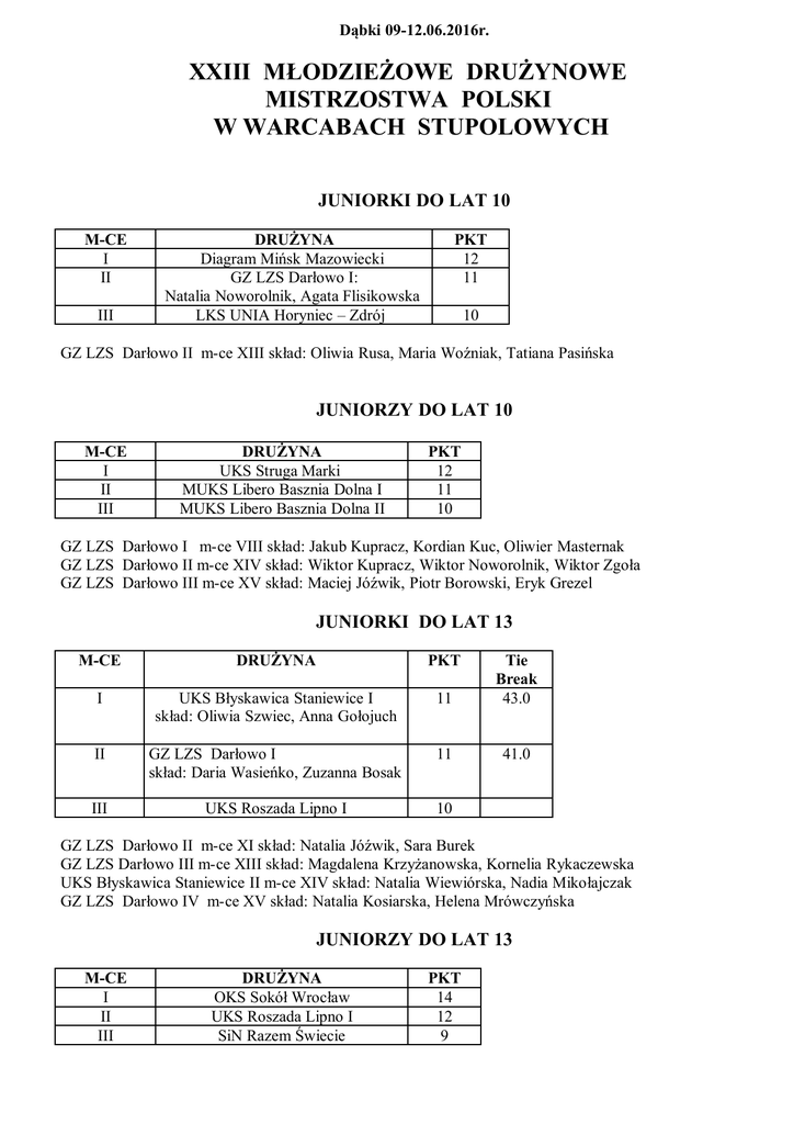 Dąbki 09-12.06.2016r. XXIII MŁODZIEŻOWE DRUŻYNOWE MISTRZOSTWA POLSKI W WARCABACH STUPOLOWYCH JUNIORKI DO LAT 10 M-CE I II III DRUŻYNA Diagram Mińsk Mazowiecki GZ LZS Darłowo I: Natalia Noworolnik, Agata Flisikowska LKS UNIA Horyniec – Zdrój PKT 12 11 10 GZ LZS Darłowo II m-ce XIII skład: Oliwia Rusa, Maria Woźniak, Tatiana Pasińska JUNIORZY DO LAT 10 M-CE I II III DRUŻYNA UKS Struga Marki MUKS Libero Basznia Dolna I MUKS Libero Basznia Dolna II PKT 12 11 10 GZ LZS Darłowo I m-ce VIII skład: Jakub Kupracz, Kordian Kuc, Oliwier Masternak GZ LZS Darłowo II m-ce XIV skład: Wiktor Kupracz, Wiktor Noworolnik, Wiktor Zgoła GZ LZS Darłowo III m-ce XV skład: Maciej Jóźwik, Piotr Borowski, Eryk Grezel JUNIORKI DO LAT 13 M-CE DRUŻYNA PKT I UKS Błyskawica Staniewice I skład: Oliwia Szwiec, Anna Gołojuch 11 Tie Break 43.0 II GZ LZS Darłowo I skład: Daria Wasieńko, Zuzanna Bosak 11 41.0 III UKS Roszada Lipno I 10 GZ LZS Darłowo II m-ce XI skład: Natalia Jóźwik, Sara Burek GZ LZS Darłowo III m-ce XIII skład: Magdalena Krzyżanowska, Kornelia Rykaczewska UKS Błyskawica Staniewice II m-ce XIV skład: Natalia Wiewiórska, Nadia Mikołajczak GZ LZS Darłowo IV m-ce XV skład: Natalia Kosiarska, Helena Mrówczyńska JUNIORZY DO LAT 13 M-CE I II III DRUŻYNA OKS Sokół Wrocław UKS Roszada Lipno I SiN Razem Świecie PKT 14 12 9 UKS Błyskawica Staniewice II m-ce XIV skład: Dominik Girko, Marcel Skrobek, Natalia Skotarczak JUNIORKI DO LAT 16 M-CE I II III DRUŻYNA UKS Struga Marki LKS UNIA Horyniec – Zdrój UKS Roszada Lipno PKT 7 4 1 JUNIORZY DO LAT 16 M-CE I II III DRUŻYNA LWKS Złote Piony Bielawa UKS Roszada Lipno GZ LZS Darłowo Skład: Kamil Kowalski, Gracjan Masternak, Bartosz Papierz, Aleksander Grębski PKT 6 6 1 PKT MAŁE 18 17 1 JUNIORKI DO LAT 19 M-CE I II III DRUŻYNA GZ LZS Darłowo : Skład: Karolina Babiak, Daria Babiak, Karolina Kołodziej OKS Sokół Wrocław LUKS Gry Logiczne Wronki PKT 7 PKT MAŁE 12 5 1 10 2 JUNIORZY DO LAT 19 M-CE I II III DRUŻYNA LKS Olymp Błonie UKS Lokator Gniezno UKS Struga Marki Turniej Plażowy: 1. 2. 3. Szymon Morzy - Jeziorany Daniel Skowronek – Jeżyczki Mateusz Piątek – Horyniec Zdrój PKT 9 7 7 PKT MAŁE 23 19 16