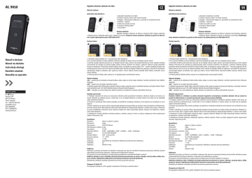 AL 9010 Digitální detektor alkoholu AL 9010 CZ Návod k obsluze Jednotlivé části detektoru Digitální detektor alkoholu AL 9010 Jednotlivé časti detektora 1. Náustek k detektoru AL 9010 2. Trubice vzduchu dechu. Zde vložte náustek 3. Displej – zobrazované údaje jsou v promile na 3 desetinná čísla 4. Tlačítko – zapnutí 5. Úchyt pro poutko na ruku 6. Vstup pro datový kabel 7. Kryt baterií Návod k obsluze Návod na obsluhu Instrukcja obsługi Kezelési utasítás Navodila za uporabo Import, servis: V - NET s.r.o. Šumice 139 687 31 Šumice Czech republic tel.: +420 572 639 076 [email protected] IČO: 26966034, DIČ: CZ26966034 www.promile.cz SK Návod na obsluhu 1. Náustok k detektoru AL 9010 2. Trubica vzduchu dychu. Tu vložte náustok 3. Displej – zobrazované údaje sú v promilách na 3 desatinné čísla 4. Tlačítko – zapnutie 5. Úchyt pre pútko na ruku 6. Vstup pre datový kábel 7. Kryt batérií Detekce alkoholu Digitální detektor alkoholu AL 9010 je schopný měřit hladinu alkoholu v lidském dechu. Výsledky měření jsou udávány v promile. Předností tohoto detektoru alkoholu je paměť na 500 měření a jejich zpětný přenos přes USB kabel do PC. Detekcia alkoholu Digitálny detektor alkoholu AL 9010 je schopný merať hladinu alkoholu v ľudskom dychu. Výsledky merania sú udávané v promilách. Prednosťou tohto detektora alkoholu je pamäť na 500 meraní a ich spätný prenos cez USB kábel do PC. Postup měření Postup merania 1. Stiskněte krátce tlačítko (4) – viz jednotlivé části detektoru. 2. Po uvolnění tlačítka se začne detektor zahřívat, vyčkejte do doby, než se na displeji zobrazí „blow“ 3. Jakmile uslyšíte pípnutí (zároveň se na displeji zobrazí nápis „blow“), tak bezprostředně po tomto signálu foukejte rovnoměrně do náustku (1) dokud budete slyšet zvukové znamení. Po dvojím „cvaknutí“ tlakové pumpy přestaňte foukat do detektoru. Pokud jste foukali krátkou dobu, na displeji se zobrazí nápis „Flo“ – měření opakujte. Jestliže jste foukali správně, tak se asi za 15 sekund výsledek testu zobrazí na displeji. Údaje jsou udávány v promile. Po zobrazení naměřených údajů se detektor sám vypne po době 4 minut. Pokud chcete provádět další měření, stiskněte znovu krátce tlačítko. 4. Pokud podržíte tlačítko déle, zobrazí se na displeji počet naměřených hodnot. 1. Stlačte krátko tlačítko (4) – viď jednotlivé časti detektora. 2. Po uvolnení tlačítka sa začne detektor zahrievať, počkajte do doby, než sa na displeji zobrazí „blow“ 3. Akonáhle budete počuť pípnutie (zároveň sa na displeji zobrazí nápis „blow“), tak bezprostredne po tomto signáli fúkajte rovnomerne do náustku (1) pokiaľ budete počuť zvukové znamenie. Po dvojitom „cvaknutí“ tlakovej pumpy prestaňte fúkať do detektora. Pokiaľ ste fúkali krátku dobu, na displeji sa zobrazí nápis „Flo“ – meranie opakujte. Ak ste fúkali správne, tak sa asi za 15 sekúnd výsledok testu zobrazí na displeji. Údaje sú udávané v promilách.Po zobrazení nameraných údajov sa detektor sám vypne po dobe 4 minút. Pokiaľ chcete vykonávať ďalšie meranie, stlačte znova krátko tlačítko. 4. Pokiaľ podržíte tlačítko dlhšie, zobrazí sa na displeji počet nameraných hodnôt. Hlášení displeje „Flo“ – pokud jste do detektoru foukali krátkou dobu, objeví se tento nápis. Detektor nemůže vyhodnotit test. Měření opakujte. „bat“ – baterie jsou již slabé. Vyměňte baterie (! důležité upozornění! Slabé nebo nekvalitní baterie mohou výrazně ovlivnit naměřené hodnoty a zkreslují měření! Používejte výhradně nové 1,5V „AAA“ alkalické baterie Duracell nebo Energizer.) „CAL“ – detektor je nutné zkalibrovat. Zašlete detektor ke kalibraci na adresu výhradního dovozce. Hlásenie displeja „Flo“ – pokiaľ ste do detektora fúkali krátku dobu, objaví sa tento nápis. Detektor nemôže vyhodnotiť test. Meranie opakujte. „bat“ – batérie sú už slabé. Vymeňte batérie (! dôležité upozornenie! Slabé alebo nekvalitné batérie môžu výrazne ovplyvniť namerané hodnoty a skreslujú meranie! Používajte výhradne nové 1,5V „AAA“ alkalické batérie Duracell alebo Energizer.) „CAL“ – detektor je nutné skalibrovať. Zašlite detektor ku kalibrácií na adresu výhradného dovozcu. Důležitá upozornění 1. Počkejte nejméně 20 minut po konzumaci alkoholu před používáním detektoru alkoholu. Budete mít jistotu, že vzorek alkoholu je odebrán pouze z vašich plic a ne ze zbytků alkoholu ve vašich ústech, což může mít za následek vyšší naměřené hodnoty. 2. Protože se potřebuje čidlo zahřát, počkejte, až proběhne inicializace detektoru asi 8 sekund- po inicializaci se ozve pípnutí. 3. Čidlo v detektoru je vysoce citlivé, nepoužívejte detektor bezprostředně po kouření nebo pití alkoholu. Počkejte alespoň dvě minuty. Kouř nebo alkohol může zničit čidlo detektoru. Nepoužívejte detektor v silném větru nebo v místnosti se silně znečištěným vzduchem (kouř, alkohol). Nelijte ani nijak nevpravujte žádnou tekutinu do detektoru, můžete zničit čidlo detektoru. 4. Všeobecně snímače alkoholu ovlivňuje teplota a vlhkost vzduchu. Proto se můžou vyskytnout mírné nepřesnosti měření. Tolerance je 5%. Dôležité upozornenie Detektor AL9010 je s ohľadom na platnú slovenskú legislatívu orientačným meradlom alkoholu. Nie je možné ho použiť na dokazovanie a z merania vyvodzovať napr.pracovno-právne dôsledky. 1. Počkajte najmenej 20 minút po konzumácií alkoholu pred používaním detektora alkoholu. Budete mať istotu, že vzorka alkoholu je odobraná ibae z vašich pľúc a nie zo zbytkov alkoholu vo vašich ústach, čo môže mať za následok vyššie namerané hodnoty. 2. Pr