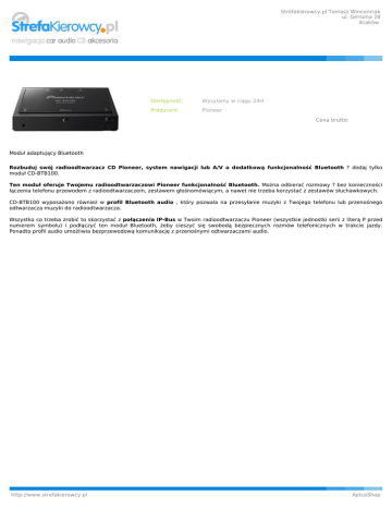 Strefakierowcy.pl Tomasz Wincenciak ul. Gersona 28 Kraków Dostępność: Wysyłamy w ciągu 24H Producent: Pioneer Cena brutto: Moduł adaptujący Bluetooth Rozbuduj swój radioodtwarzacz CD Pioneer, system nawigacji lub A/V o dodatkową funkcjonalność Bluetooth ? dodaj tylko moduł CD-BTB100. Ten moduł oferuje Twojemu radioodtwarzaczowi Pioneer funkcjonalność Bluetooth. Można odbierać rozmowy ? bez konieczności łączenia telefonu przewodem z radioodtwarzaczem, zestawem głośnomówiącym, a nawet nie trzeba korzystać z zestawów słuchawkowych. CD-BTB100 wyposażono również w profil Bluetooth audio , który pozwala na przesyłanie muzyki z Twojego telefonu lub przenośnego odtwarzacza muzyki do radioodtwarzacza. Wszystko co trzeba zrobić to skorzystać z połączenia IP-Bus w Twoim radioodtwarzaczu Pioneer (wszystkie jednostki serii z literą P przed numerem symbolu) i podłączyć ten moduł Bluetooth, żeby cieszyć się swobodą bezpiecznych rozmów telefonicznych w trakcie jazdy. Ponadto profil audio umożliwia bezprzewodową komunikację z przenośnymi odtwarzaczami audio. http://www.strefakierowcy.pl AptusShop