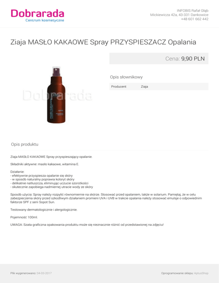 INFOBIS Rafał Głąb Mickiewicza 42a, 43-331 Dankowice +48 601 662 442 Ziaja MASŁO KAKAOWE Spray PRZYSPIESZACZ Opalania Cena: 9,90 PLN Opis słownikowy Producent Ziaja Opis produktu Ziaja MASŁO KAKAOWE Spray przyspieszający opalanie. Składniki aktywne: masło kakaowe, witamina E. Działanie: - efektywnie przyspiesza opalanie się skóry - w sposób naturalny poprawia koloryt skóry - delikatnie natłuszcza, eliminując uczucie szorstkości - skutecznie zapobiega nadmiernej utracie wody ze skóry Sposób użycia: Spray należy rozpylić równomiernie na skórze. Stosować przed opalaniem, także w solarium. Pamiętaj, że w celu zabezpieczenia skóry przed szkodliwym działaniem promieni UVA i UVB w trakcie opalania należy stosować emulsje o odpowiednim faktorze SPF z serii Sopot Sun. Testowany dermatologicznie i alergologicznie. Pojemność 100ml. UWAGA: Szata graficzna opakowania produktu może się nieznacznie różnić od przedstawionej na zdjęciu! Plik wygenerowano: 04-03-2017 Oprogramowanie sklepu: AptusShop INFOBIS Rafał Głąb Mickiewicza 42a, 43-331 Dankowice +48 601 662 442 Galeria Plik wygenerowano: 04-03-2017 Powered by TCPDF (www.tcpdf.org) Oprogramowanie sklepu: AptusShop