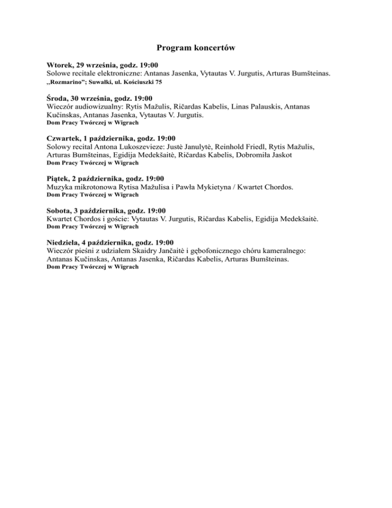 Program koncertów Wtorek, 29 września, godz. 19:00 Solowe recitale elektroniczne: Antanas Jasenka, Vytautas V. Jurgutis, Arturas Bumšteinas. „Rozmarino”; Suwałki, ul. Kościuszki 75 Środa, 30 września, godz. 19:00 Wieczór audiowizualny: Rytis Mažulis, Ričardas Kabelis, Linas Palauskis, Antanas Kučinskas, Antanas Jasenka, Vytautas V. Jurgutis. Dom Pracy Twórczej w Wigrach Czwartek, 1 października, godz. 19:00 Solowy recital Antona Lukoszevieze: Just÷ Janulyt÷, Reinhold Friedl, Rytis Mažulis, Arturas Bumšteinas, Egidija Medekšait÷, Ričardas Kabelis, Dobromiła Jaskot Dom Pracy Twórczej w Wigrach Piątek, 2 października, godz. 19:00 Muzyka mikrotonowa Rytisa Mažulisa i Pawła Mykietyna / Kwartet Chordos. Dom Pracy Twórczej w Wigrach Sobota, 3 października, godz. 19:00 Kwartet Chordos i goście: Vytautas V. Jurgutis, Ričardas Kabelis, Egidija Medekšait÷. Dom Pracy Twórczej w Wigrach Niedziela, 4 października, godz. 19:00 Wieczór pieśni z udziałem Skaidry Jančait÷ i gębofonicznego chóru kameralnego: Antanas Kučinskas, Antanas Jasenka, Ričardas Kabelis, Arturas Bumšteinas. Dom Pracy Twórczej w Wigrach