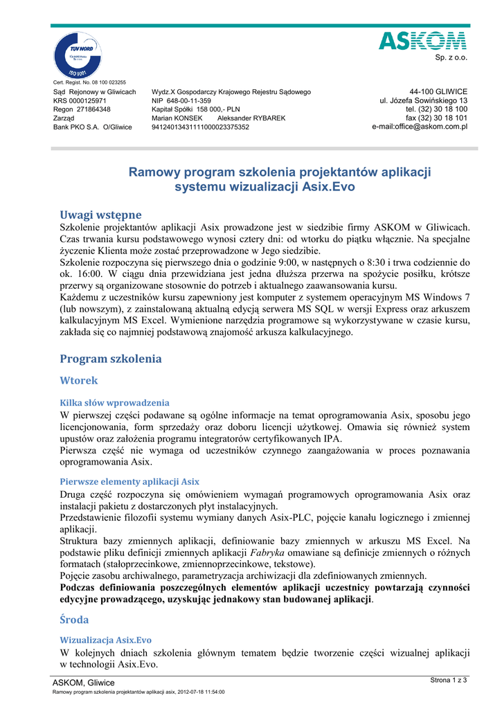 Sp. z o.o. Cert. Regist. No. 08 100 023255 Sąd Rejonowy w Gliwicach KRS 0000125971 Regon 271864348 Zarząd Bank PKO S.A. O/Gliwice Wydz.X Gospodarczy Krajowego Rejestru Sądowego NIP 648-00-11-359 Kapitał Spółki 158 000,- PLN Marian KONSEK Aleksander RYBAREK 94124013431111000023375352 44-100 GLIWICE ul. Józefa Sowińskiego 13 tel. (32) 30 18 100 fax (32) 30 18 101 e-mail:[email protected] Ramowy program szkolenia projektantów aplikacji systemu wizualizacji Asix.Evo Uwagi wstępne Szkolenie projektantów aplikacji Asix prowadzone jest w siedzibie firmy ASKOM w Gliwicach. Czas trwania kursu podstawowego wynosi cztery dni: od wtorku do piątku włącznie. Na specjalne życzenie Klienta może zostać przeprowadzone w Jego siedzibie. Szkolenie rozpoczyna się pierwszego dnia o godzinie 9:00, w następnych o 8:30 i trwa codziennie do ok. 16:00. W ciągu dnia przewidziana jest jedna dłuższa przerwa na spożycie posiłku, krótsze przerwy są organizowane stosownie do potrzeb i aktualnego zaawansowania kursu. Każdemu z uczestników kursu zapewniony jest komputer z systemem operacyjnym MS Windows 7 (lub nowszym), z zainstalowaną aktualną edycją serwera MS SQL w wersji Express oraz arkuszem kalkulacyjnym MS Excel. Wymienione narzędzia programowe są wykorzystywane w czasie kursu, zakłada się co najmniej podstawową znajomość arkusza kalkulacyjnego. Program szkolenia Wtorek Kilka słów wprowadzenia W pierwszej części podawane są ogólne informacje na temat oprogramowania Asix, sposobu jego licencjonowania, form sprzedaży oraz doboru licencji użytkowej. Omawia się również system upustów oraz założenia programu integratorów certyfikowanych IPA. Pierwsza część nie wymaga od uczestników czynnego zaangażowania w proces poznawania oprogramowania Asix. Pierwsze elementy aplikacji Asix Druga część rozpoczyna się omówieniem wymagań programowych oprogramowania Asix oraz instalacji pakietu z dostarczonych płyt instalacyjnych. Przedstawienie filozofii systemu wymiany danych Asix-PLC, pojęcie kanału logicznego i zmiennej aplikacji. Struktura bazy zmiennych aplikacji, definiowanie bazy zmiennych w arkuszu MS Excel. Na podstawie pliku definicji zmiennych aplikacji Fabryka omawiane są definicje zmiennych o różnych formatach (stałoprzecinkowe, zmiennoprzecinkowe, tekstowe). Pojęcie zasobu archiwalnego, parametryzacja archiwizacji dla zdefiniowanych zmiennych. Podczas definiowania poszczególnych elementów aplikacji uczestnicy powtarzają czynności edycyjne prowadzącego, uzyskując jednakowy stan budowanej aplikacji. Środa Wizualizacja Asix.Evo W kolejnych dniach szkolenia głównym tematem będzie tworzenie części wizualnej aplikacji w technologii Asix.Evo. ASKOM, Gliwice Ramowy program szkolenia projektantów aplikacji asix, 2012-07-18 11:54:00 Strona 1 z 3 Utworzenie aplikacji od podstaw przy pomocy kreatora W tym punkcie zostanie pokazane jak utworzyć nową aplikację od zera oraz przy pomocy kreatora. W trakcie tego procesu zostanie zbudowana baza zmiennych oraz zdefiniowane kanały komunikacyjne i archiwa. Omówienie nowego środowiska projektowego oraz podstawowych elementów aplikacji (okno, panel, diagram). Omówienie układu i przeznaczenia kartotek projektu. Tworzenie pierwszych elementów graficznych W tym punkcie pokazany zostanie proces projektowania diagramów wizualizacyjnych. Utworzenie diagramu oraz omówienie jego parametrów podstawowych. Umieszczenie na diagramie podstawowych obiektów typu Tekst i Obraz, omówienie ich podstawowych własności. Operacje edycyjne na obiektach (wyrównanie, nałożenie, grupowanie etc.). Dodanie do diagramu obiektów wyświetlających wielkości analogowe: Miernik, Tekst. Użycie panelu podglądu zmiennych do kontroli stanu zmiennych. Uruchamianie aplikacji Uruchomienie całej aplikacji lub pojedynczego diagramu w trybie testowym (podglądu). Utworzenie skrótu do startowania aplikacji z poziomu systemu operacyjnego, uruchomienie aplikacji z tego skrótu. Omówienie trybów pracy programu. Techniki tworzenia aplikacji cz.1 Definiowanie i używanie stałych napisowych dla aplikacji wielojęzycznych. Parametryzacja obiektów pod kątem przekroczenia limitów. Właściwości stanowe, zdarzenia. Formatowanie wyświetlanych wartości liczbowych. Użycie funkcji do sparametryzowania właściwości stanowych. Parametryzacja obiektów z użyciem prefiksów (~, #,&,@,%,!,=,^). Definiowanie właściwości diagramu. Zastosowanie parametrów diagramu. Utworzenie grupy obiektów i na jej podstawie wzorca obiektu. Użycie wzorca w definiowaniu diagramu, automatyczne aktualizowanie wzorców. Zdefiniowanie obiektu Wykres wraz z obiektem Kontroler Wykresu. Powiązanie kontrolera z grupą wykresów na diagramie. Uruchomienie aplikacji na przeglądarce Omówienie funkcji publikacji aplikacji na serwerze WWW. Czwartek Wizualizacja Asix.Evo cd. Kolejny dzień szkolenia będzie w dalszym ciągu dotyczył procesu konfigurowania aplikacji. Przegląd i omówienie obiektów, funkcji i akcji operatorskich. Omówienie wszystkich obiektów wizualizacyjnych i ich parametryzacji. Omówienie najważniejszych funkcji stosowanych w systemie wyrażeń. Omówienie najważniejszych akcji operatorskich i ich parametrów. Techniki tworzenia aplikacji cz.2 Omówienie sterowania natychmiastowego lub z potwierdzeniem na przykładach obiektów Tekst, Przycisk oraz Suwak. Omówienie różnych trybów pracy obiektu przycisk (jako przełącznik). Animacje rurociągów, taśmociągów oraz położenia i rozmiarów obiektów z wykorzystaniem zmiennej Counter. ASKOM, Gliwice Ramowy program szkolenia projektantów aplikacji asix, 2012-07-18 11:54:00 Strona 2 z 3 Przeźroczystość okien i obiektów. Definiowanie i wykorzystanie przebiegów wzorcowych. Parametryzacja systemu zabezpieczeń Omówienie system zabezpieczeń aplikacji, definiowanie użytkowników, ról i uprawnień. Kontrola uprawnień na diagramach. Konfiguracje wielostanowiskowe Definiowanie st